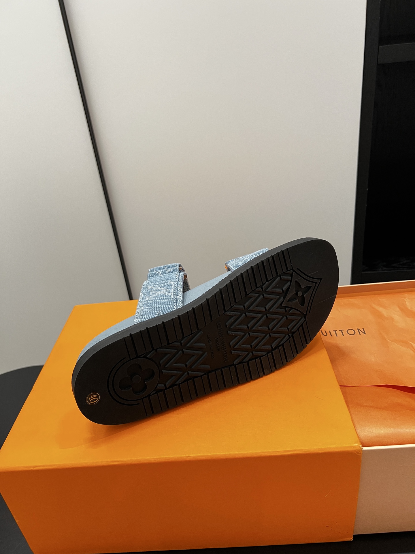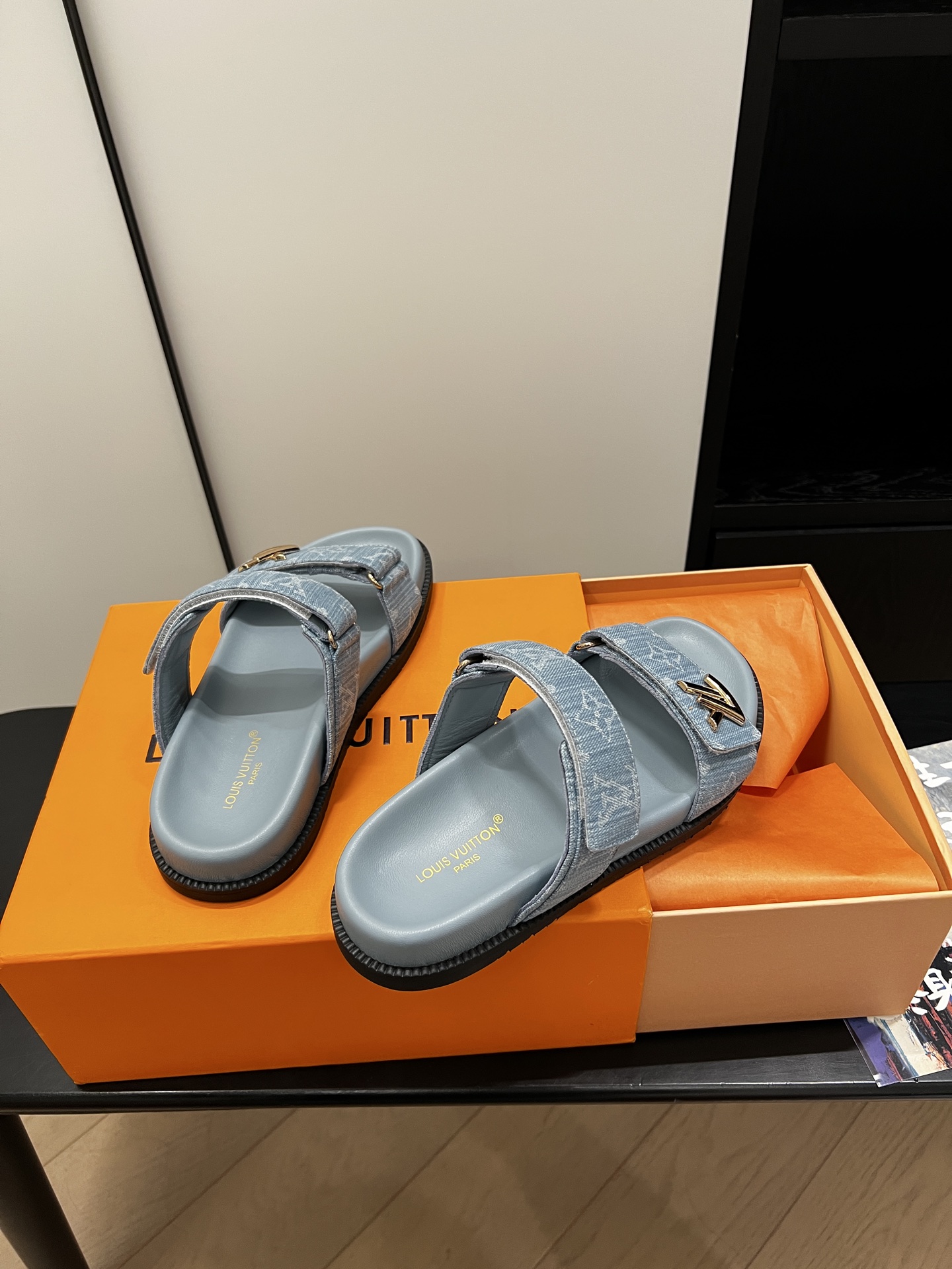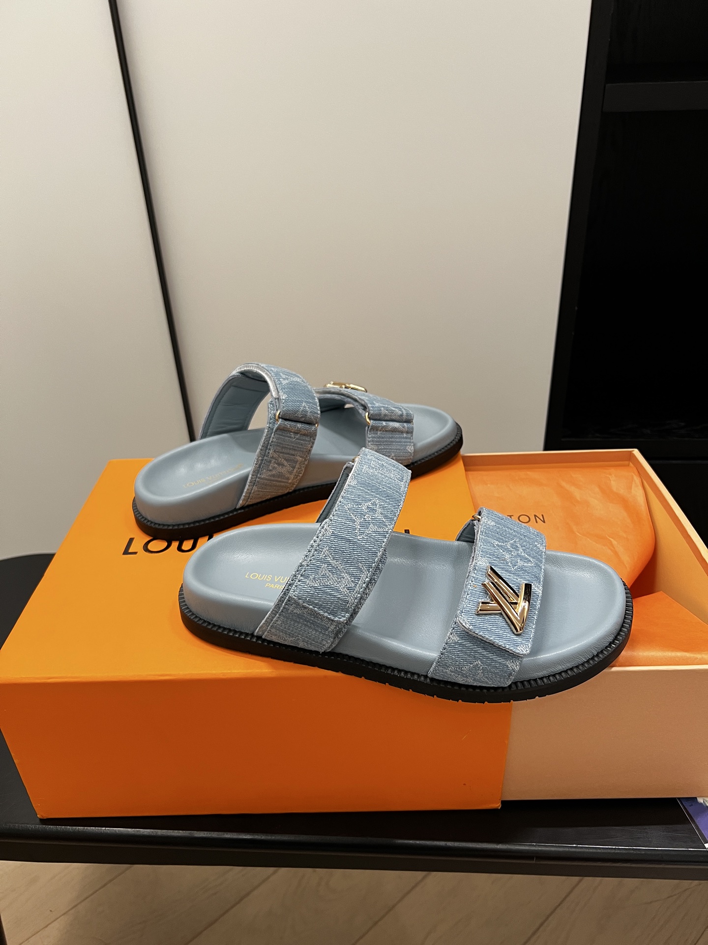 Stylish Louis Vuitton sandals crafted in soft blue denim fabric