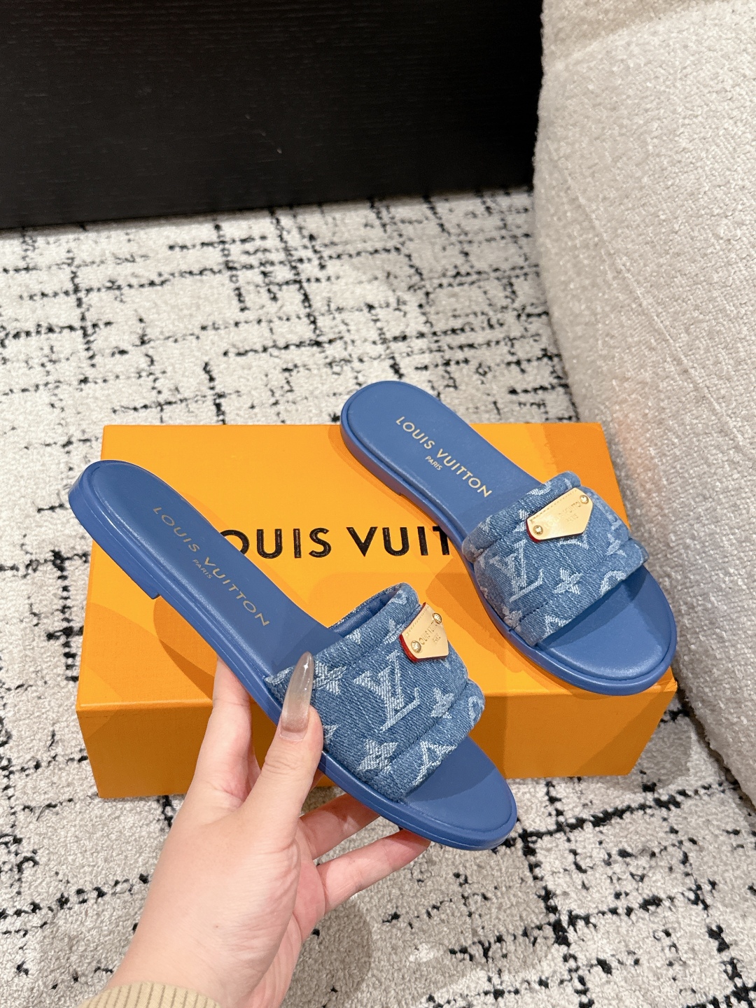 Louis Vuitton Men’s Blue Denim Sandals Cherry Monogram Pattern Adjustable Straps Rubber Sole