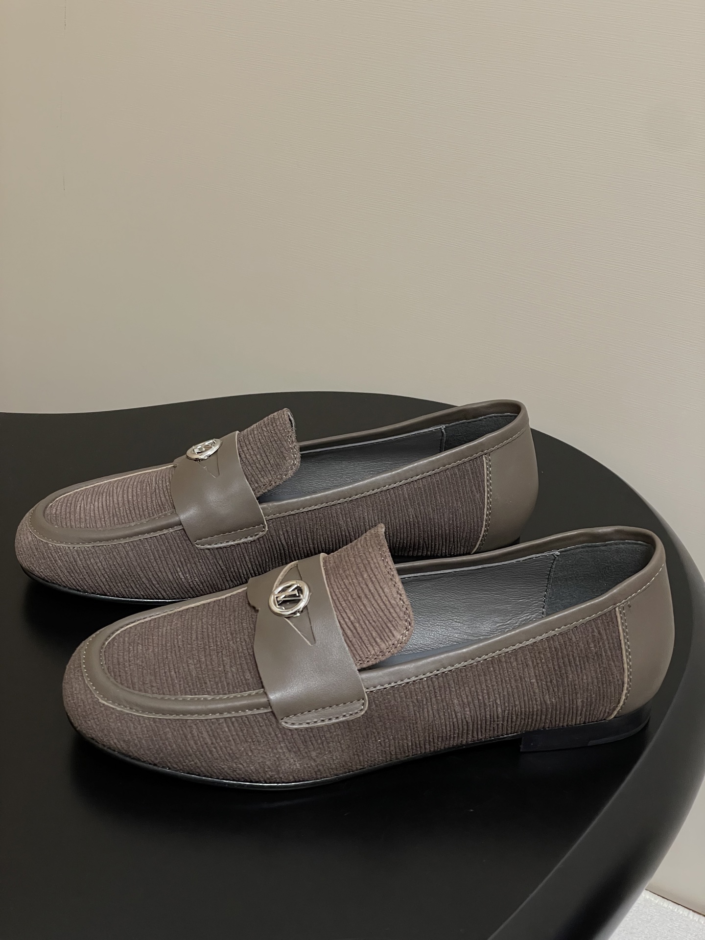 These Louis Vuitton loafers combine refined craftsmanship with timeless design. Made from soft brown suede canvas and detailed with a smooth leather strap featuring the LV emblem, they offer both comfort and sophistication. The slip-on design ensures easy wear, perfect for casual or semi-formal occasions.