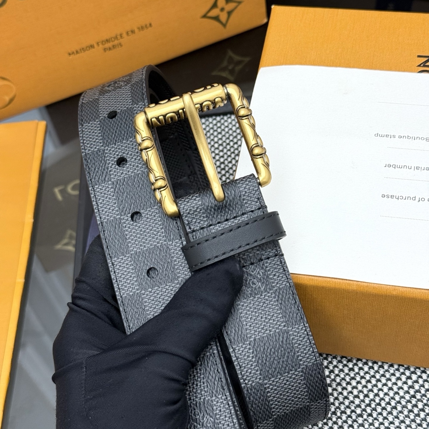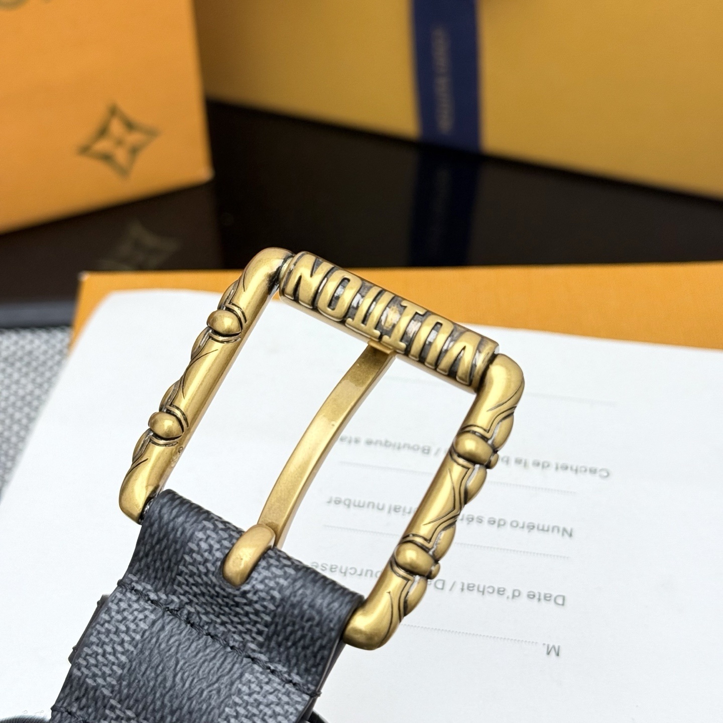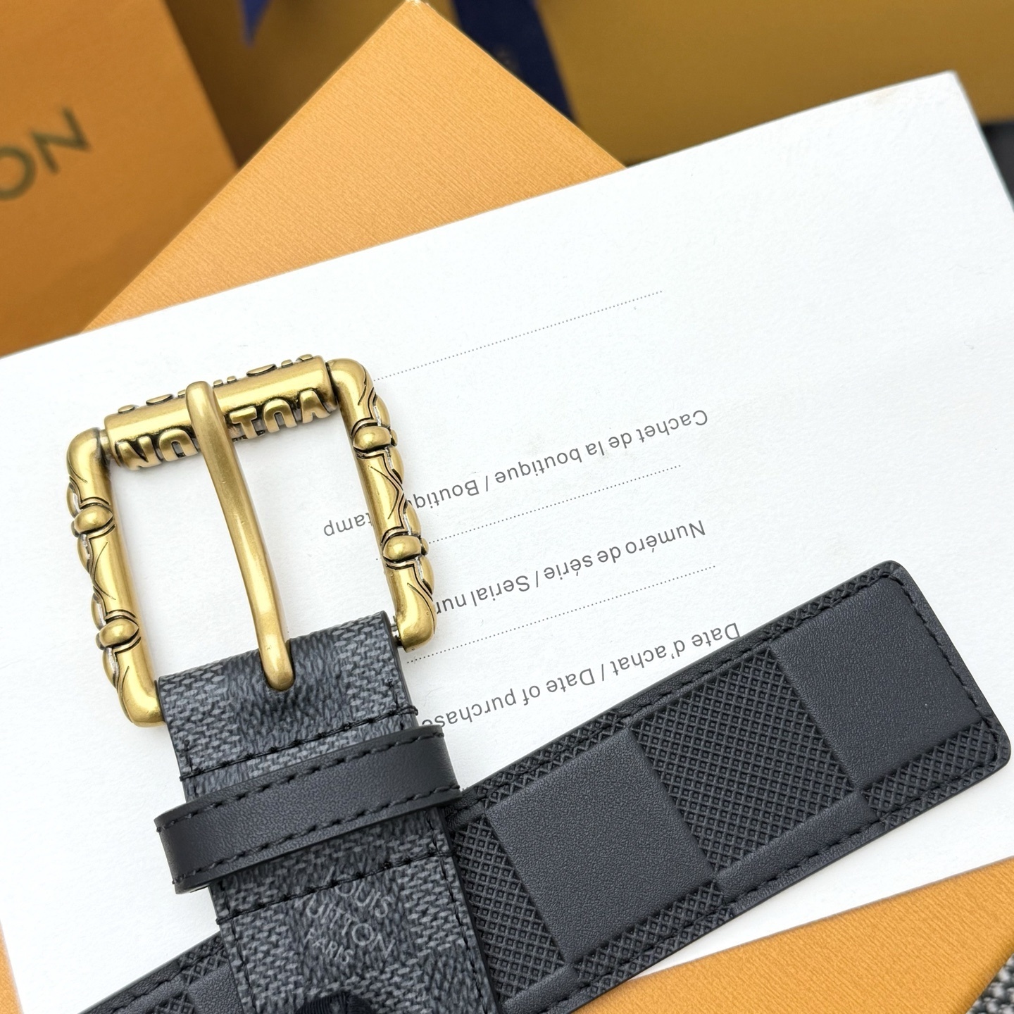This isn't just a belt; it's a statement piece. The contrasting gold buckle adds a touch of opulence to the understated Damier pattern, making it a standout accessory for any wardrobe. Whether you're dressing for a business meeting or a night out, this belt provides the perfect finishing touch of sophistication.