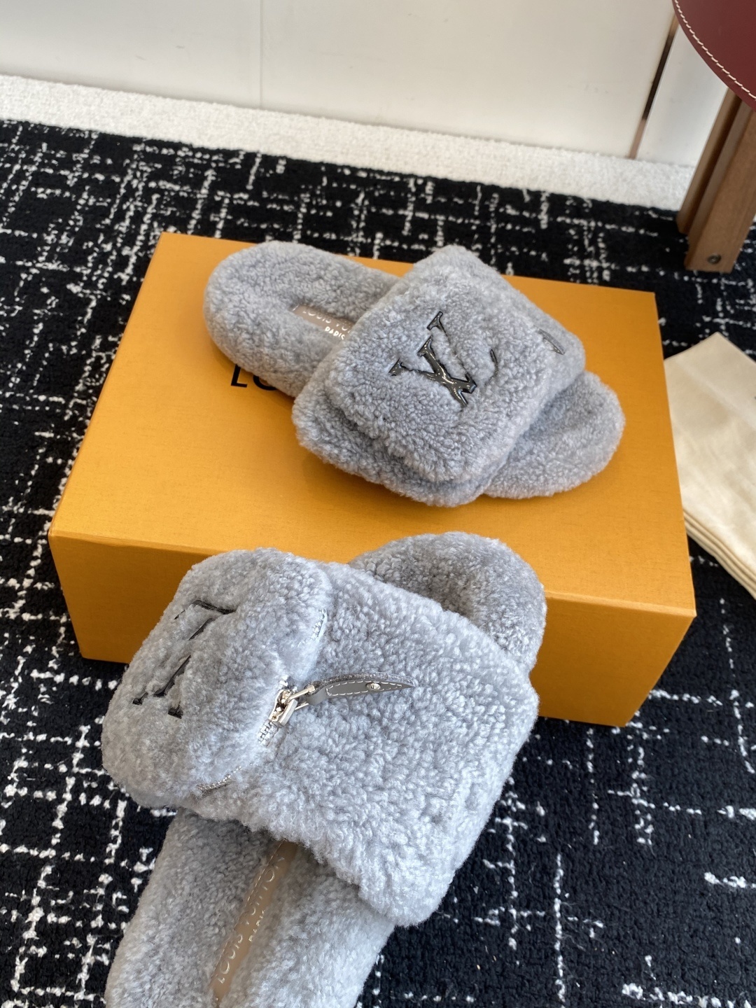 Step into unparalleled softness with these Louis Vuitton Grey Shearling Mule Slides. Designed for the modern individual who values both style and relaxation, these slides offer a sophisticated take on luxury footwear.