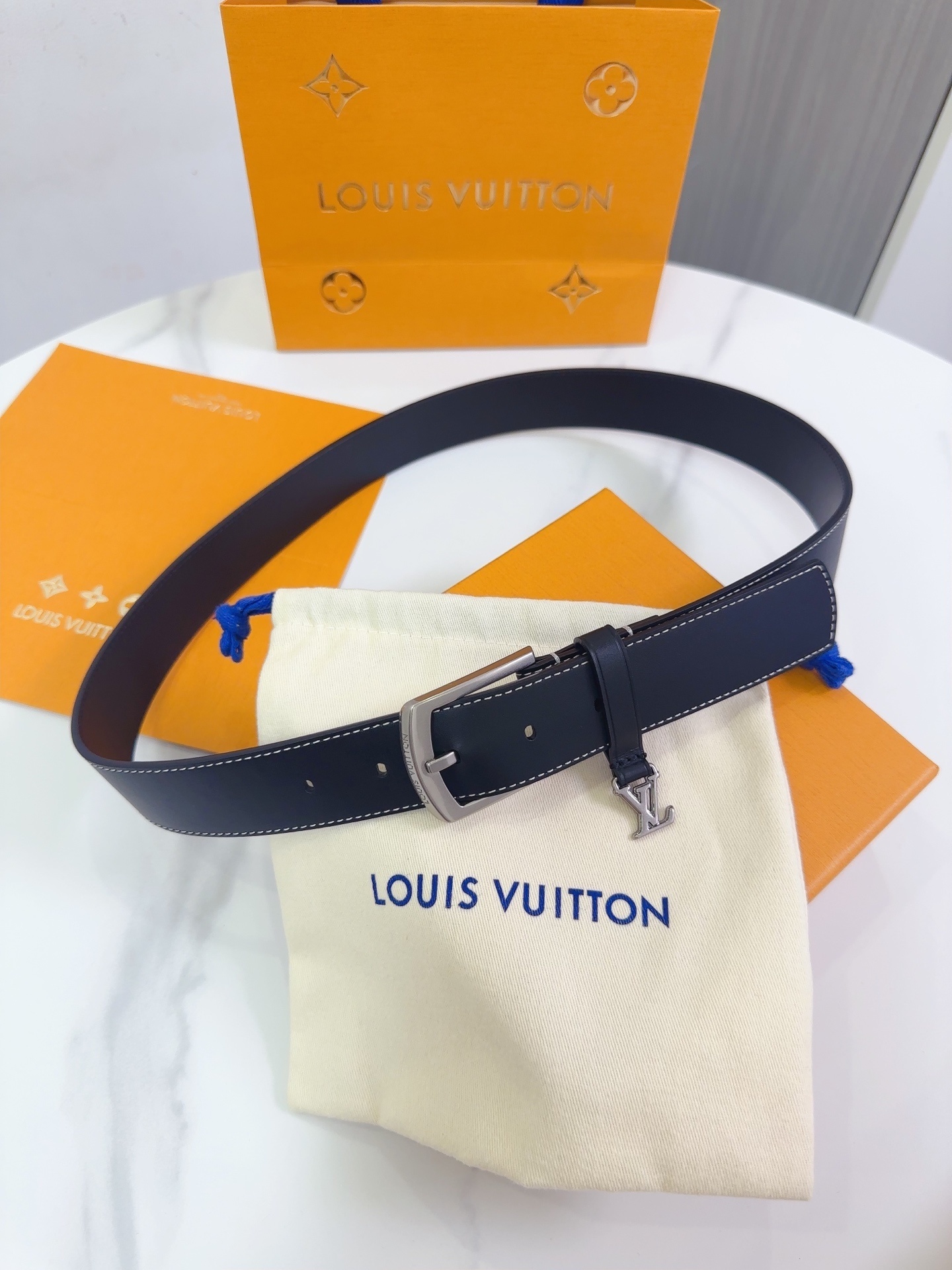 Louis Vuitton Leather Belt with Silver LV Charm & Contrast Stitching