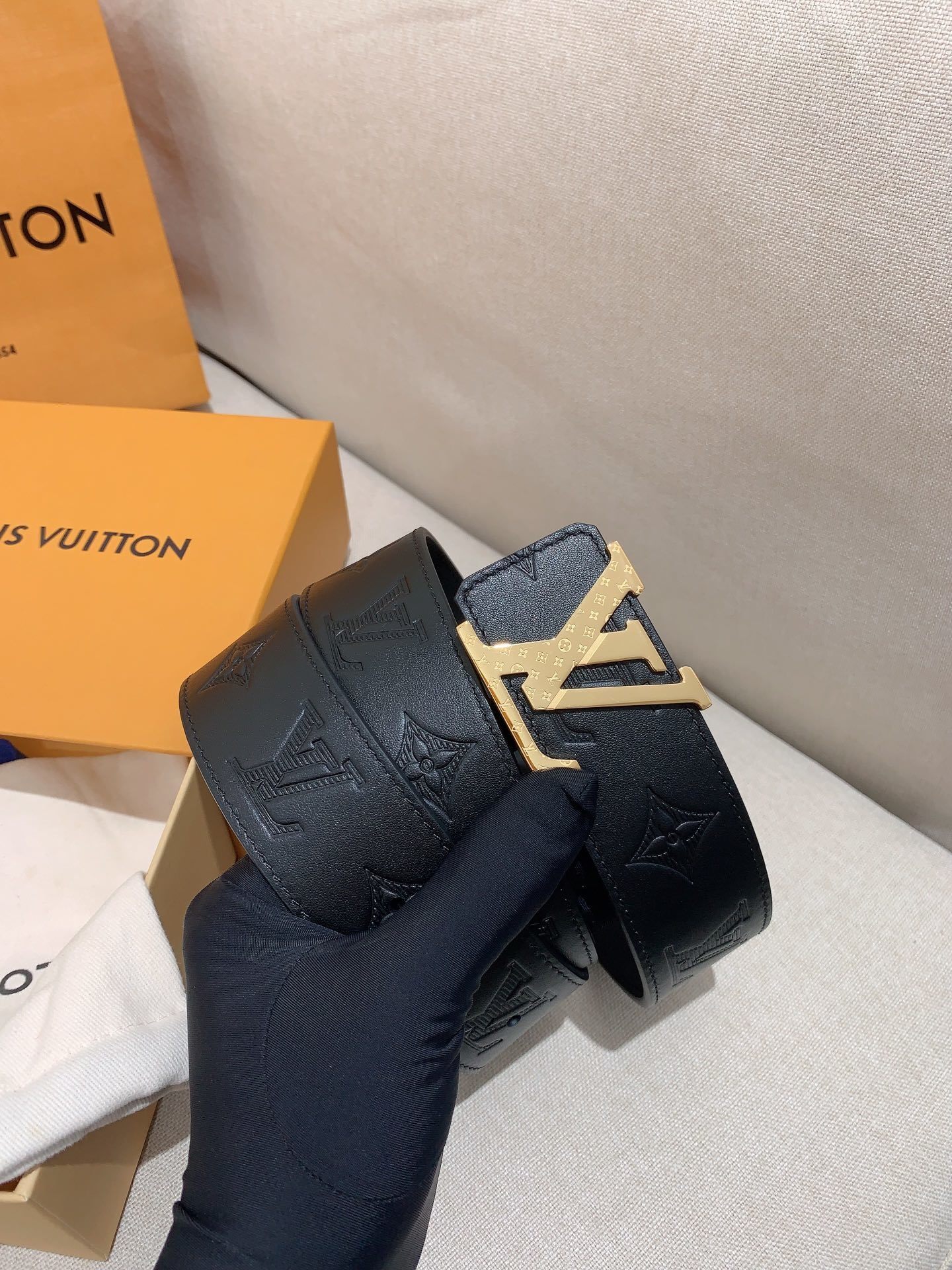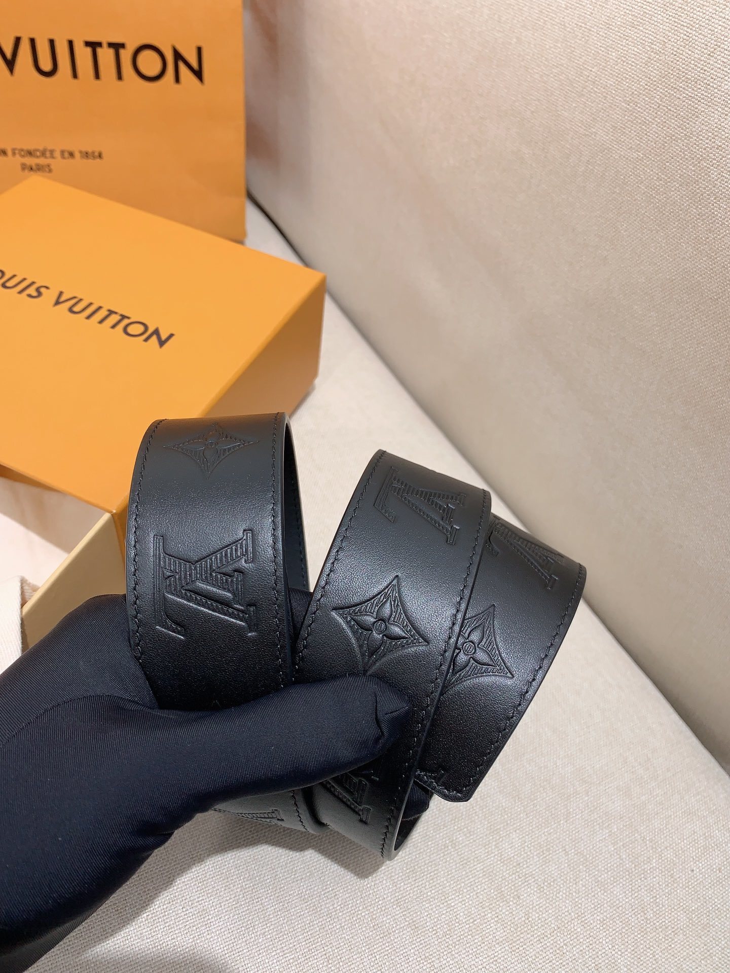 Elevate your everyday attire with the iconic Louis Vuitton LV Initiales Belt. This masterpiece combines the Maison's heritage with contemporary sophistication. Featuring a rich black leather strap, it is meticulously embossed with the classic monogram motif for a textured, high-end feel.