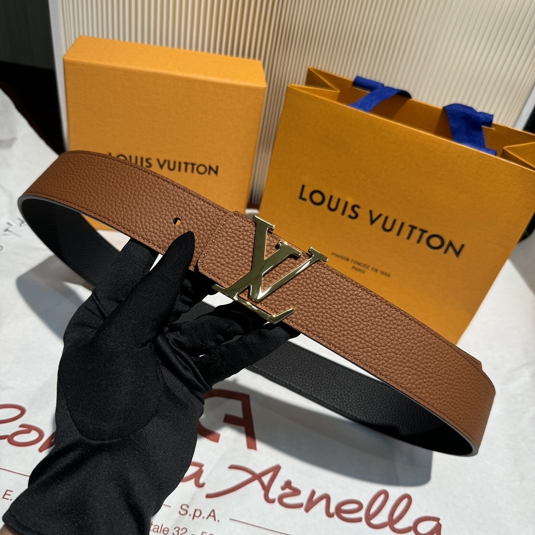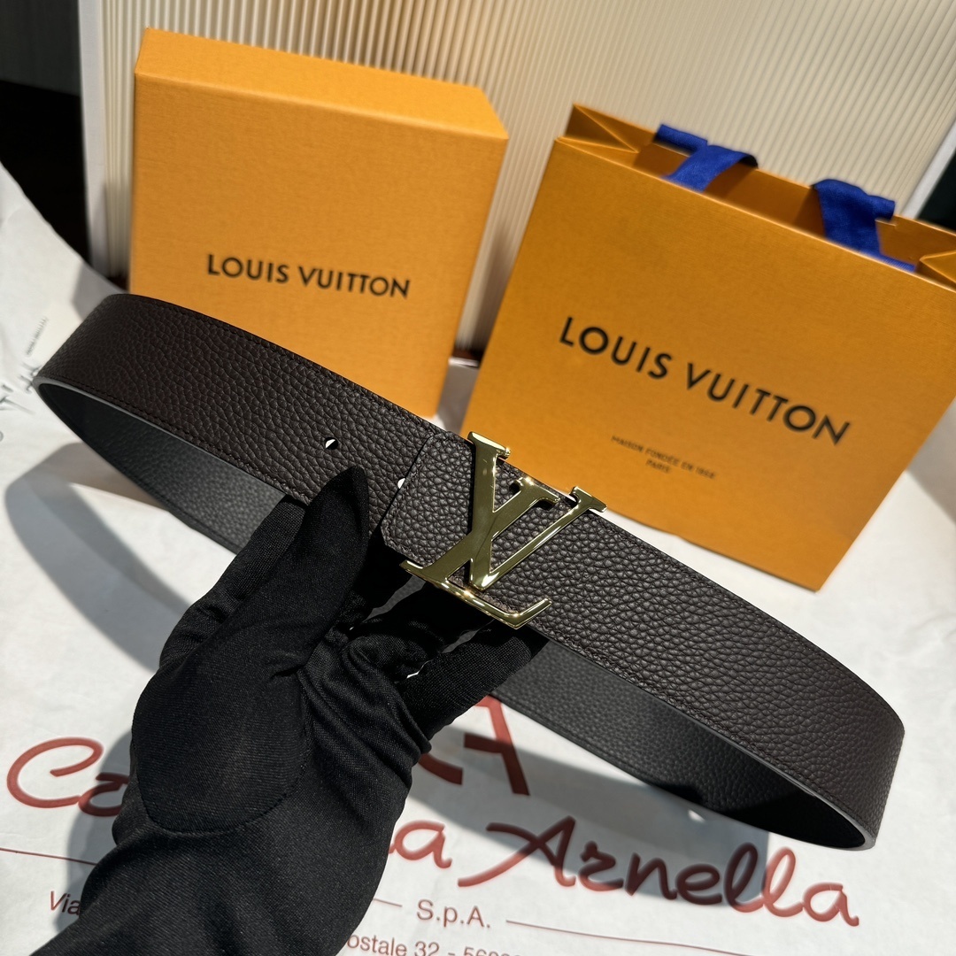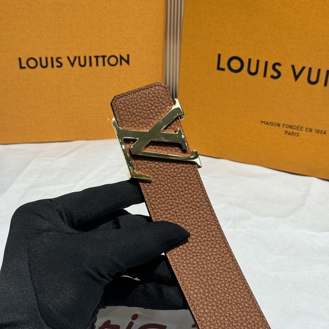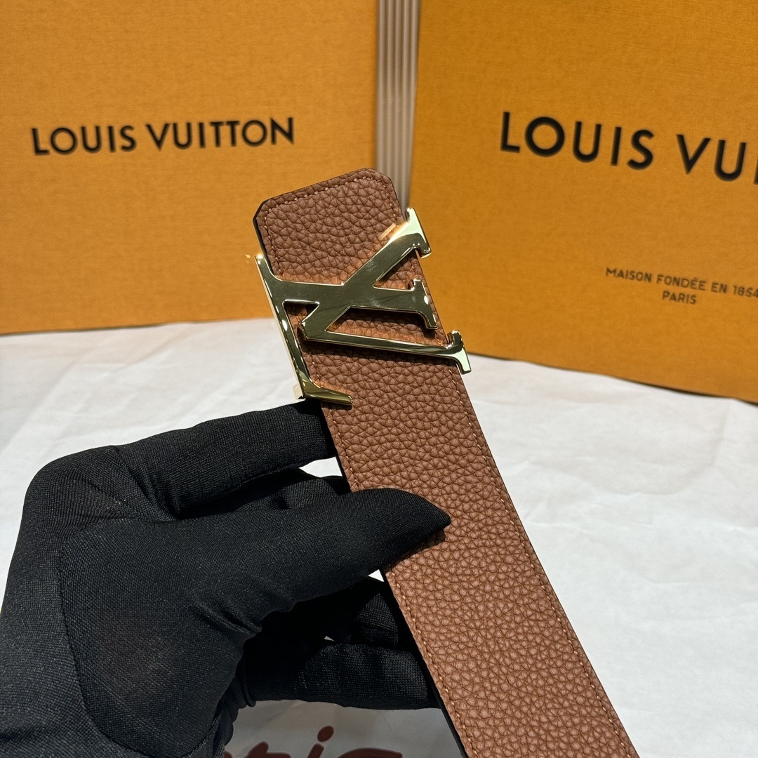 Brown leather belt with gold metal buckle engraved with Miu Miu