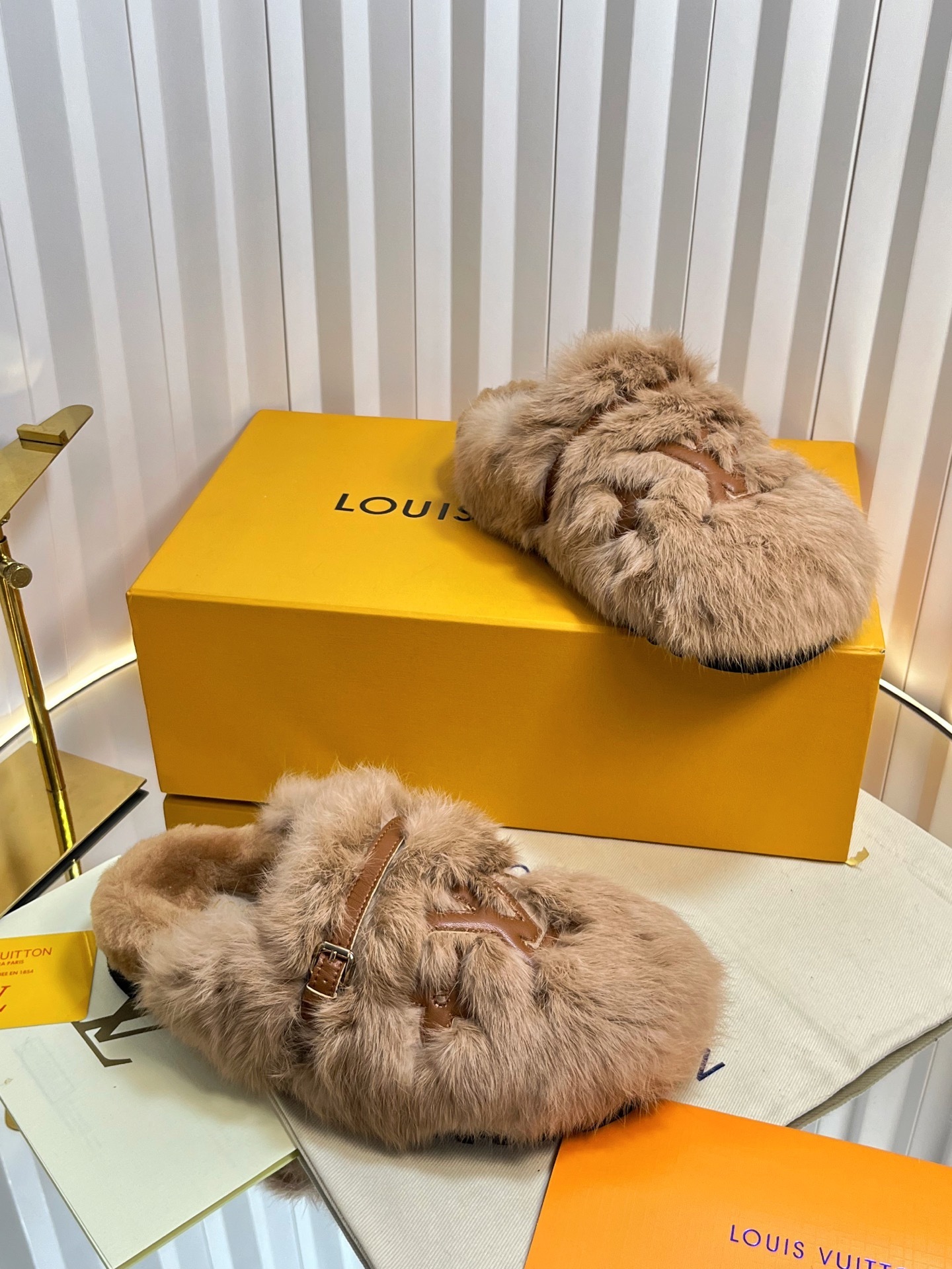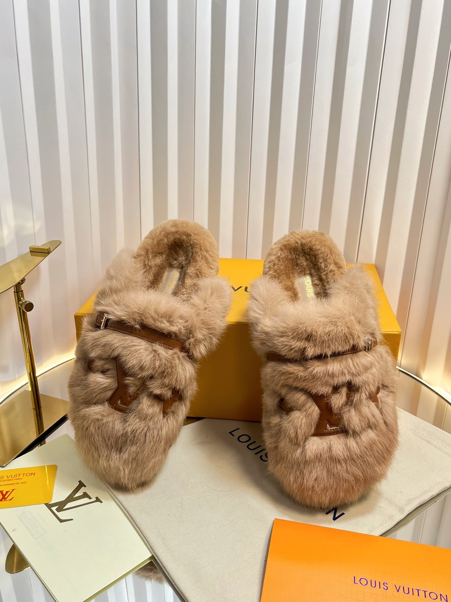 Each pair is meticulously crafted featuring plush, high-quality shearling that provides unparalleled warmth and softness. The iconic LV Monogram logo is elegantly integrated into the fur, showcasing your taste for world-class designer fashion.