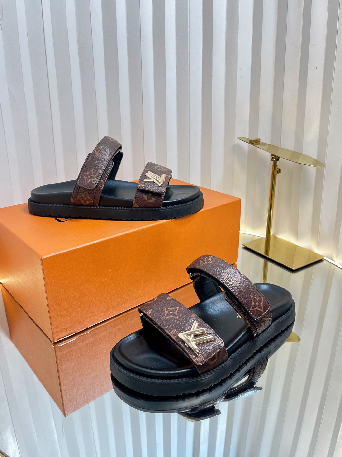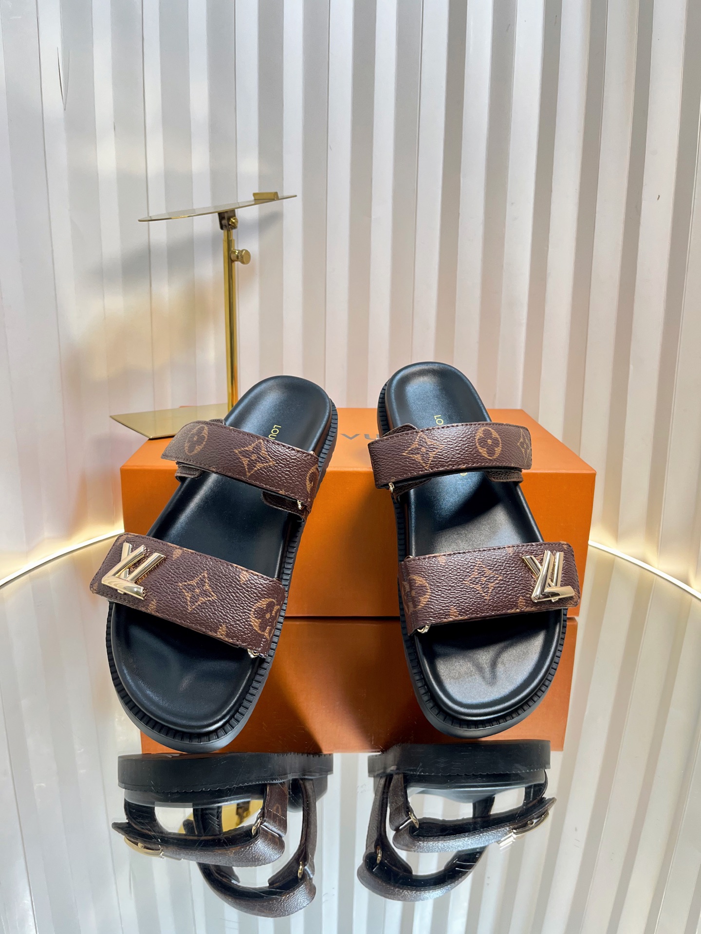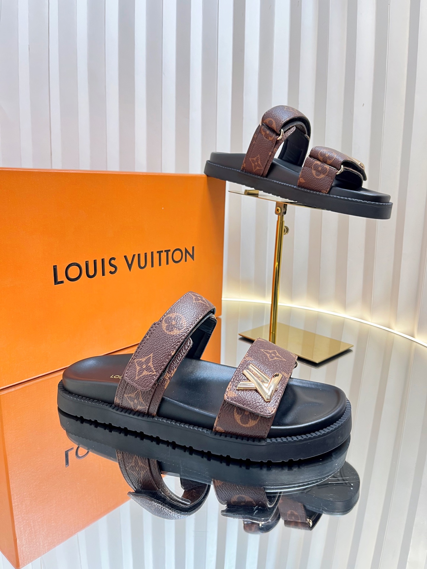 Louis Vuitton Men’s Blue Denim Sandals Cherry Monogram Pattern Adjustable Straps Rubber Sole
