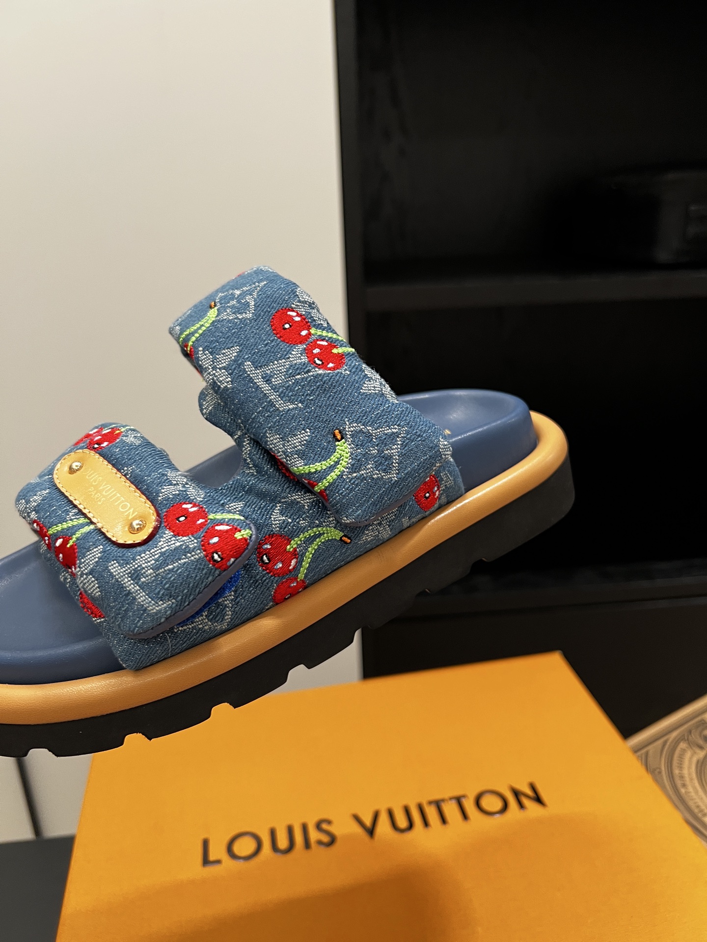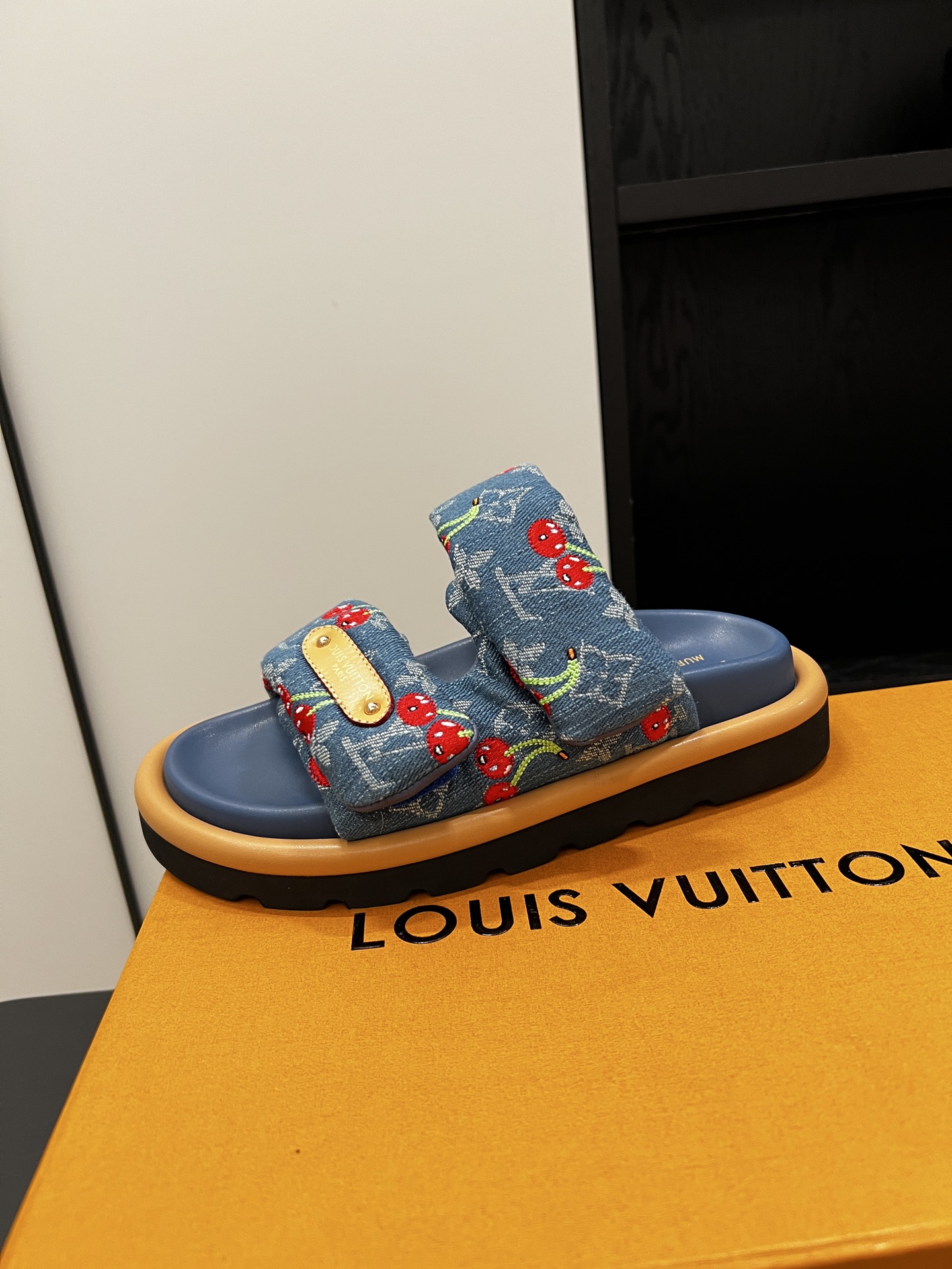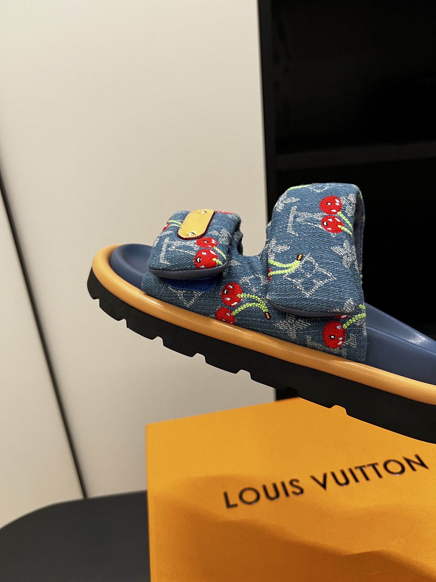 Louis Vuitton Men’s Blue Denim Sandals Cherry Monogram Pattern Adjustable Straps Rubber Sole