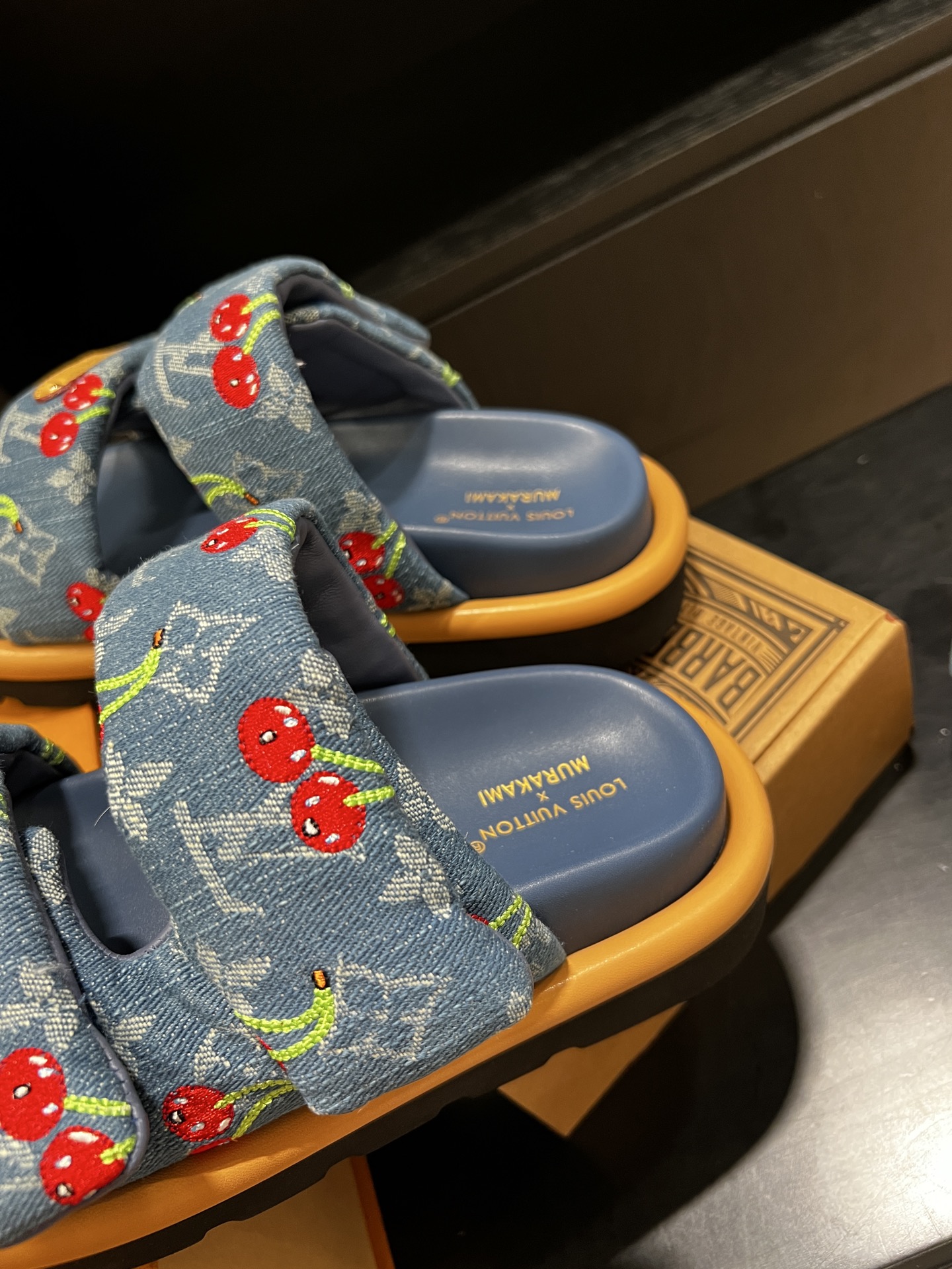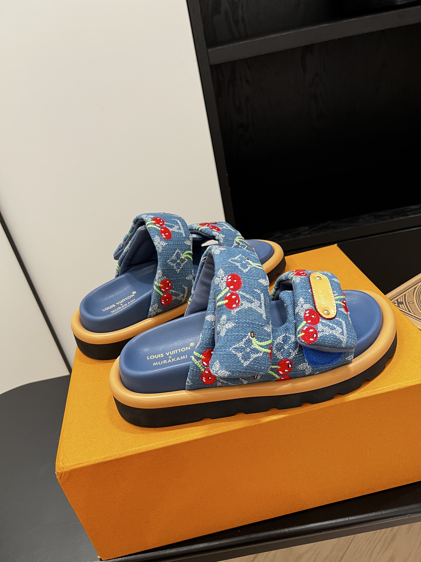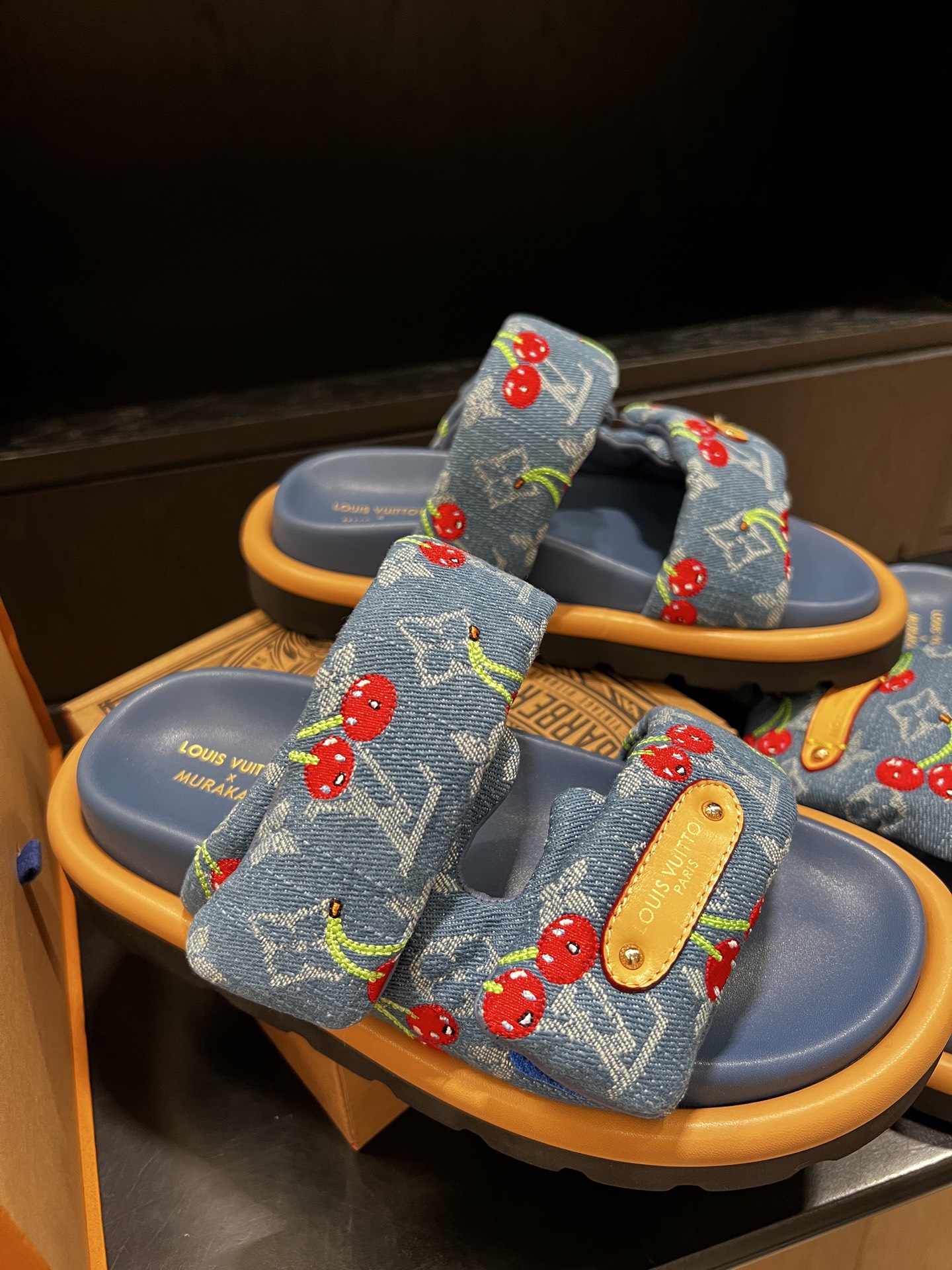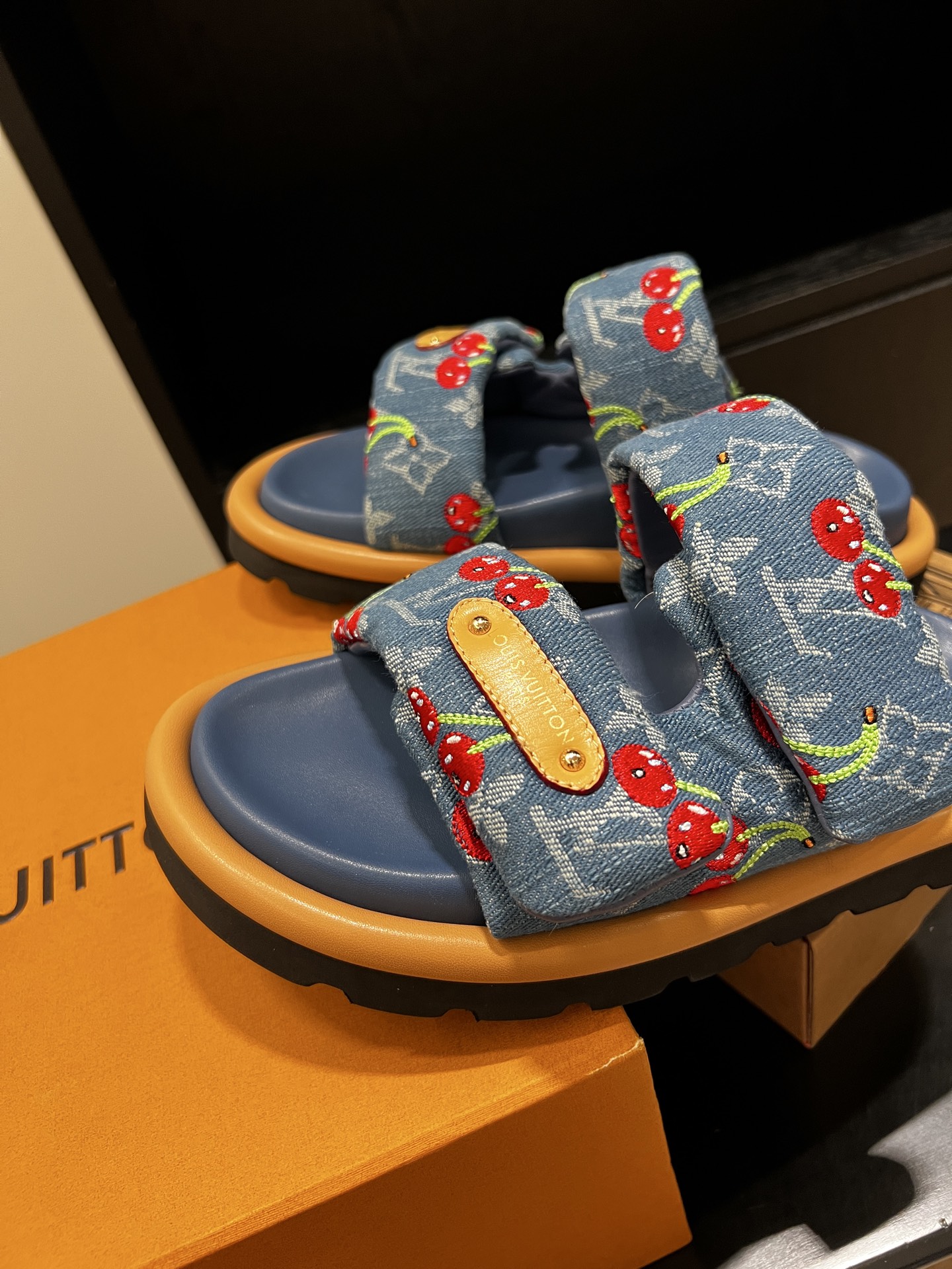 Louis Vuitton Men’s Blue Denim Sandals Cherry Monogram Pattern Adjustable Straps Rubber Sole