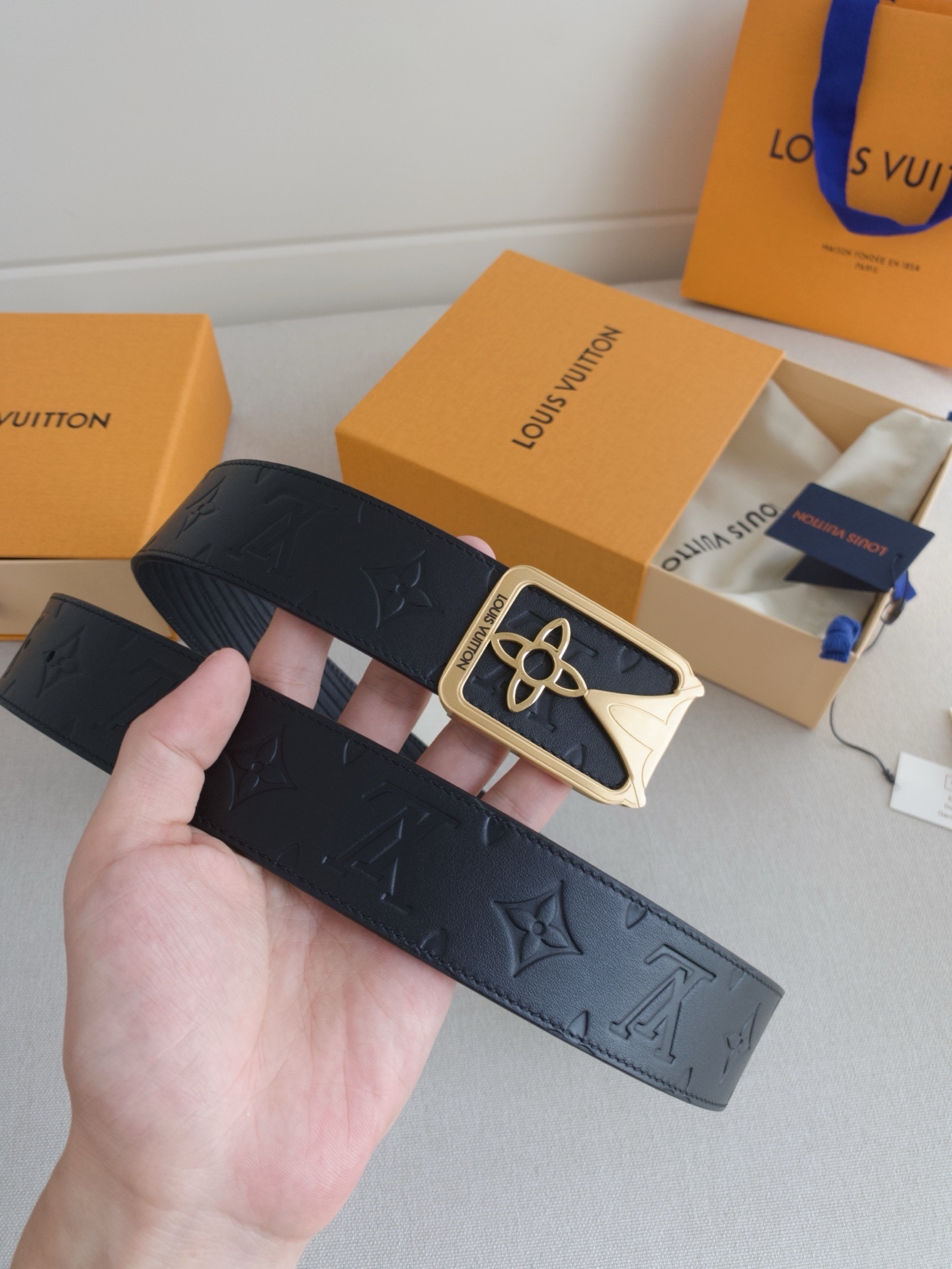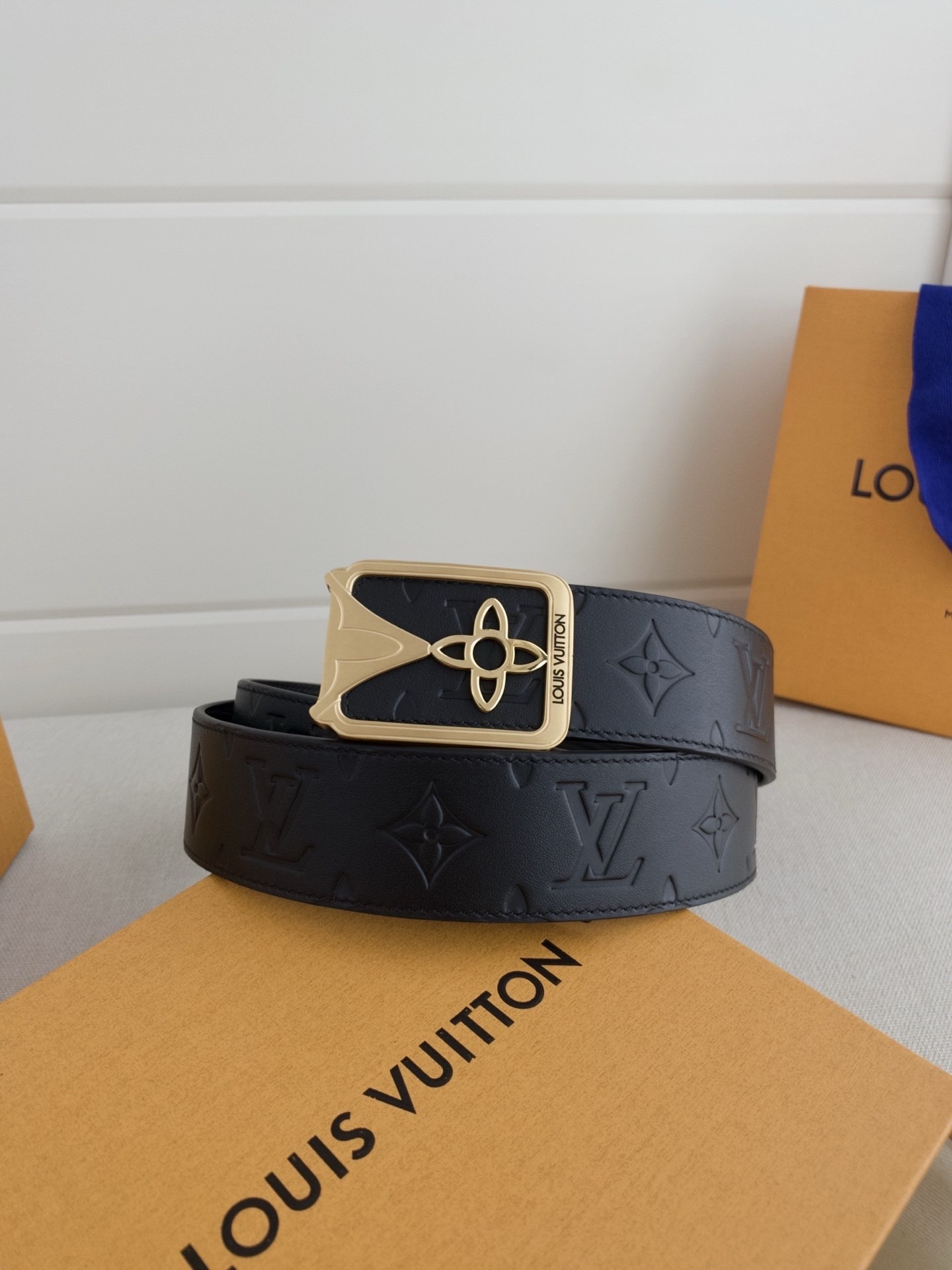 Brown leather belt with gold metal buckle engraved with Miu Miu