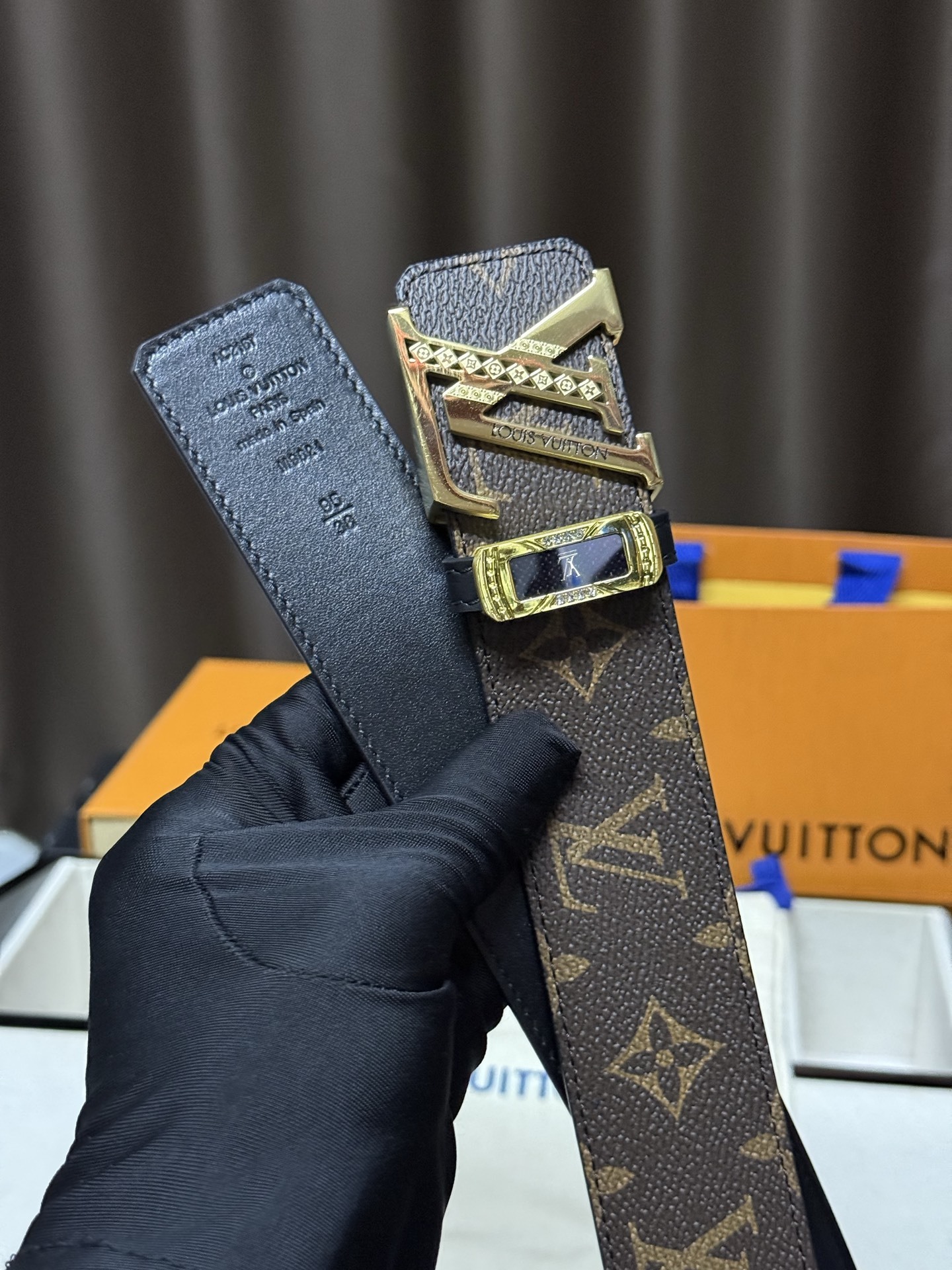 The centerpiece of this belt is the stunning gold-tone LV Initiales buckle. It features intricate laser-etched detailing and is accented with subtle crystal-like stones and a sleek black inlay, adding a touch of modern flair to a classic design.
