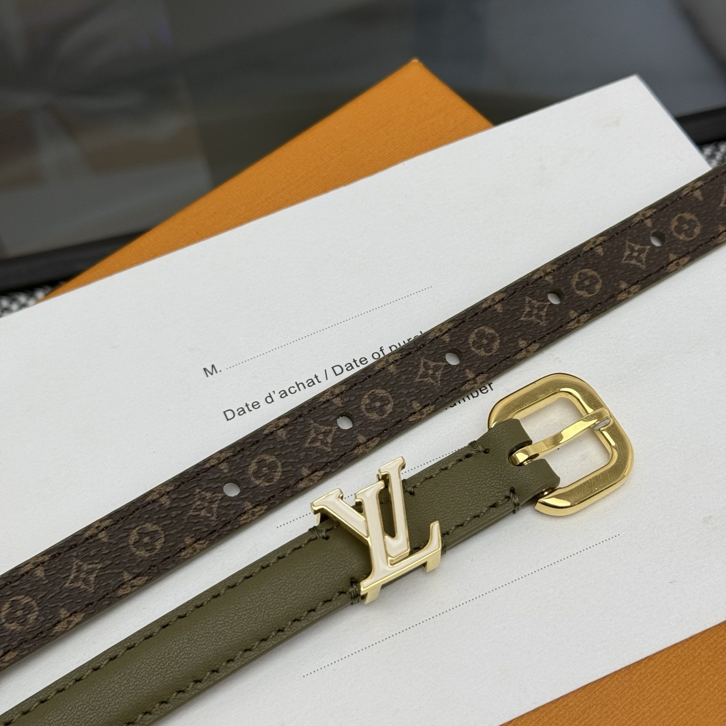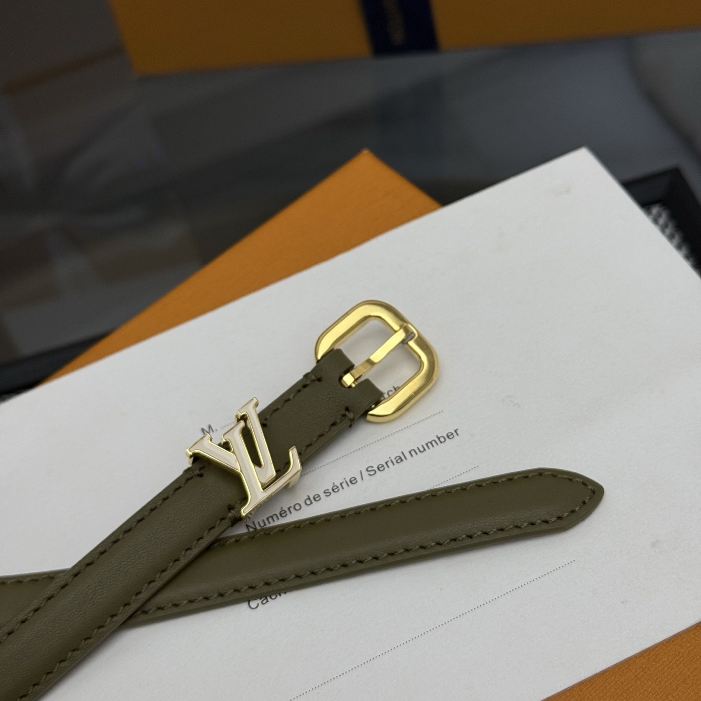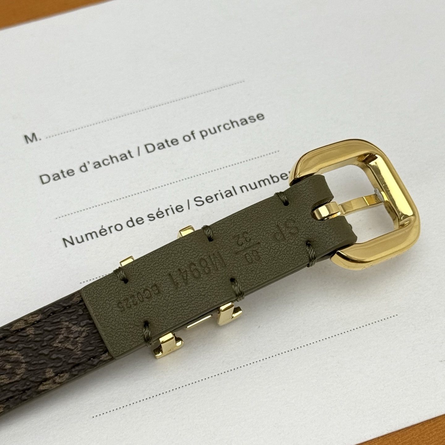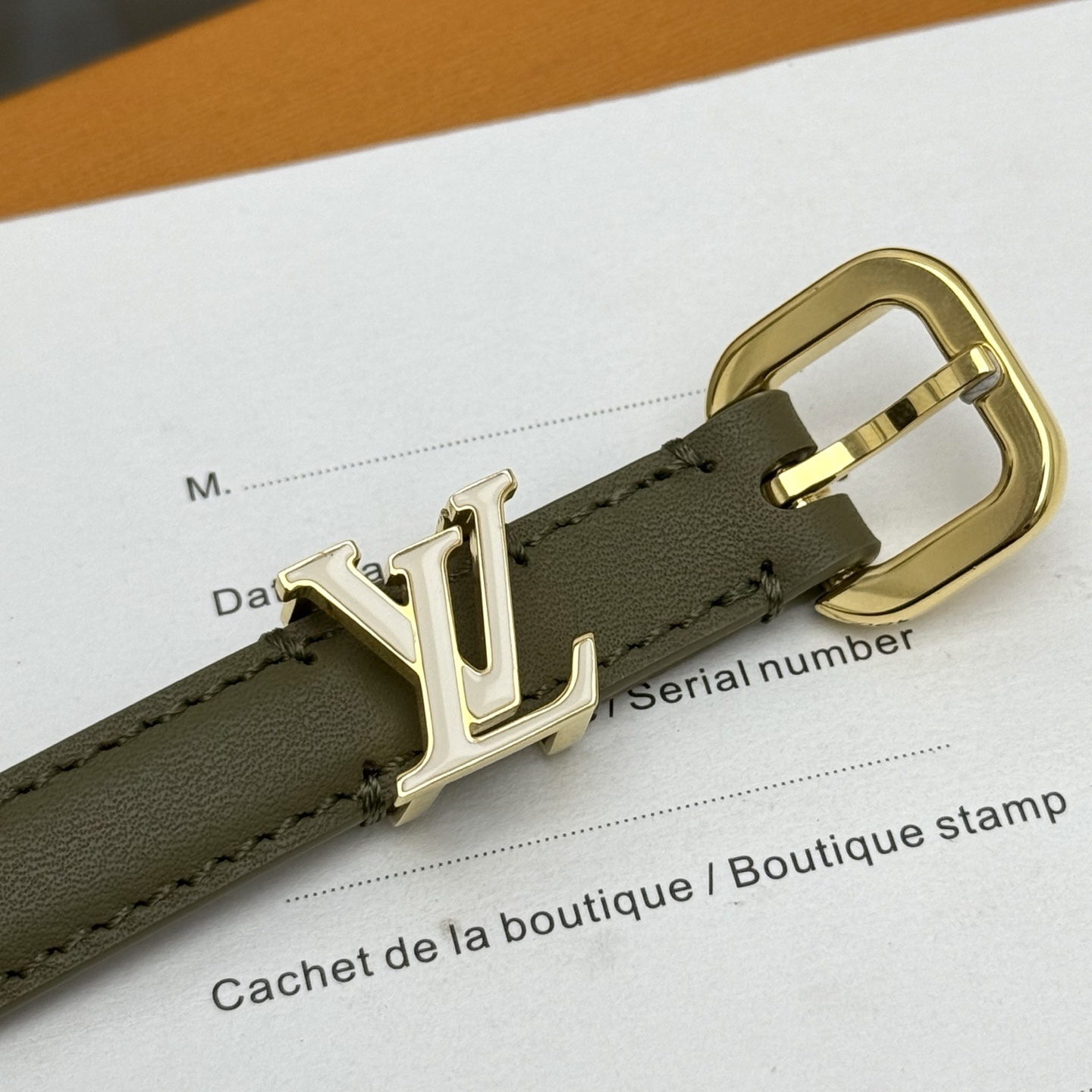 Brown leather belt with gold metal buckle engraved with Miu Miu