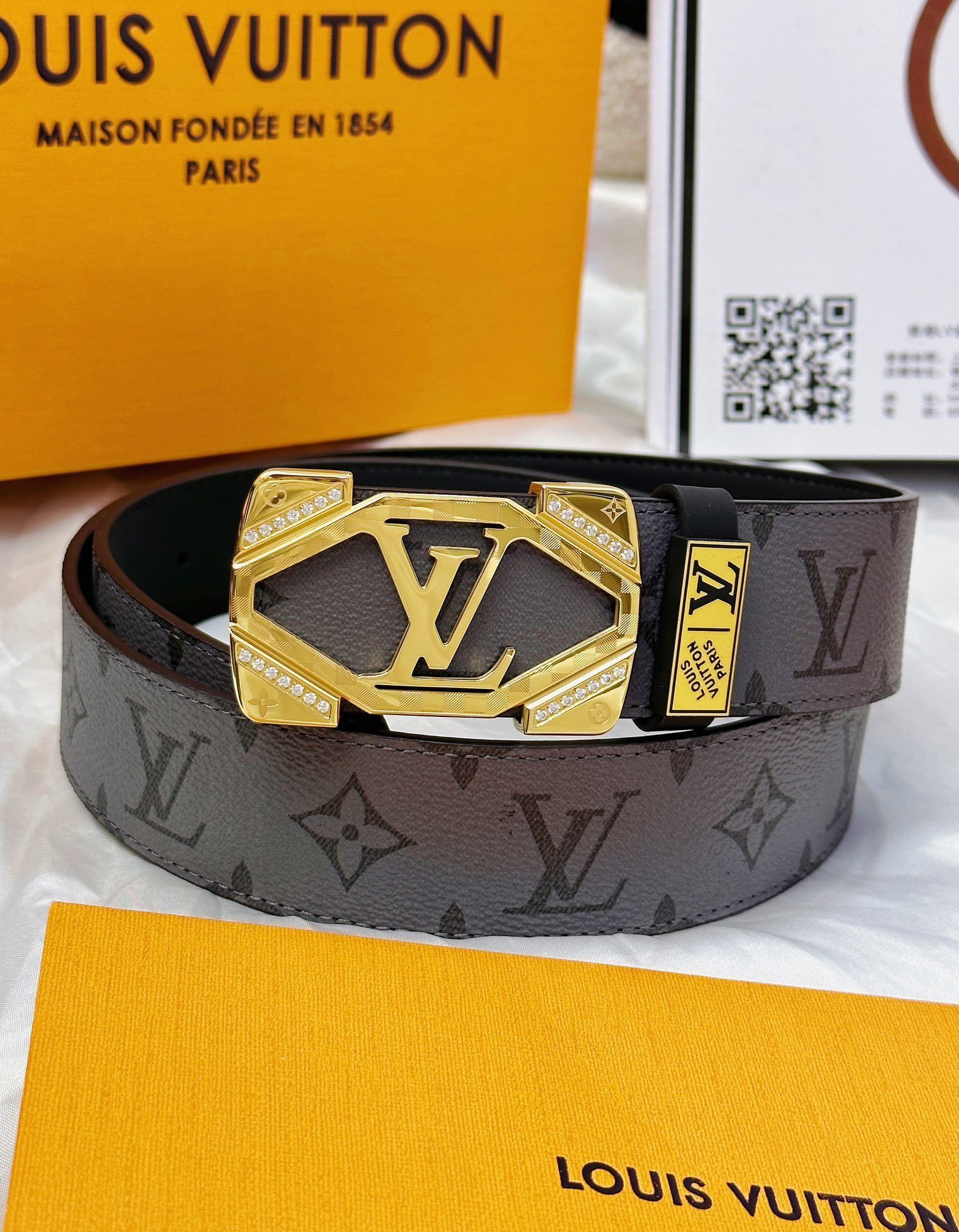 Brown leather belt with gold metal buckle engraved with Miu Miu