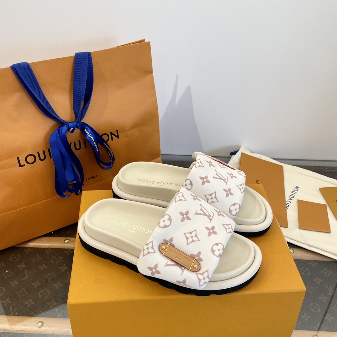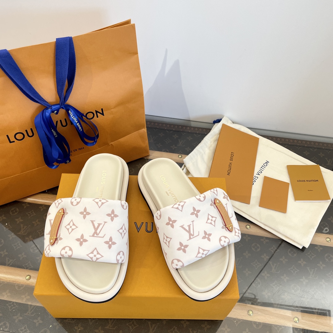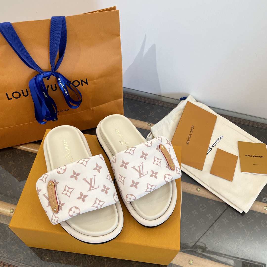 Elegant white slides with pink Louis Vuitton monogram pattern