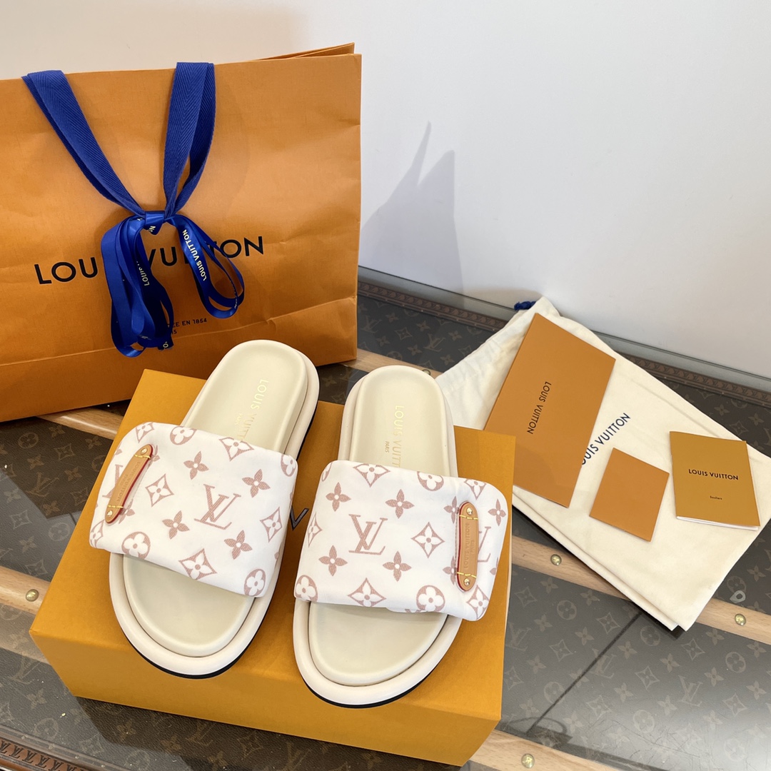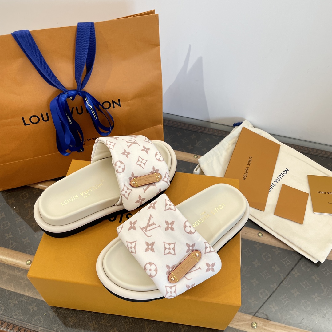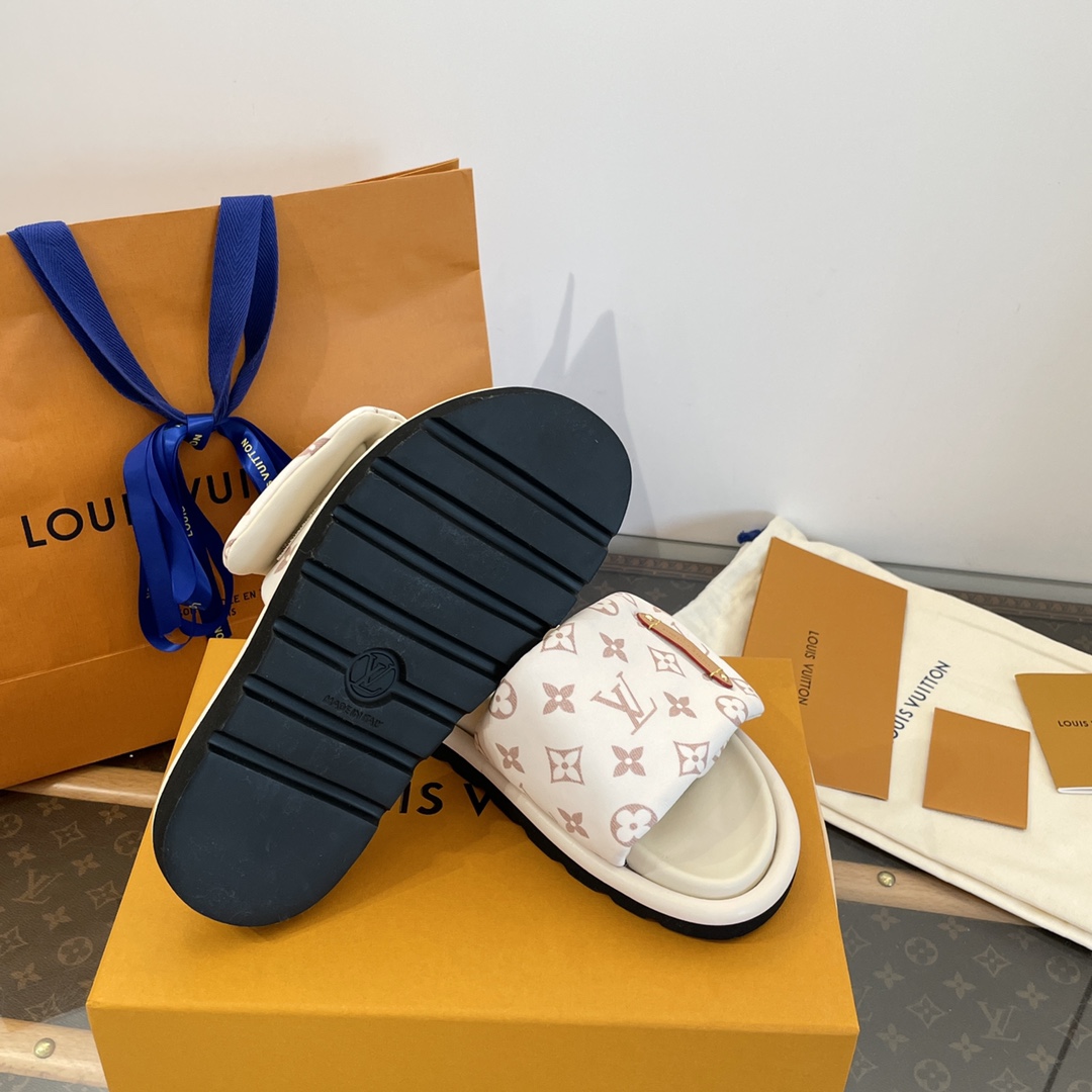 Elegant white slides with pink Louis Vuitton monogram pattern