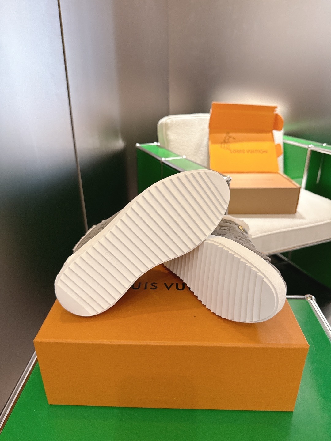 • Premium Materials: Crafted from high-quality grey suede featuring the iconic all-over LV monogram pattern.
