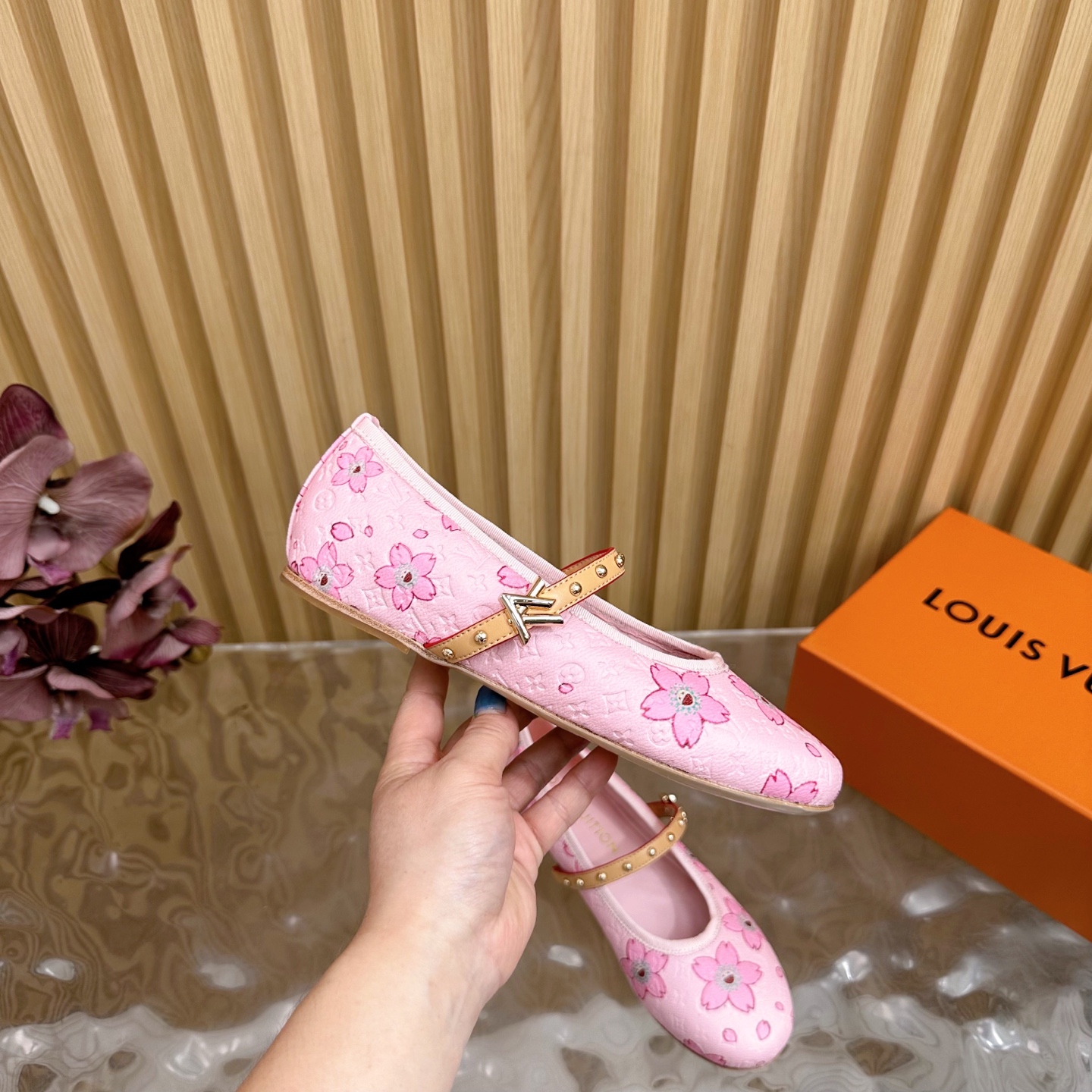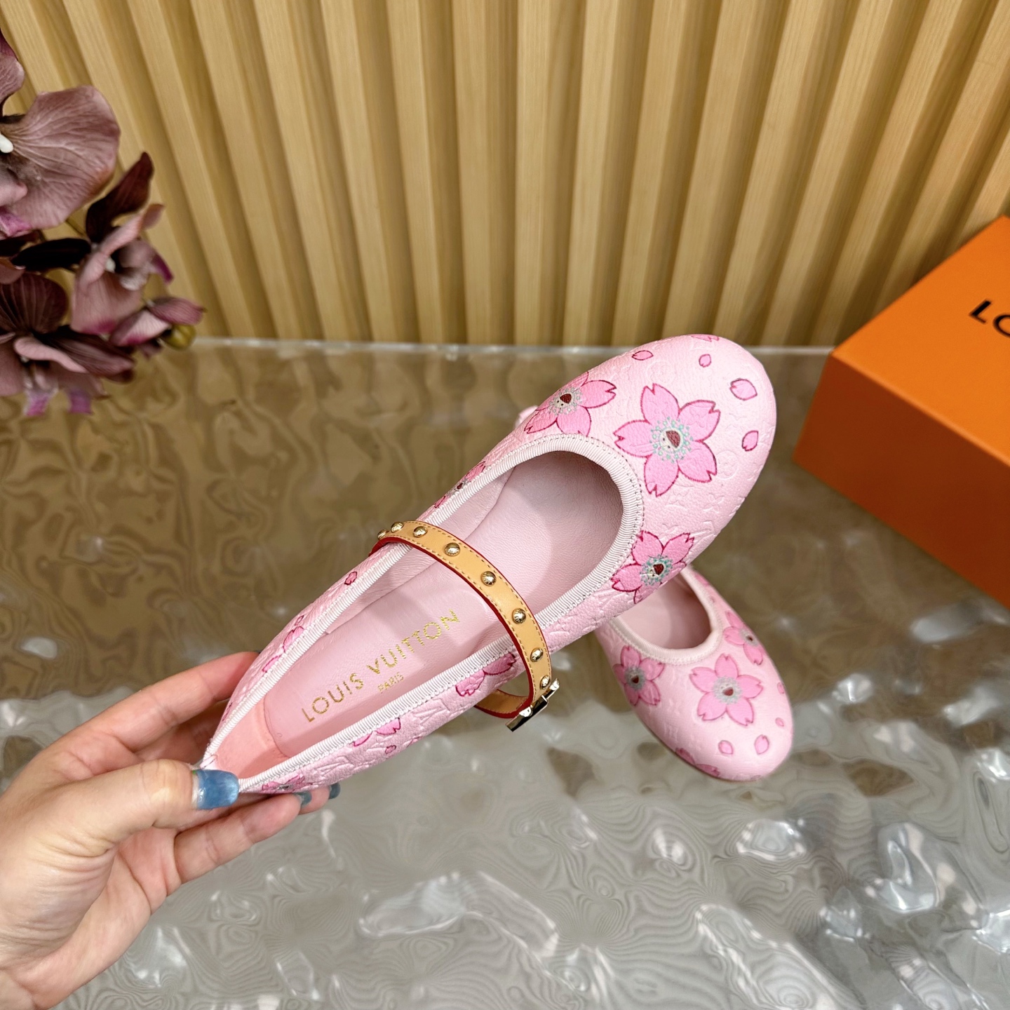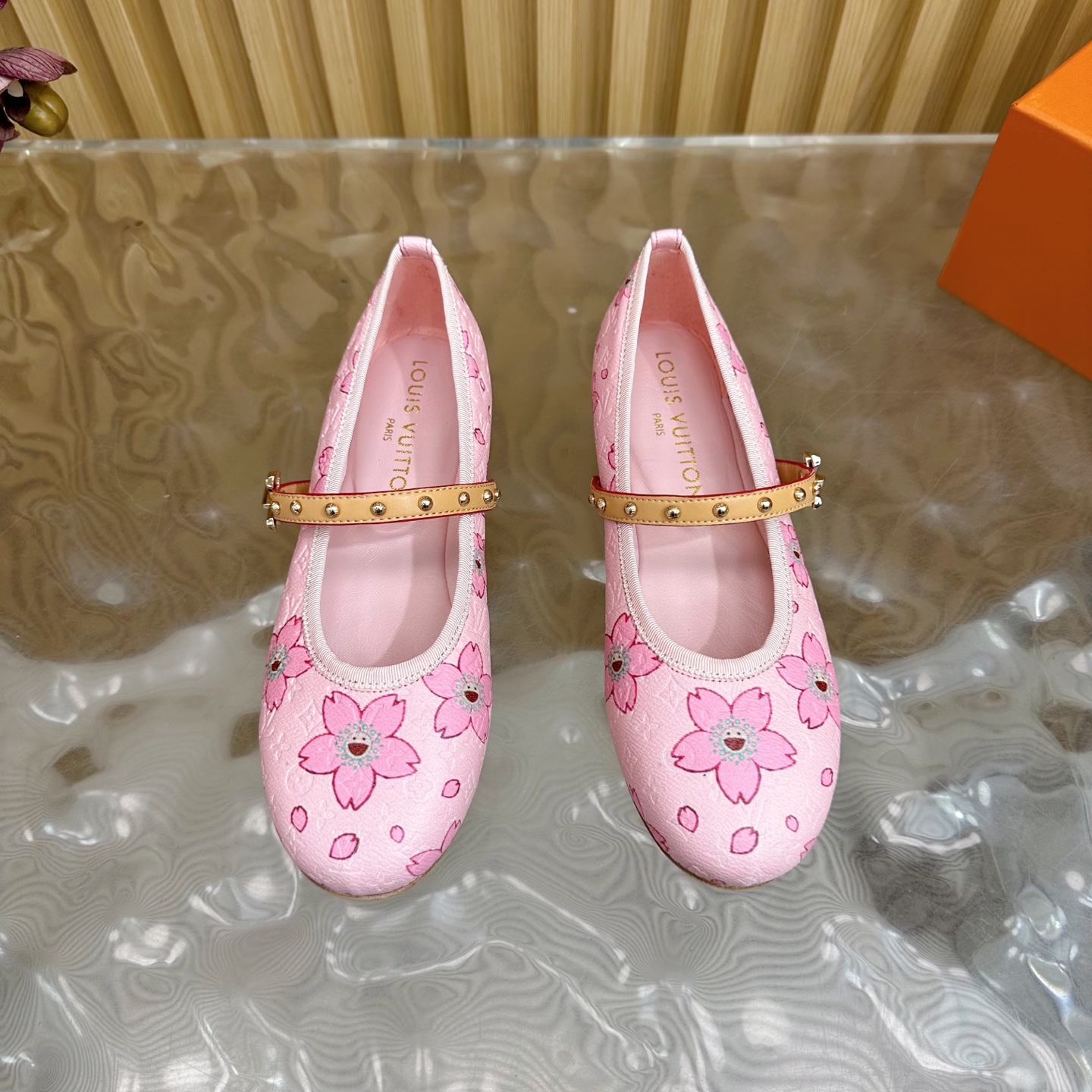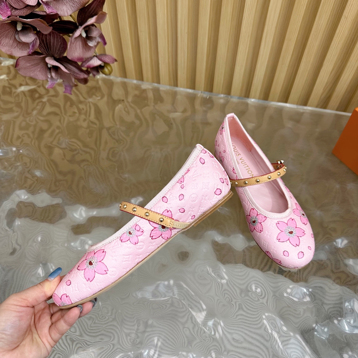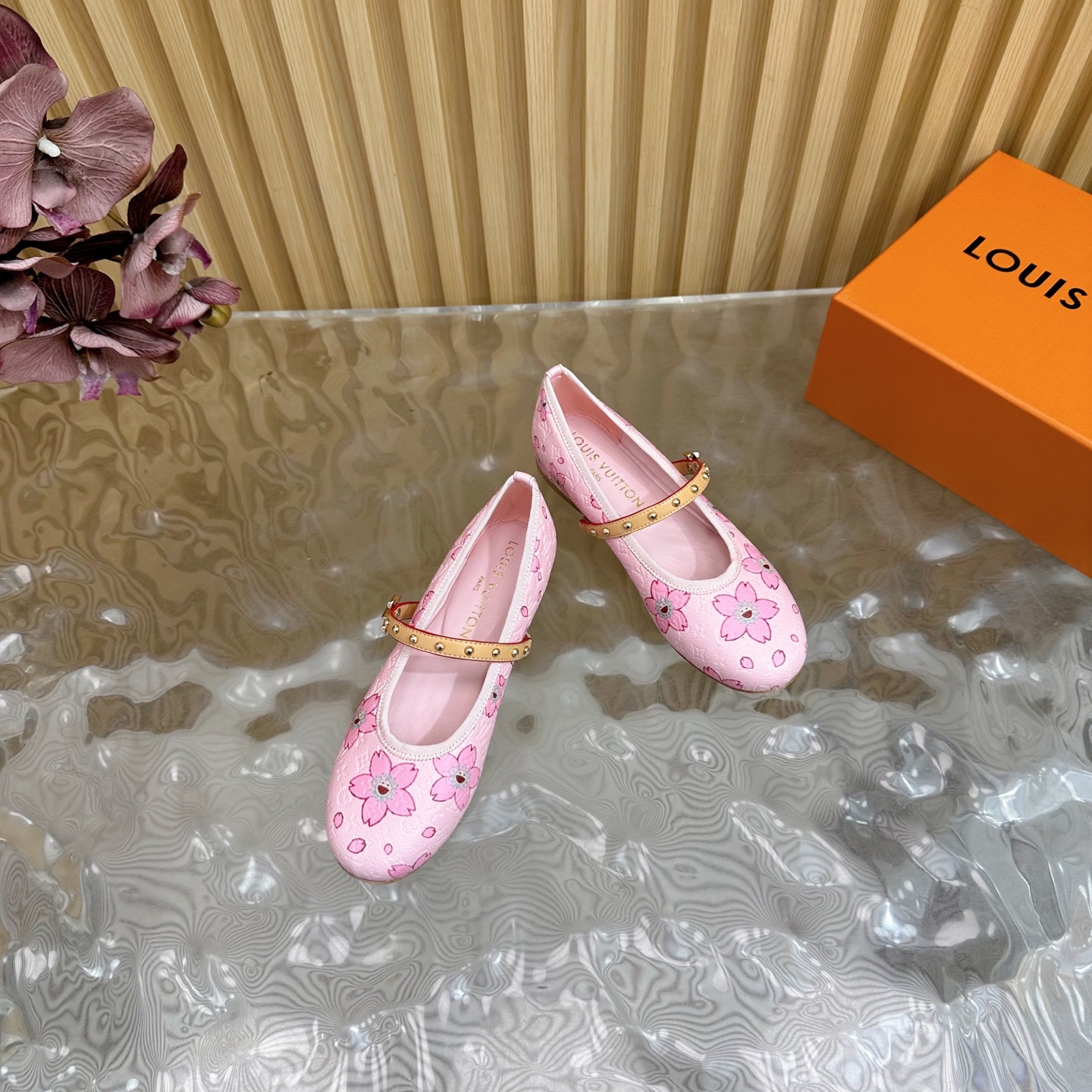 hese Louis Vuitton girls’ Mary Jane shoes feature a soft pink monogram canvas adorned with charming floral motifs, creating a sweet and elegant style for young girls. Designed with a comfortable round toe and smooth leather interior, these shoes ensure all-day comfort. The adjustable strap with gold-tone studs adds both beauty and practicality, making them perfect for parties, family outings, or daily wear. Crafted with attention to detail, they combine playful design with Louis Vuitton’s signature craftsmanship.