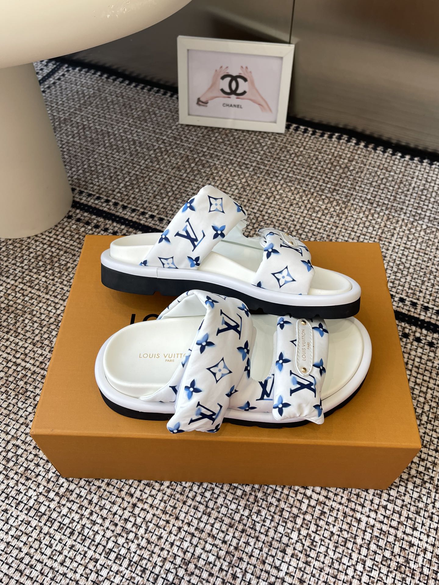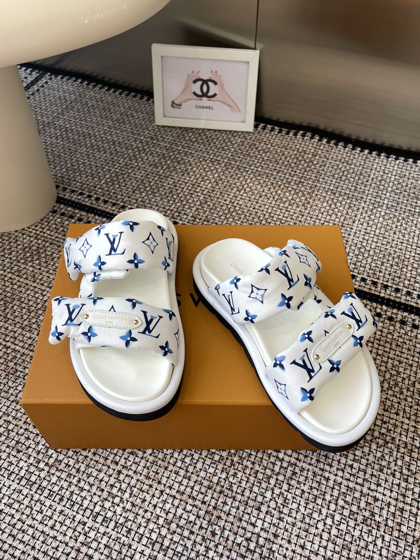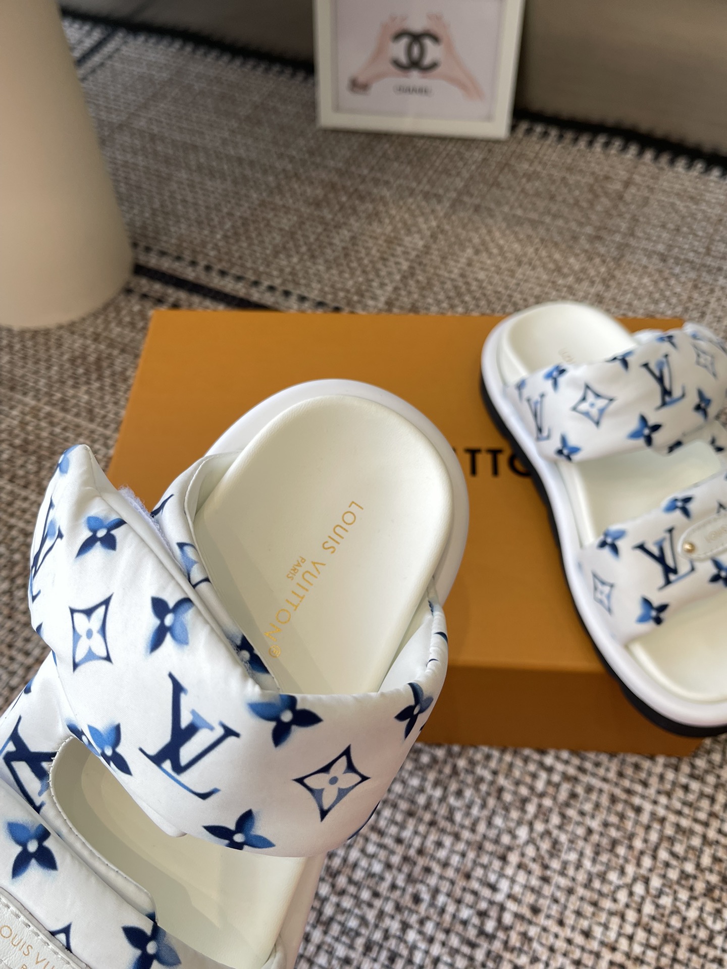 Louis Vuitton Men’s Blue Denim Sandals Cherry Monogram Pattern Adjustable Straps Rubber Sole