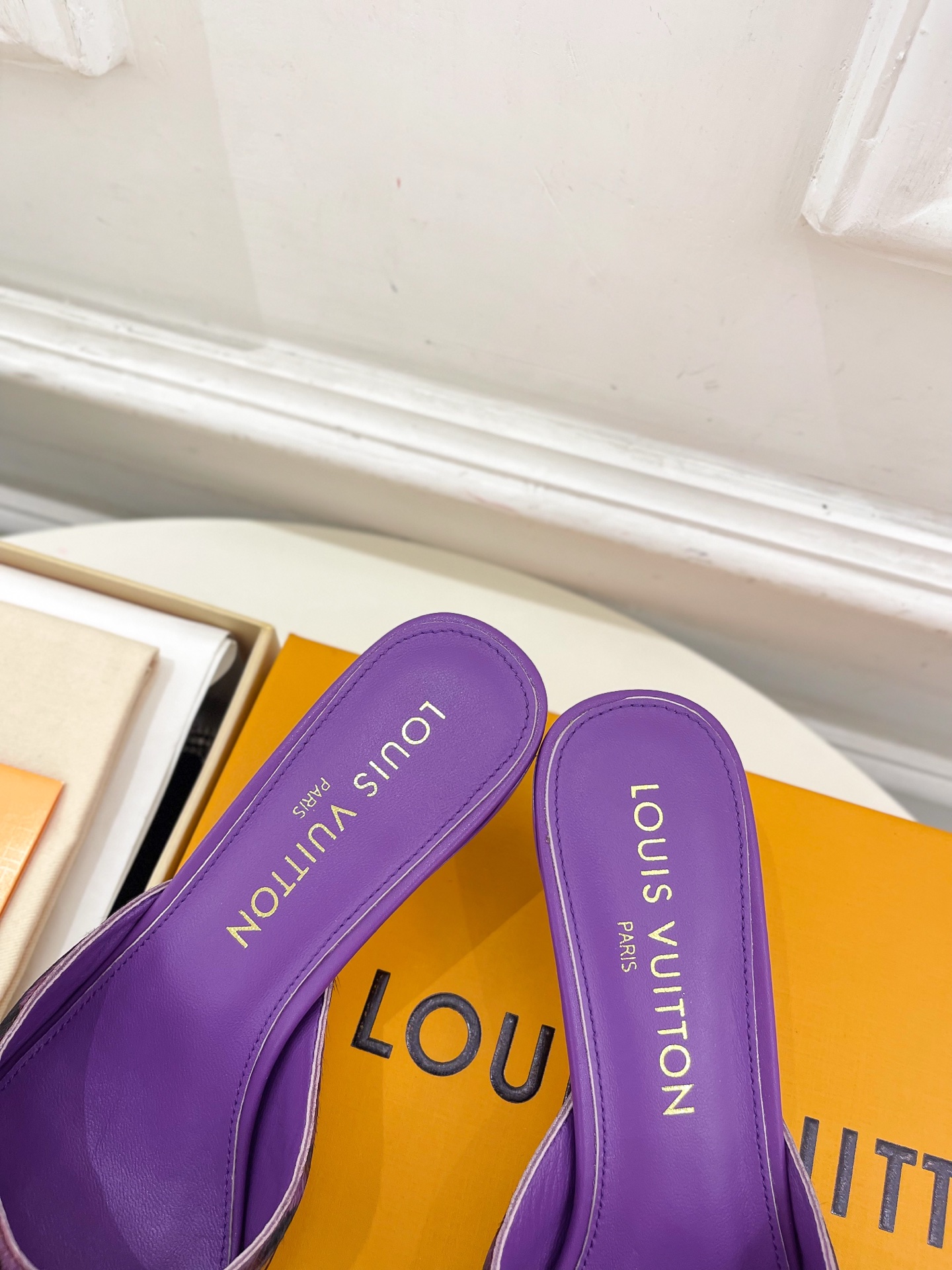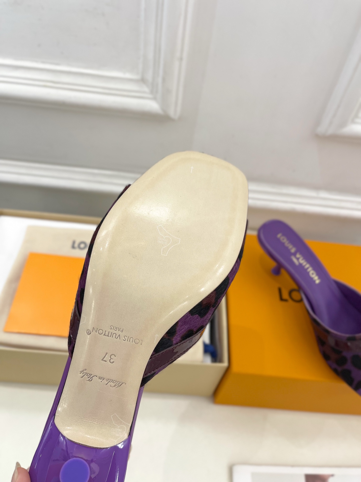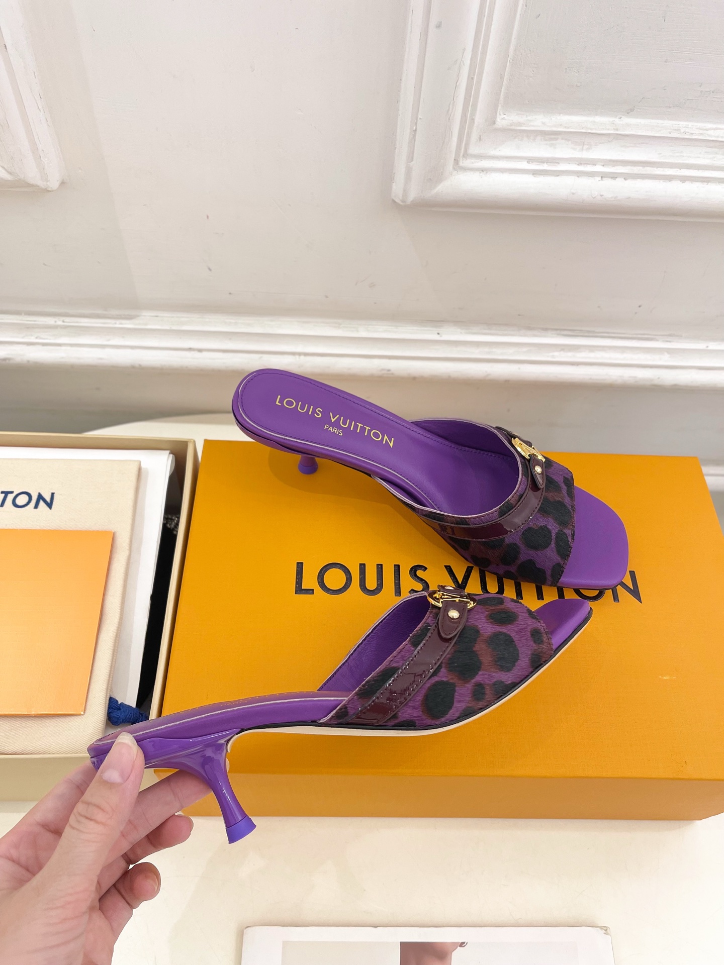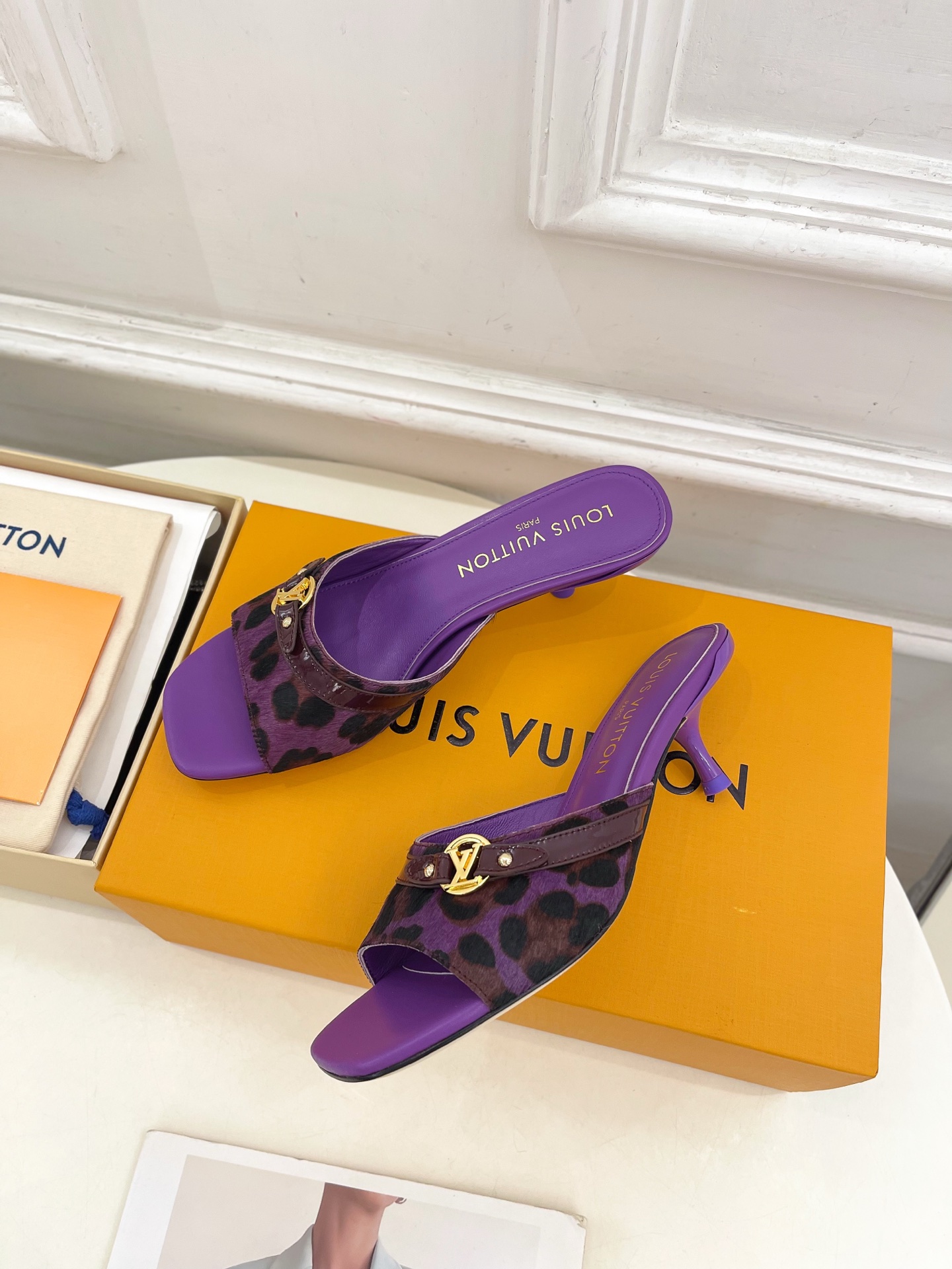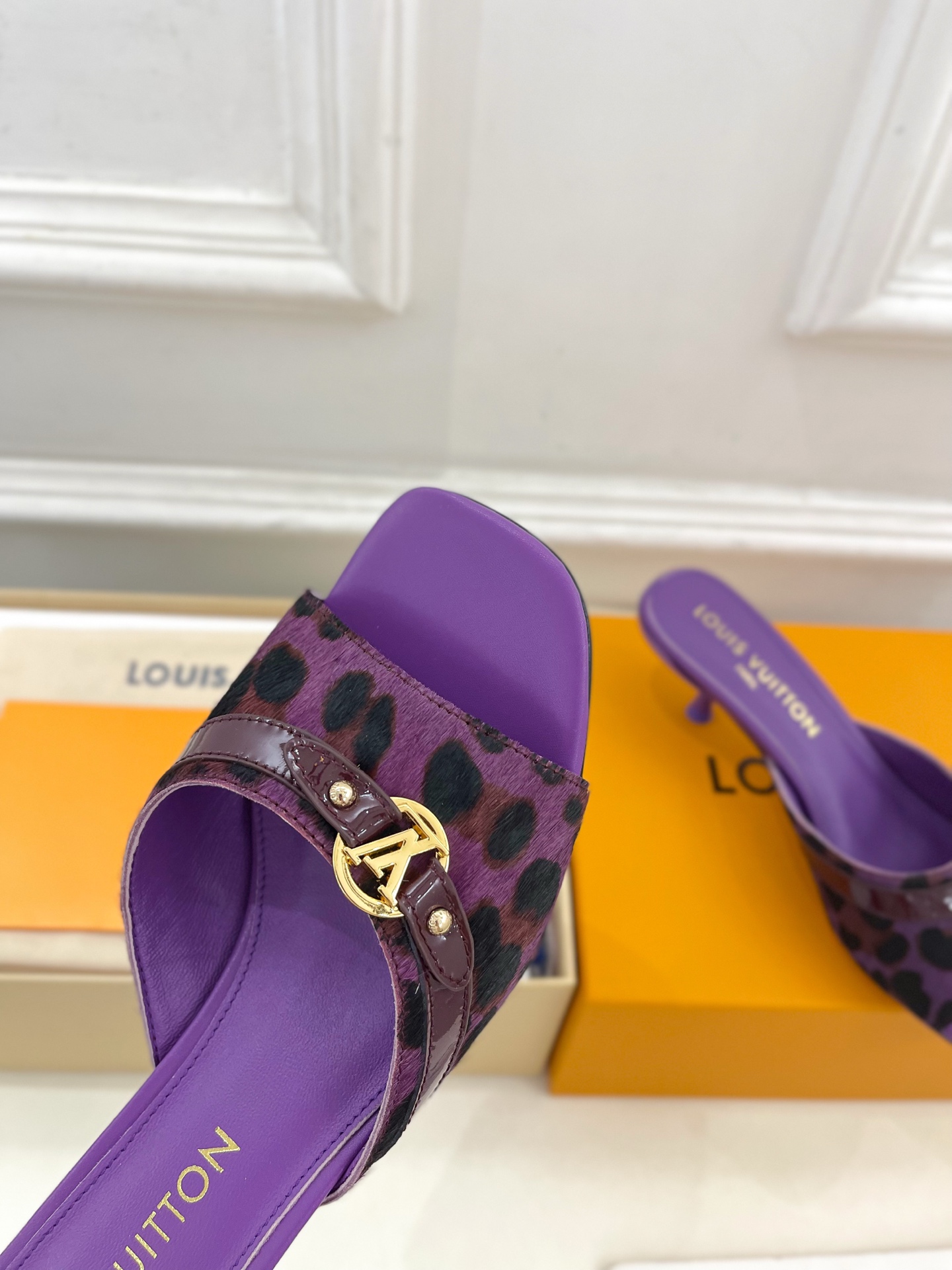Louis Vuitton Purple Slide Sandals with Leopard Print Strap and Gold Buckle