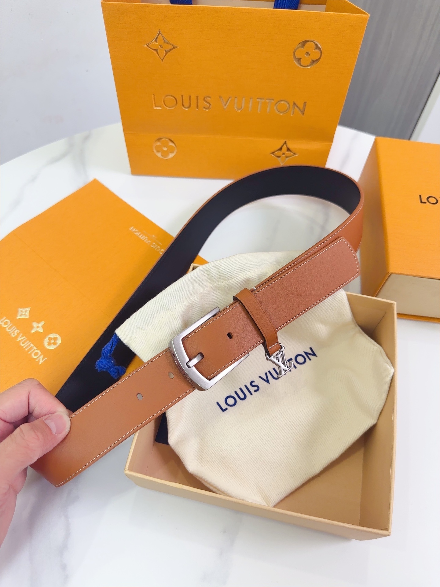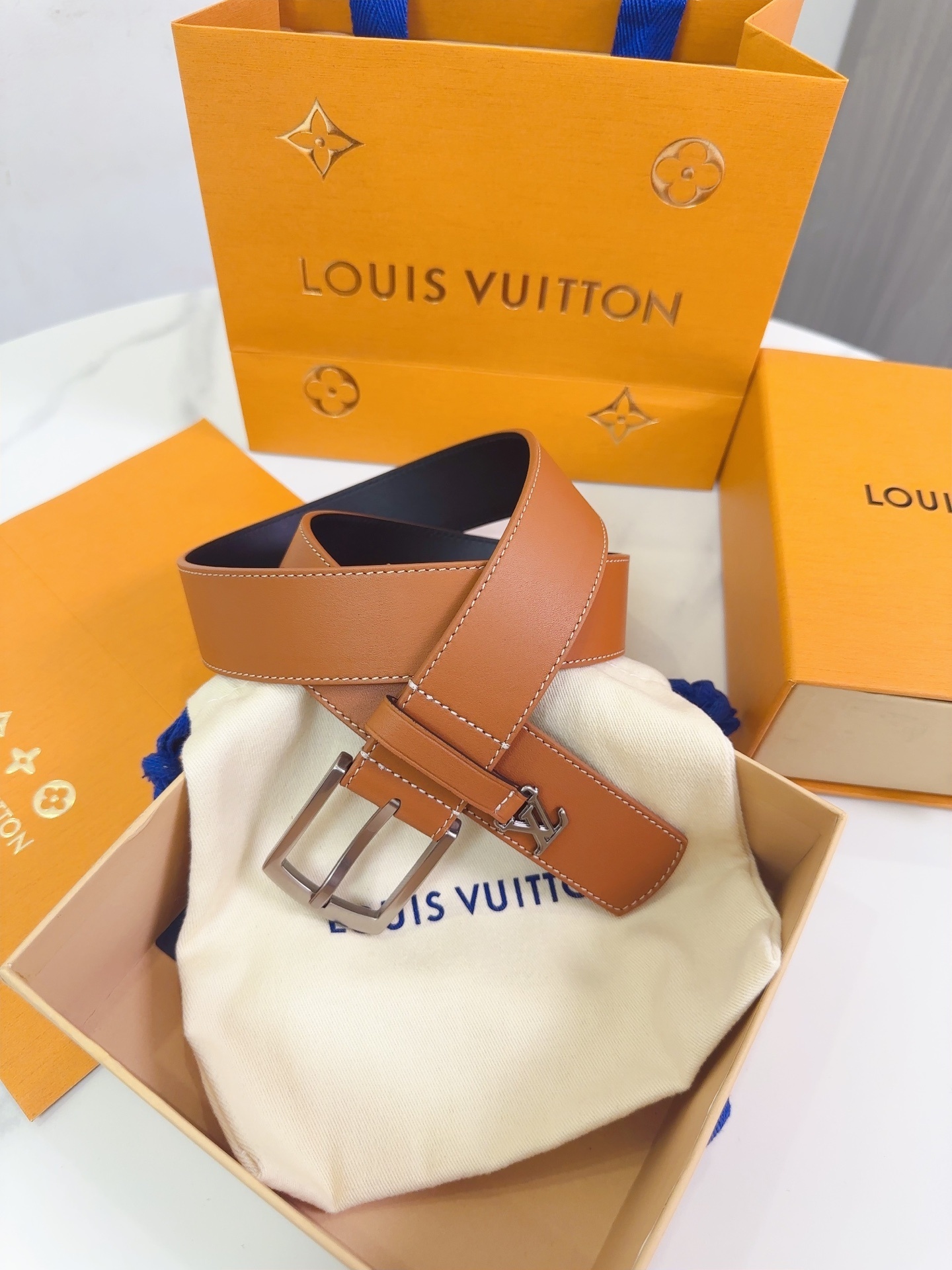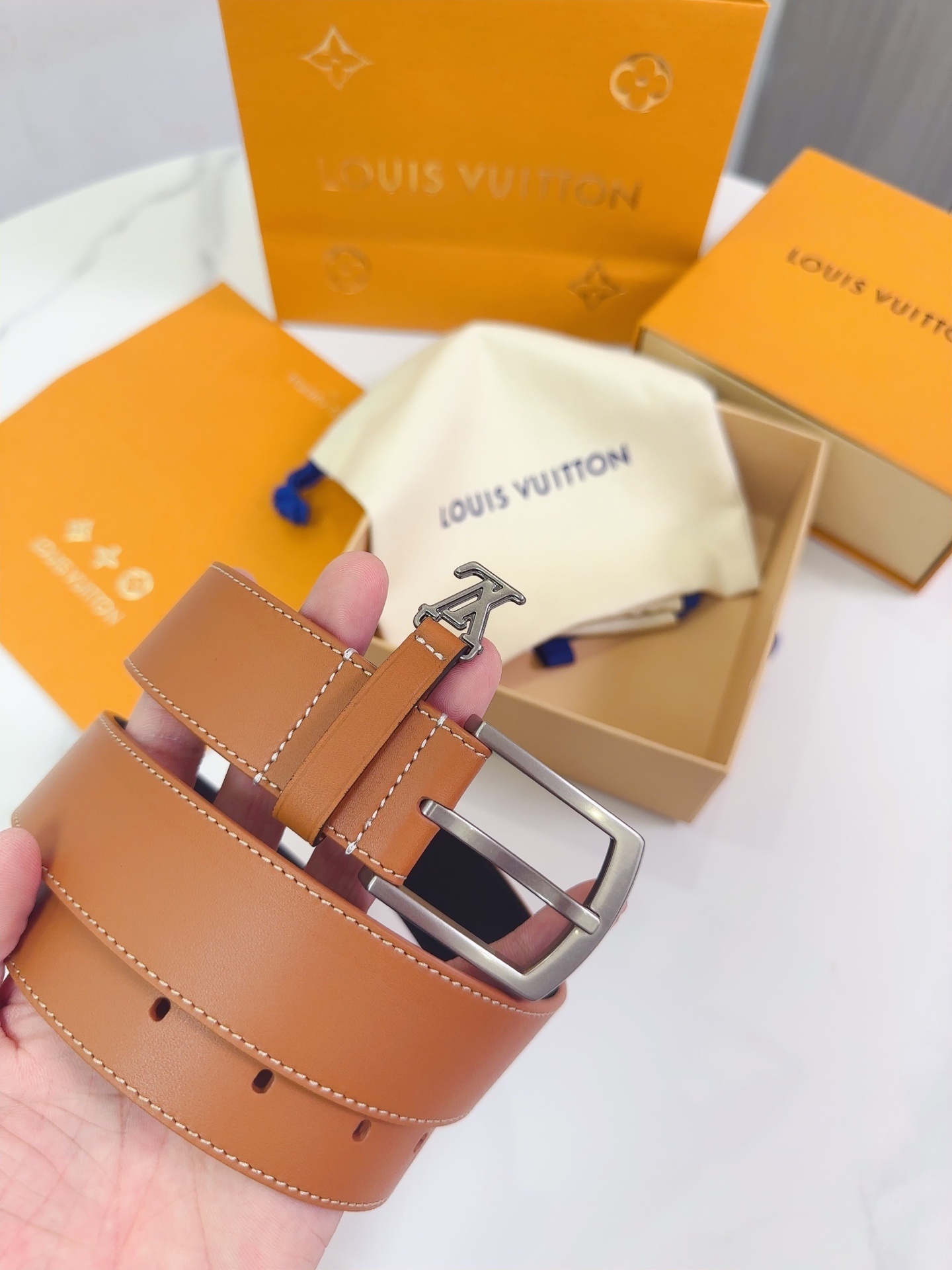 Brown leather belt with gold metal buckle engraved with Miu Miu