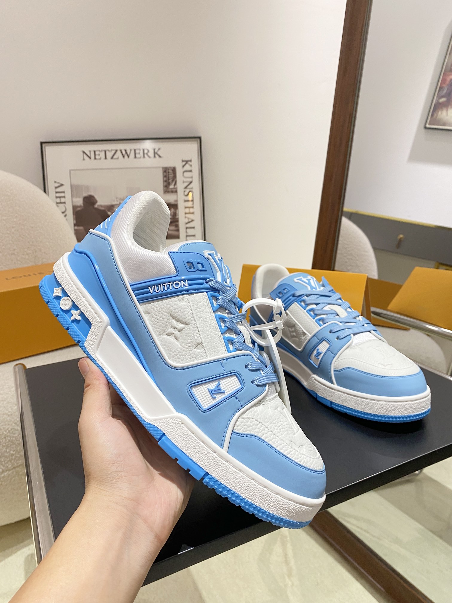 Louis Vuitton Men’s White and Brown Leather Sneakers Monogram Pattern Lace Up Rubber Sole