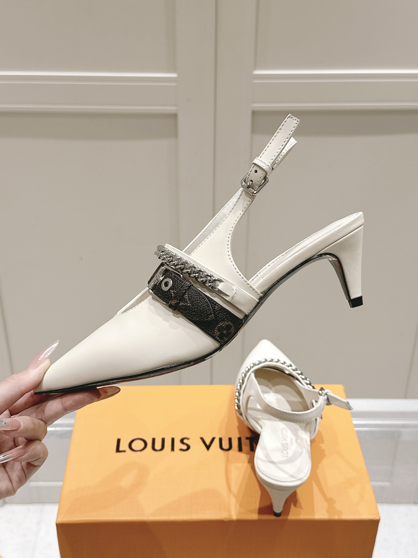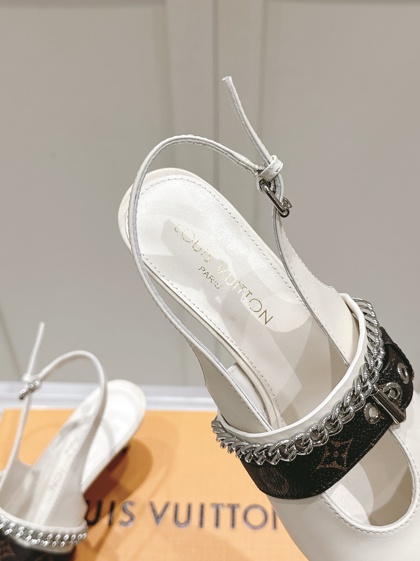 The LV Vibe slingback ballerina is an elegant yet easy-to-wear style in supple lambskin. It is characterized by its pointed toe and striking details: a chunky chain in silver-toned metal and a belt-like strap in Monogram canvas with a Louis Vuitton-engraved buckle. The back strap is fastened with a neat, rectangular buckle.