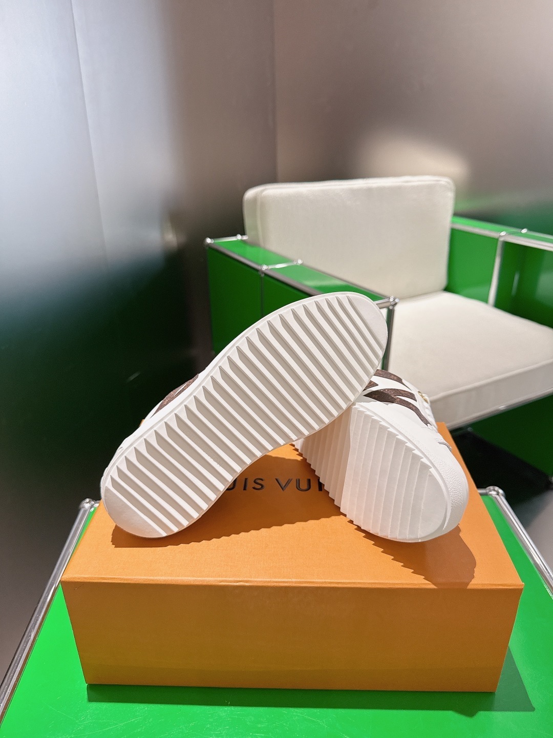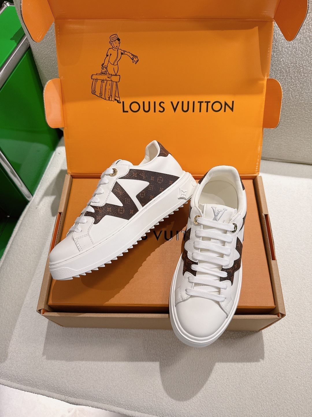 Louis Vuitton Men’s White and Brown Leather Sneakers Monogram Pattern Lace Up Rubber Sole