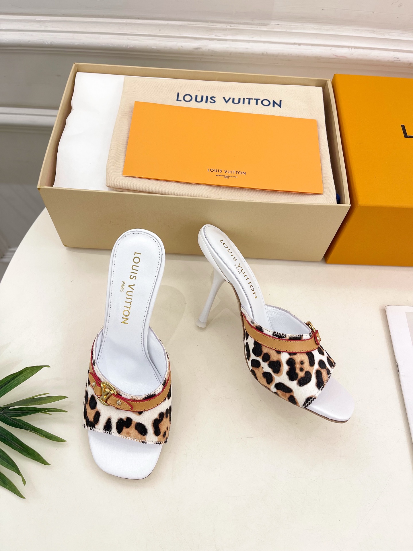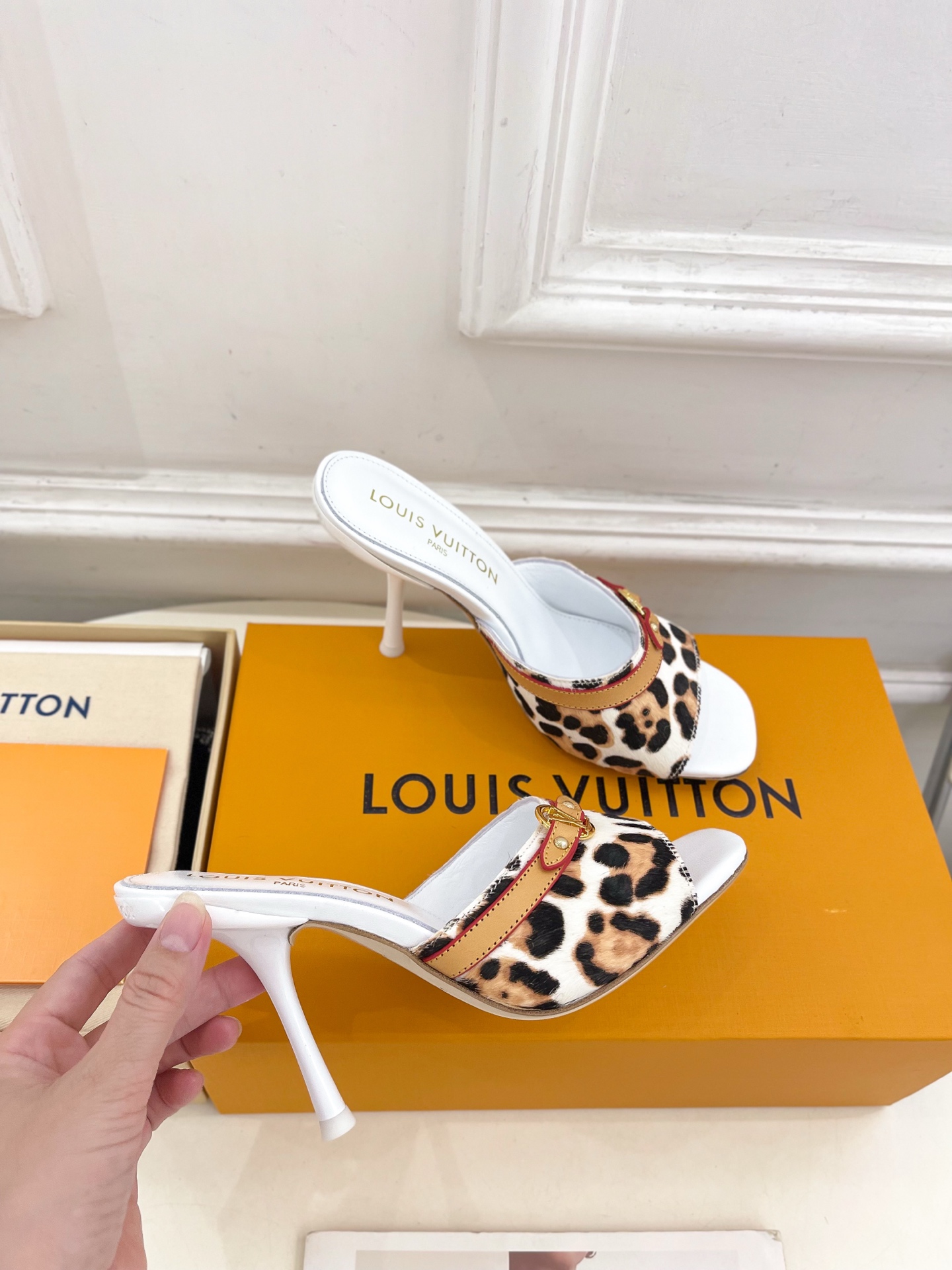 These Louis Vuitton white slides feature a bold leopard print strap accented with a golden LV chain detail, offering a stylish and confident look. Crafted from premium leather with a comfortable cushioned insole, these heels provide both elegance and ease for all-day wear. The open-toe design and square heel shape add a modern touch, making them perfect for summer outings, parties, or casual chic styling.