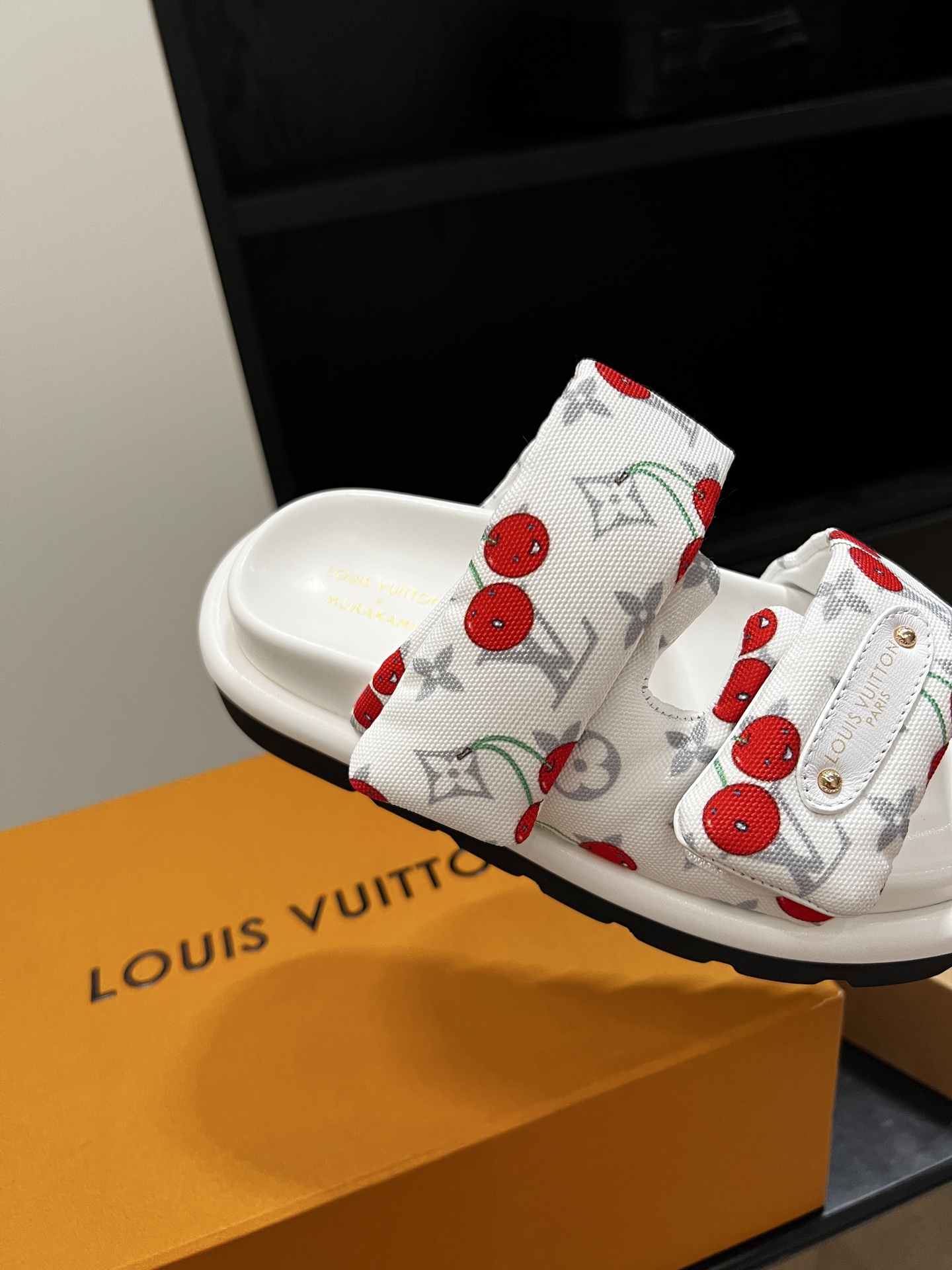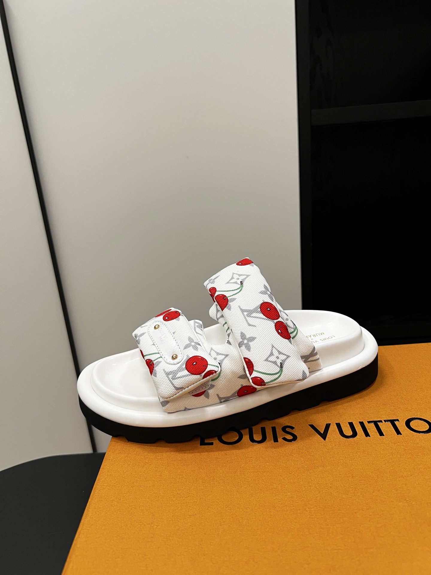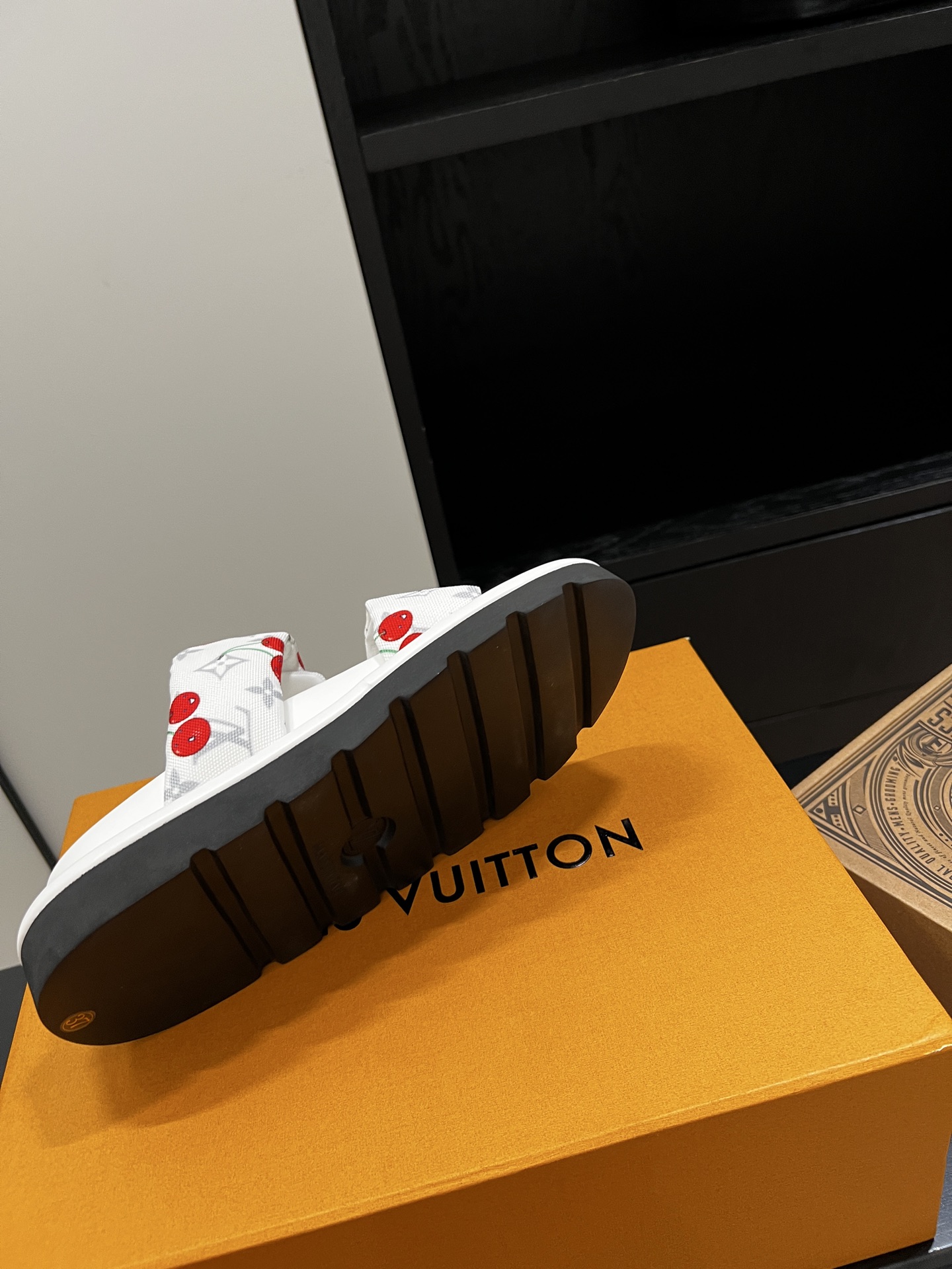 Louis Vuitton White Slide Sandals with Red Cherry Print