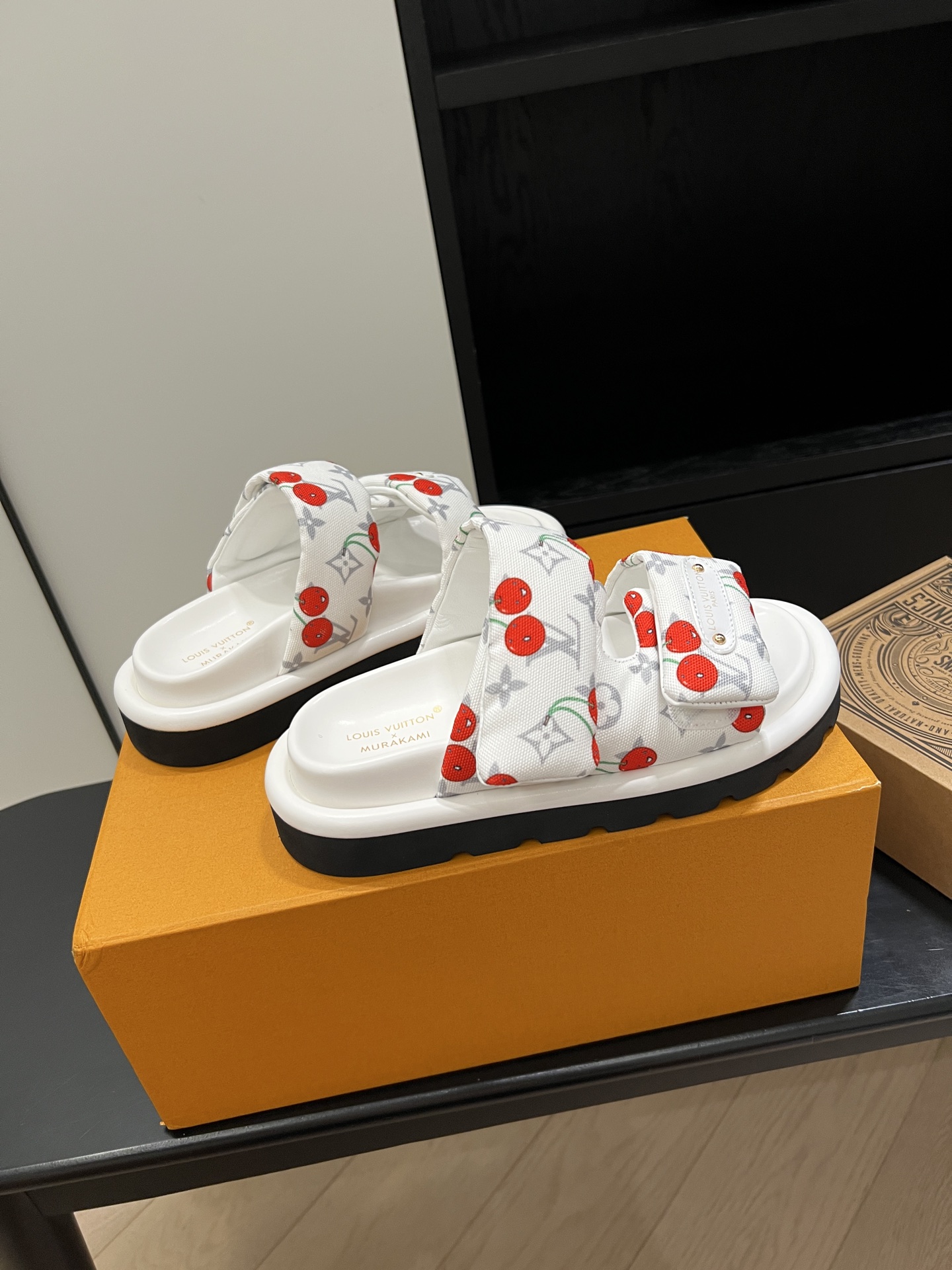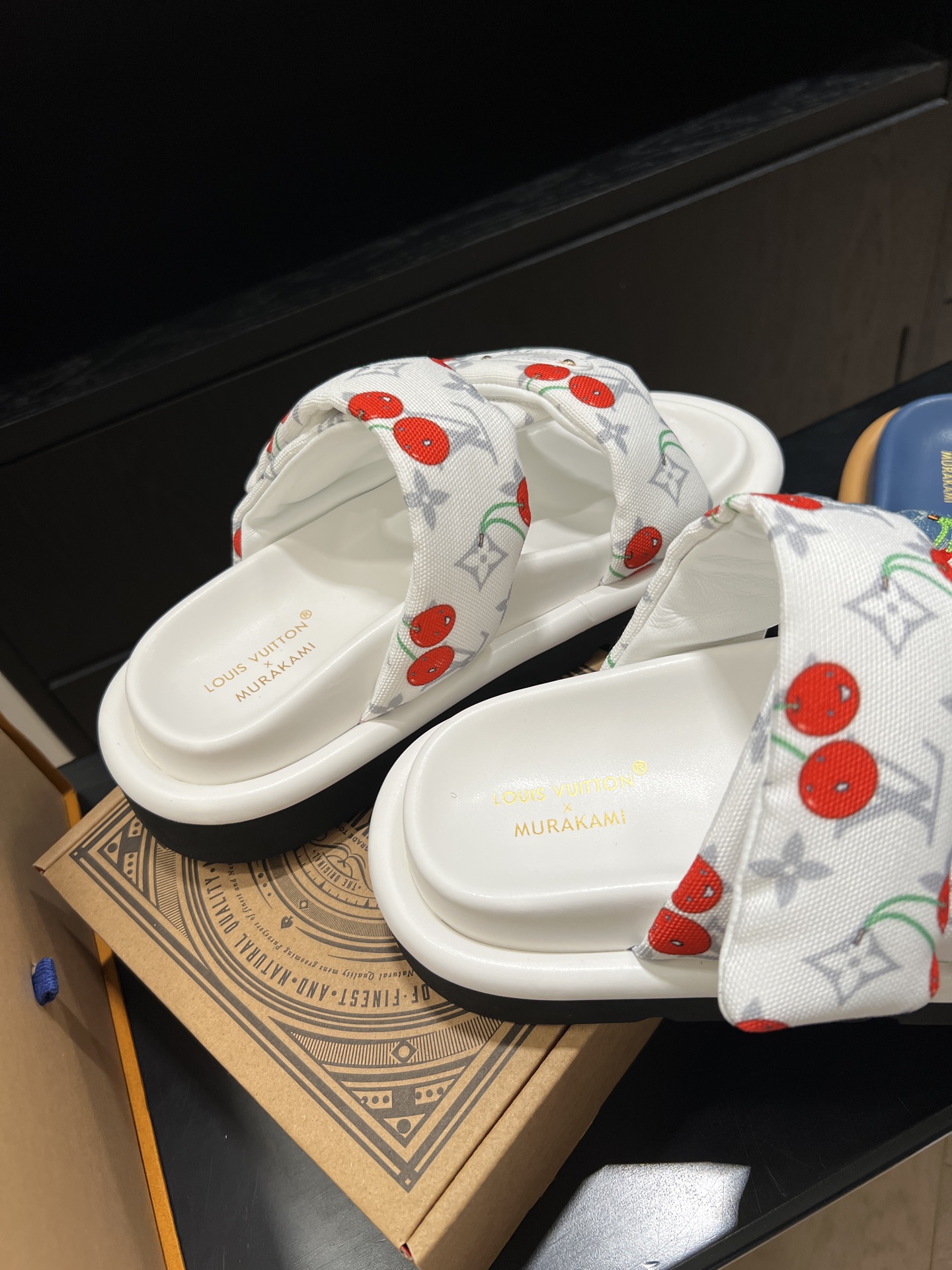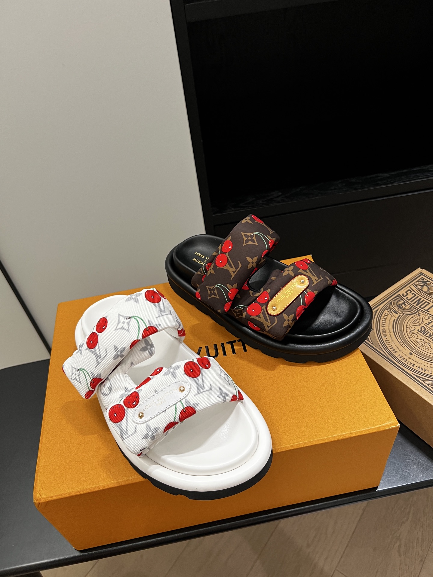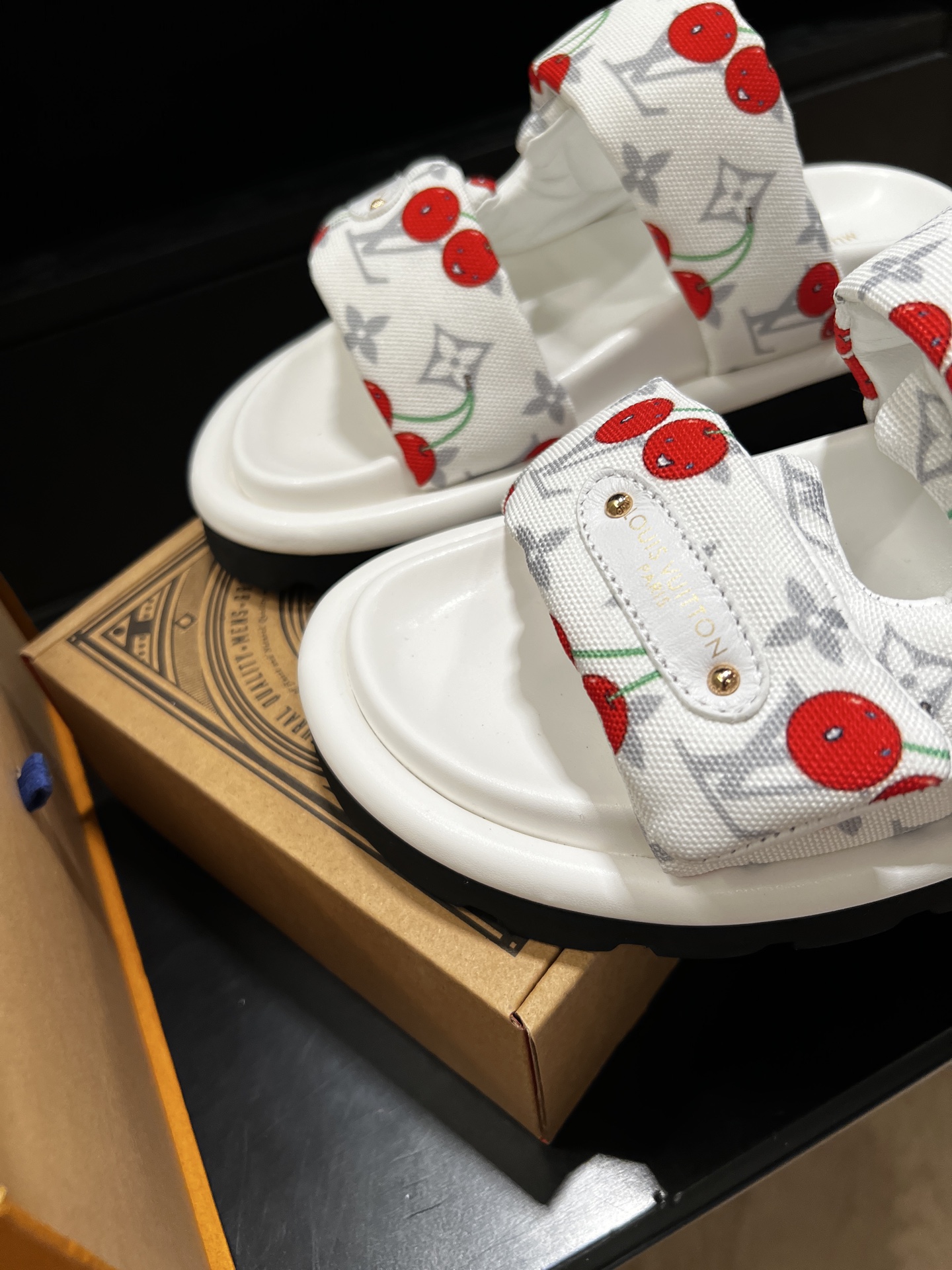 Louis Vuitton White Slide Sandals with Red Cherry Print