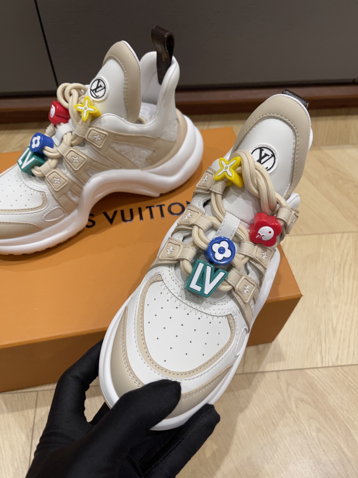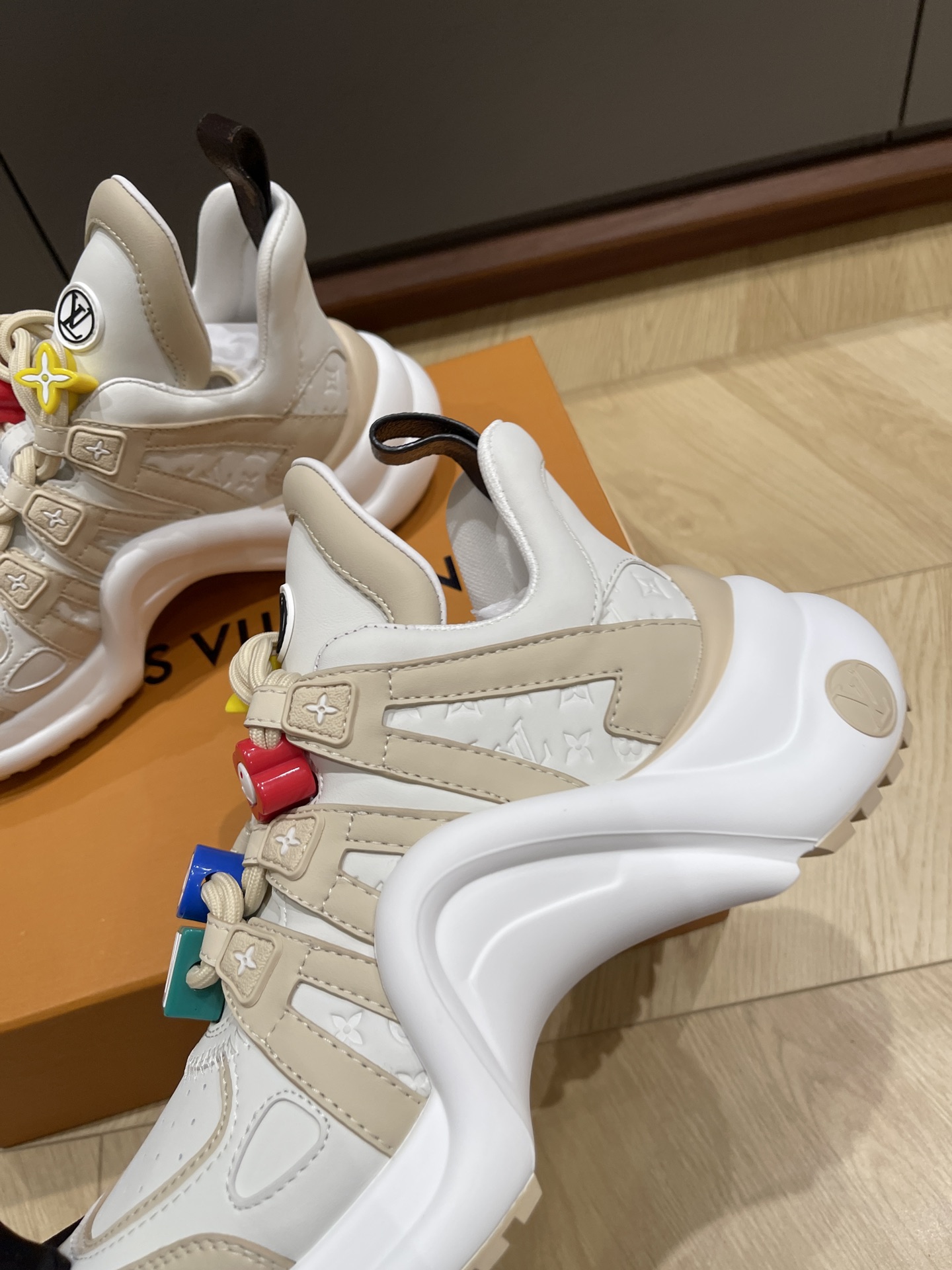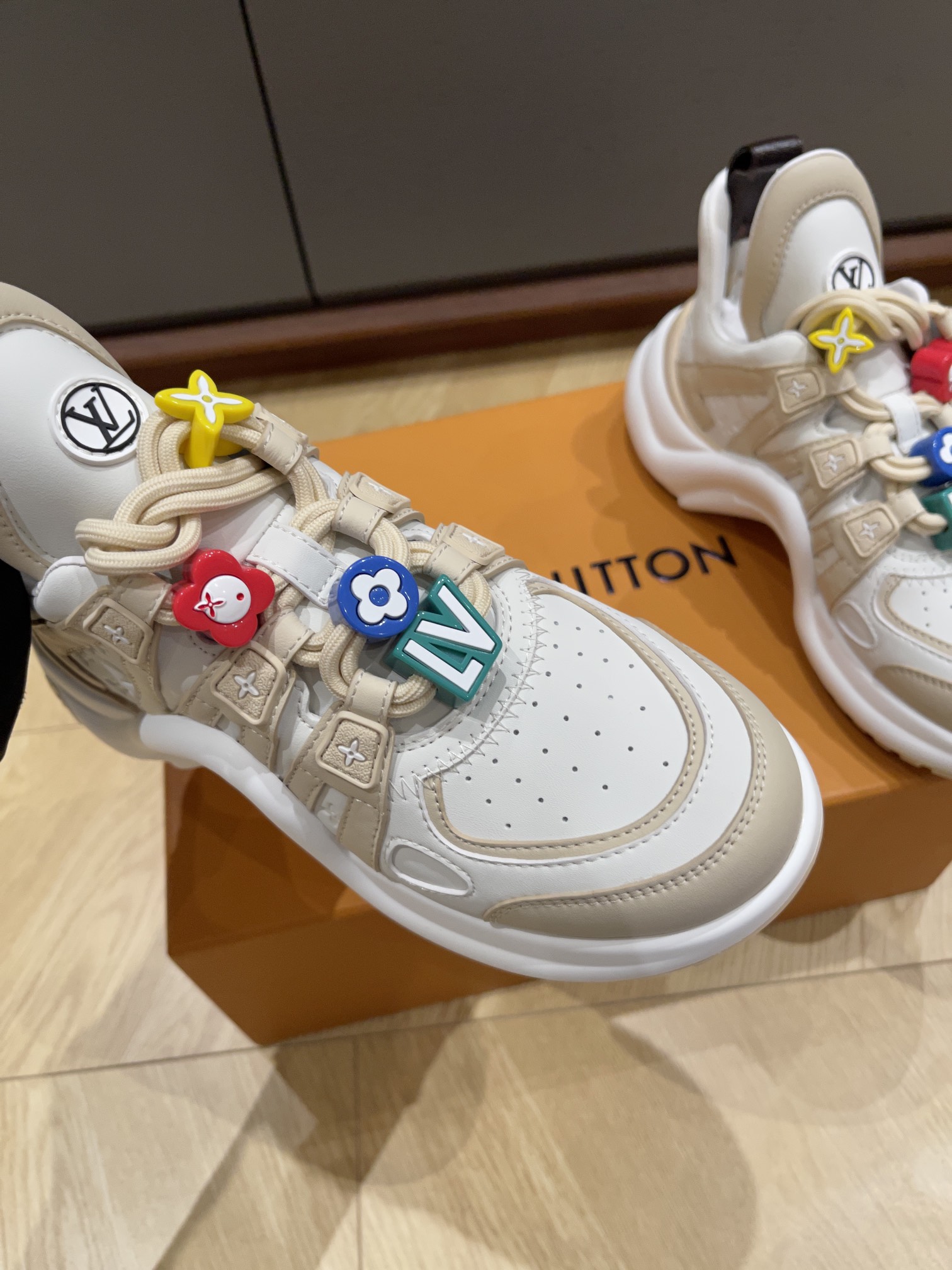 These Louis Vuitton white trainer sneakers combine sporty comfort with playful elegance. Crafted from premium leather and mesh, the shoes feature a clean white base accented with beige tones and signature LV branding. The standout detail is the colorful charm decorations on the laces, including the iconic LV initials and monogram flower motifs in vibrant red, yellow, blue, and green — adding a youthful, fashion-forward touch.