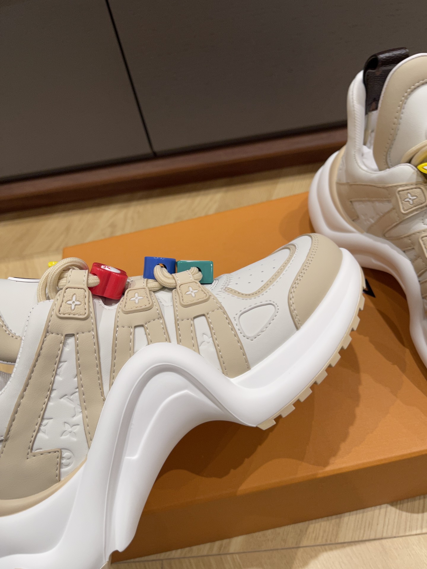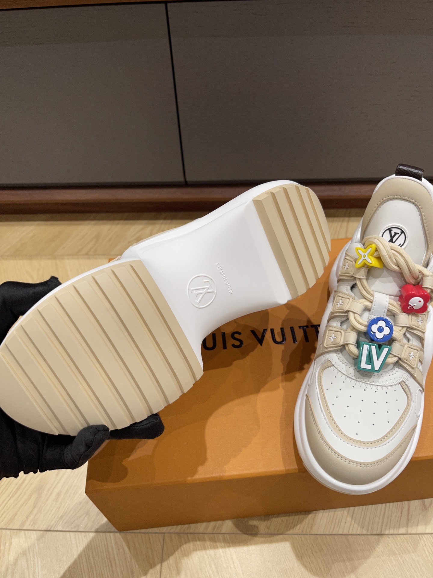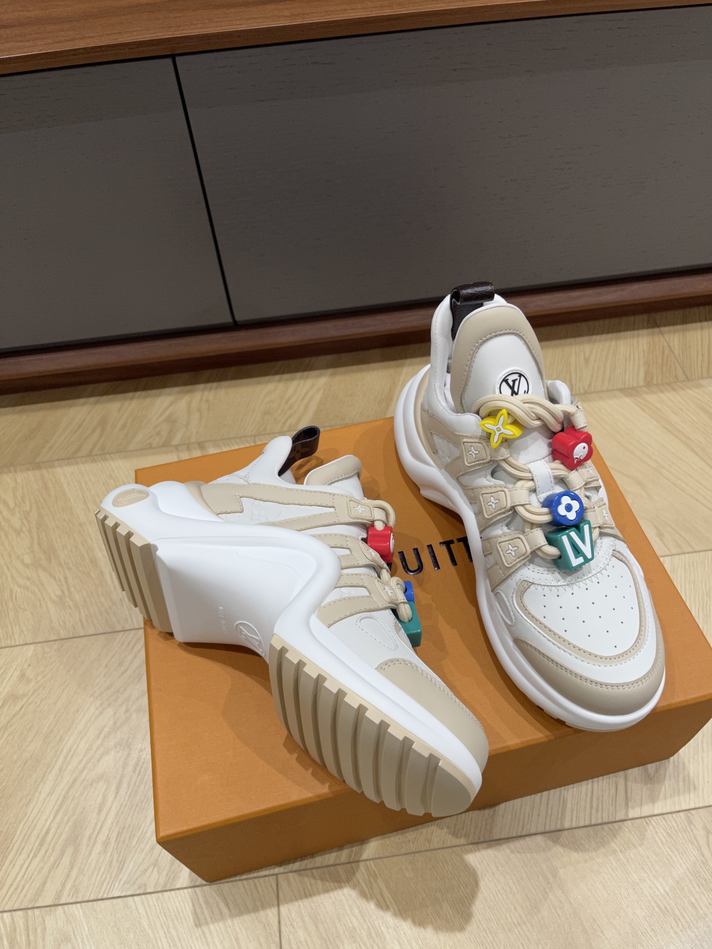 These Louis Vuitton white trainer sneakers combine sporty comfort with playful elegance. Crafted from premium leather and mesh, the shoes feature a clean white base accented with beige tones and signature LV branding. The standout detail is the colorful charm decorations on the laces, including the iconic LV initials and monogram flower motifs in vibrant red, yellow, blue, and green — adding a youthful, fashion-forward touch.