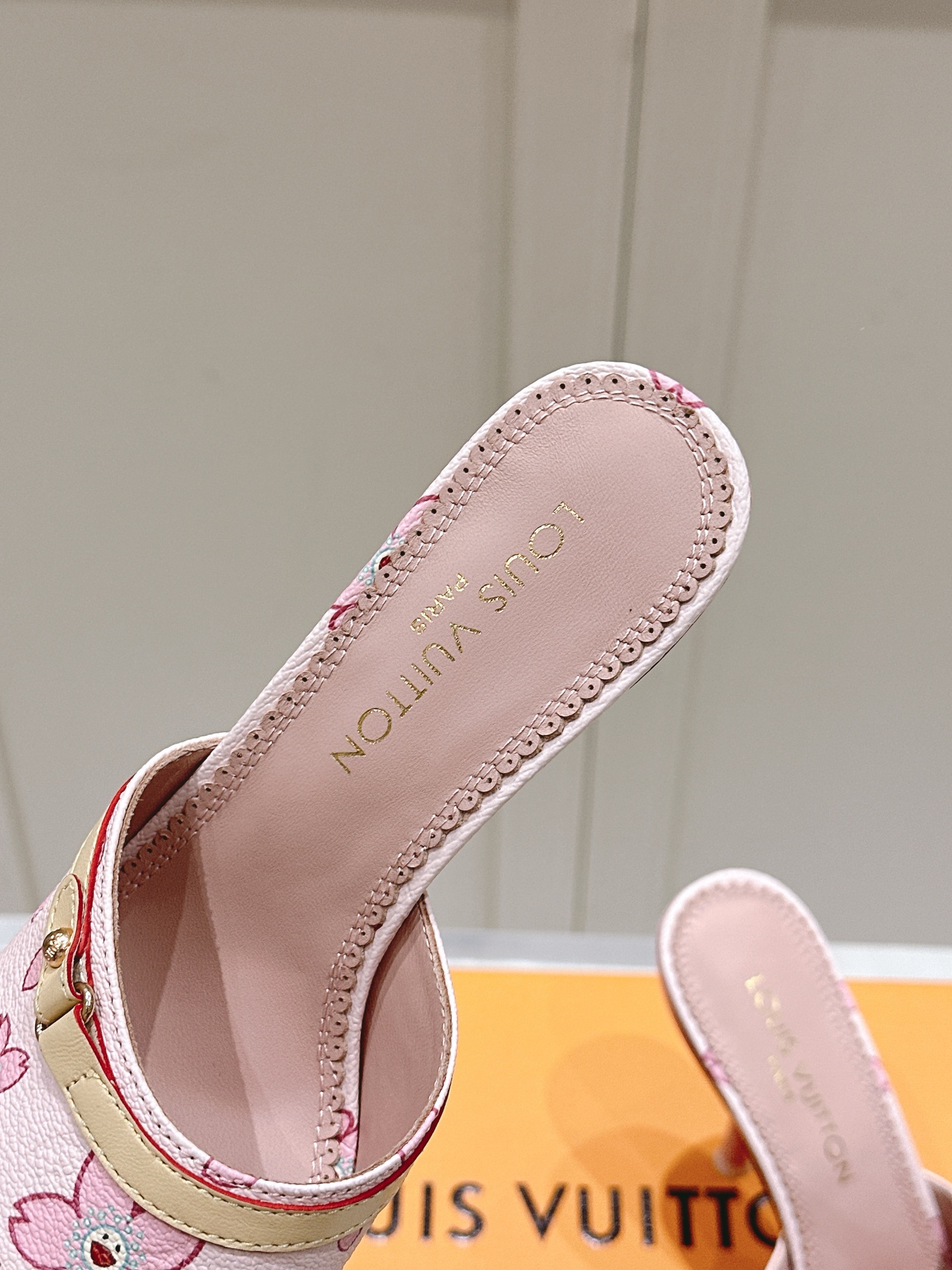 These Louis Vuitton women’s slide sandals feature a charming pink monogram canvas decorated with floral motifs for a feminine and stylish touch. The open-toe design and small block heel provide both elegance and comfort, making them perfect for daily wear or casual outings.