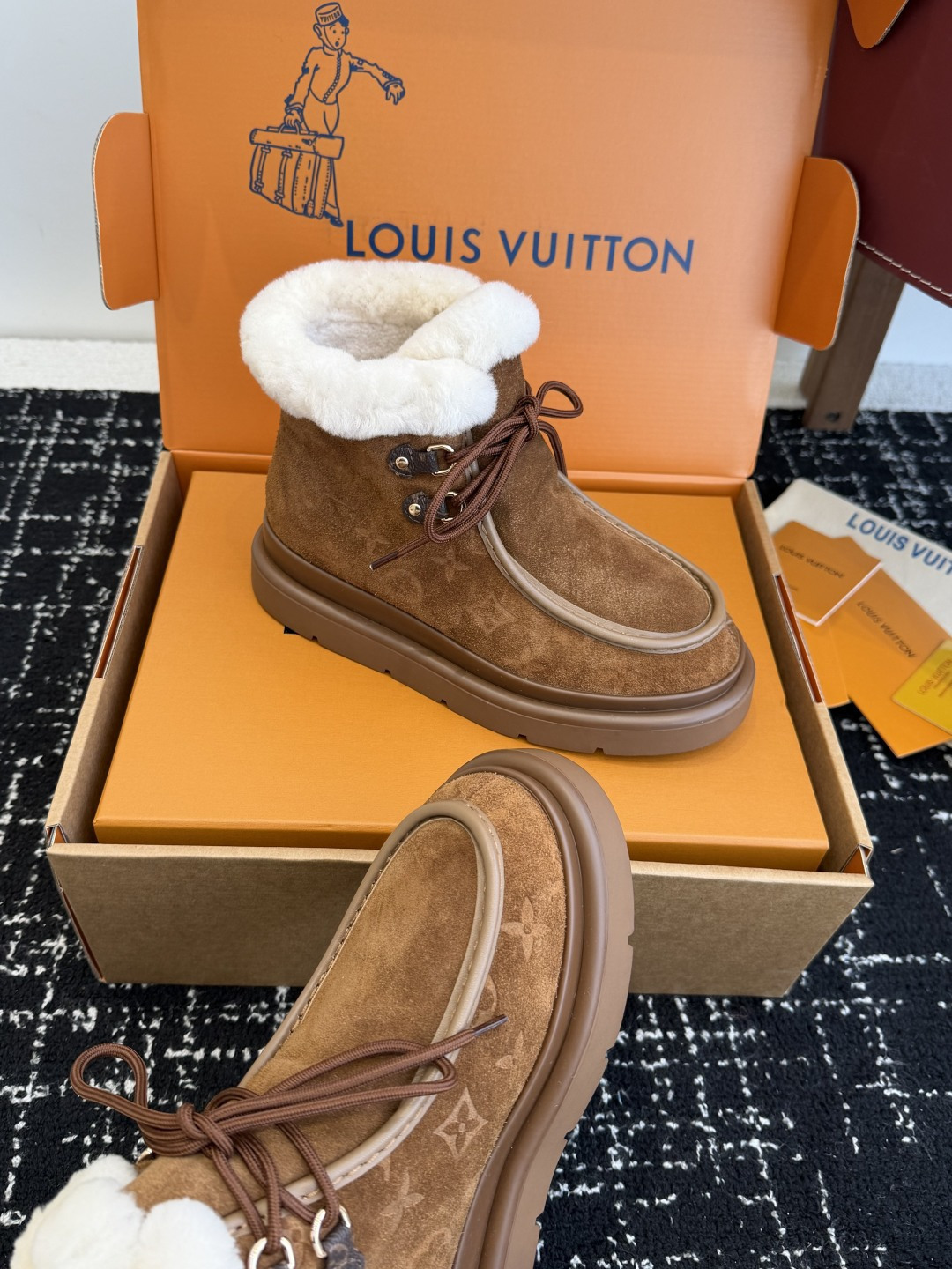 Louis Vuitton Men’s White and Brown Leather Sneakers Monogram Pattern Lace Up Rubber Sole