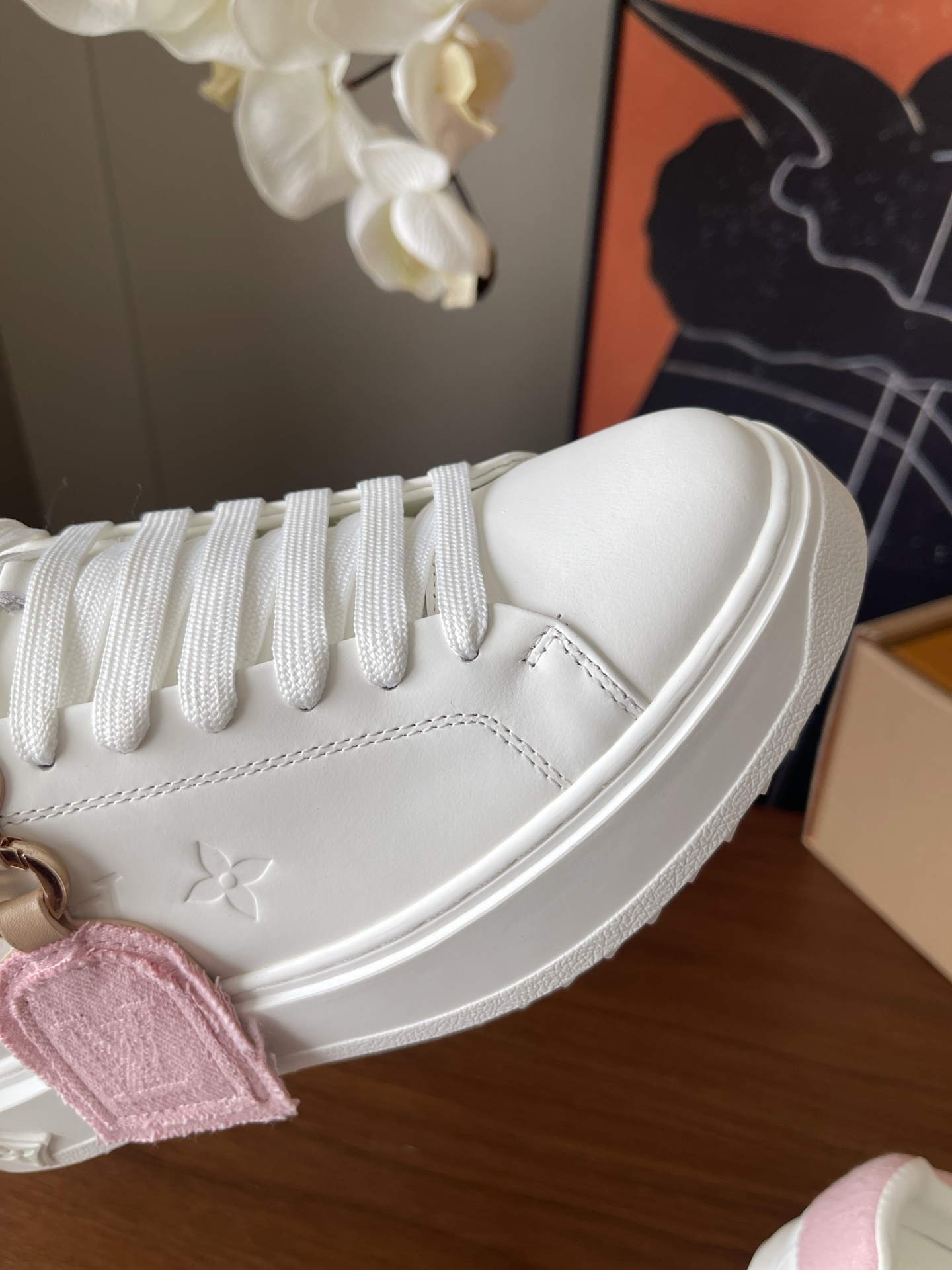 What sets this pair apart is the delicate pink accents on the heel tab and the matching decorative tag. The tongue features the prestigious Louis Vuitton signature in gold-tone lettering, adding a touch of glamour to your everyday footwear.