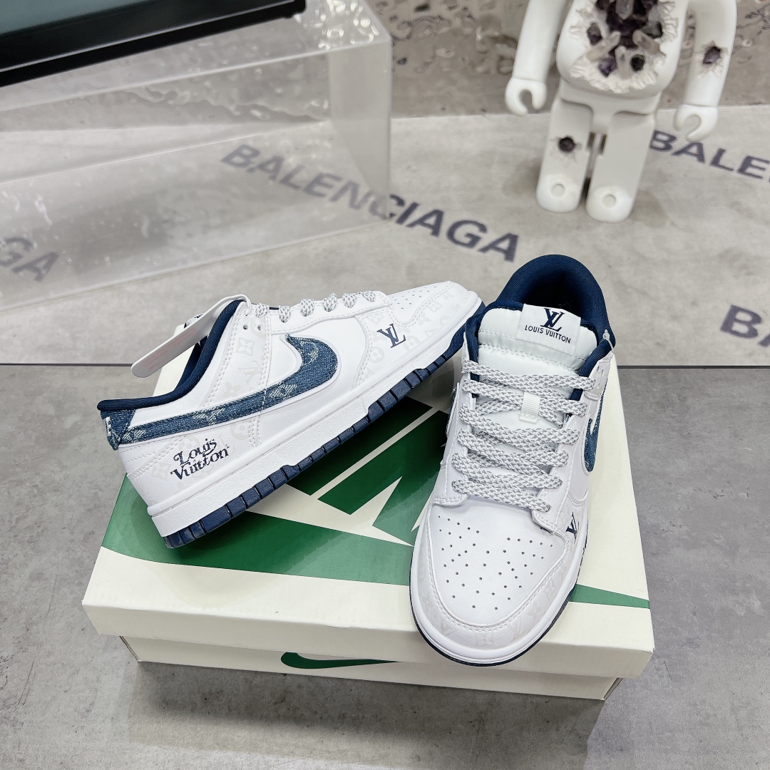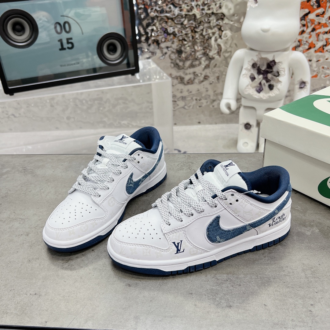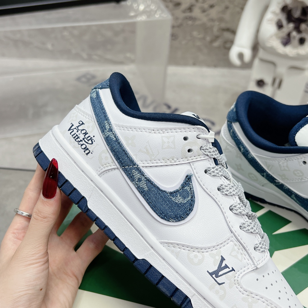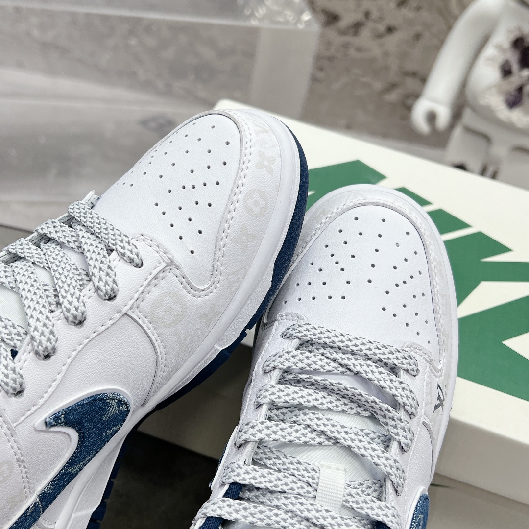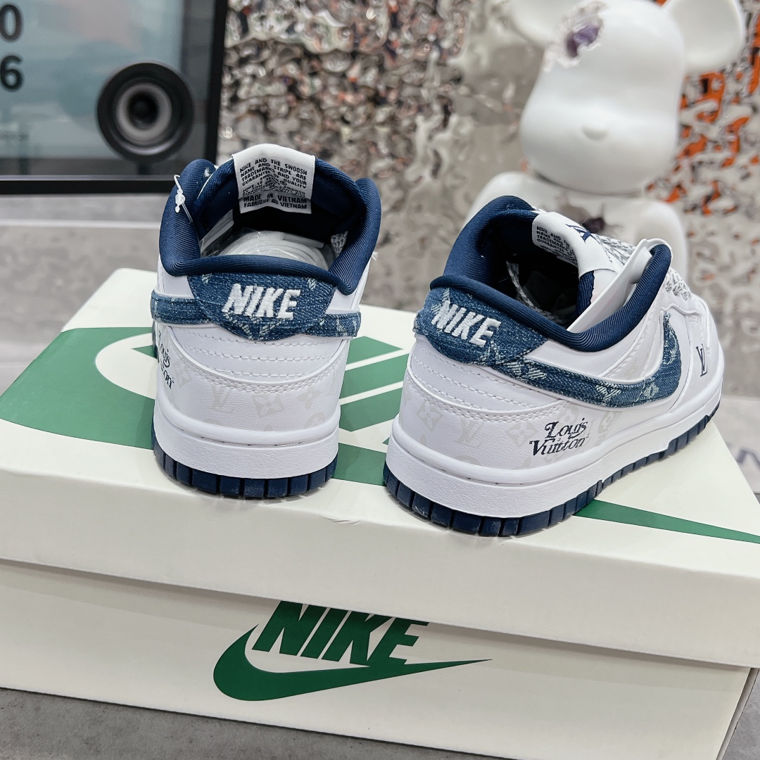 Features iconic LV and Nike detailing for a luxury-sport fusion