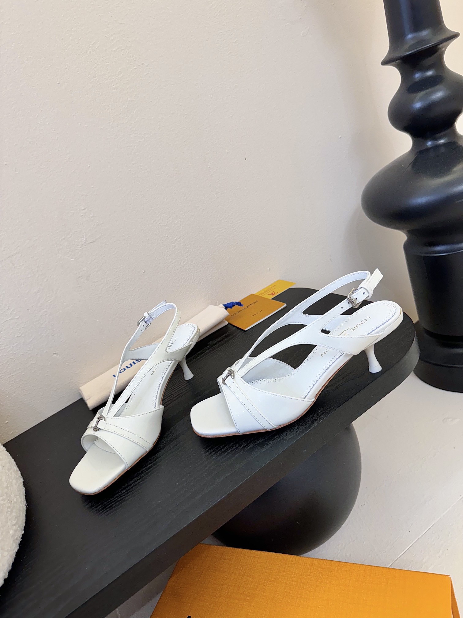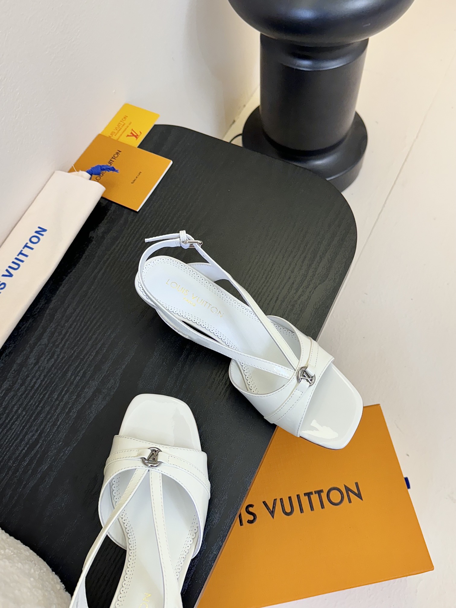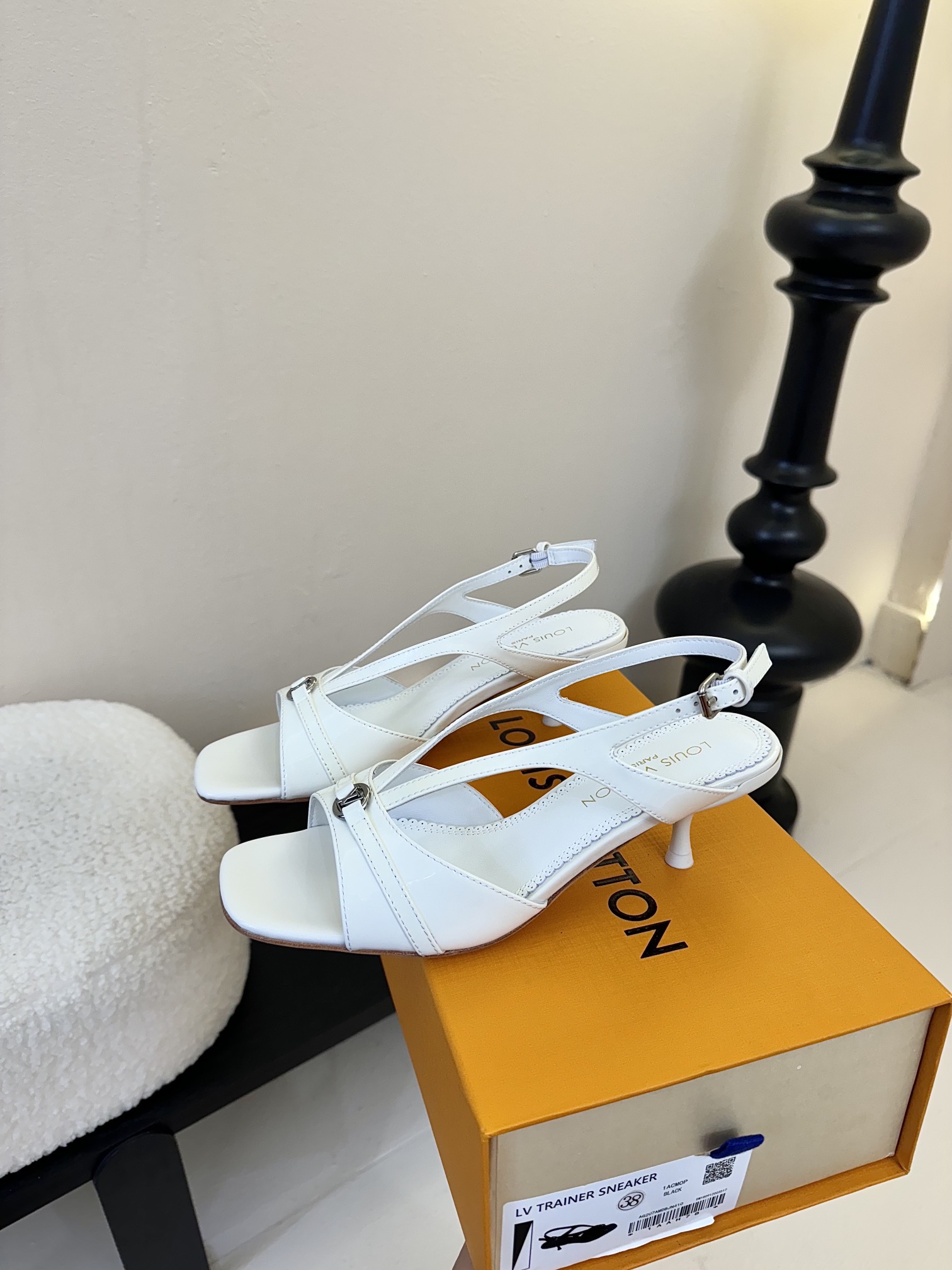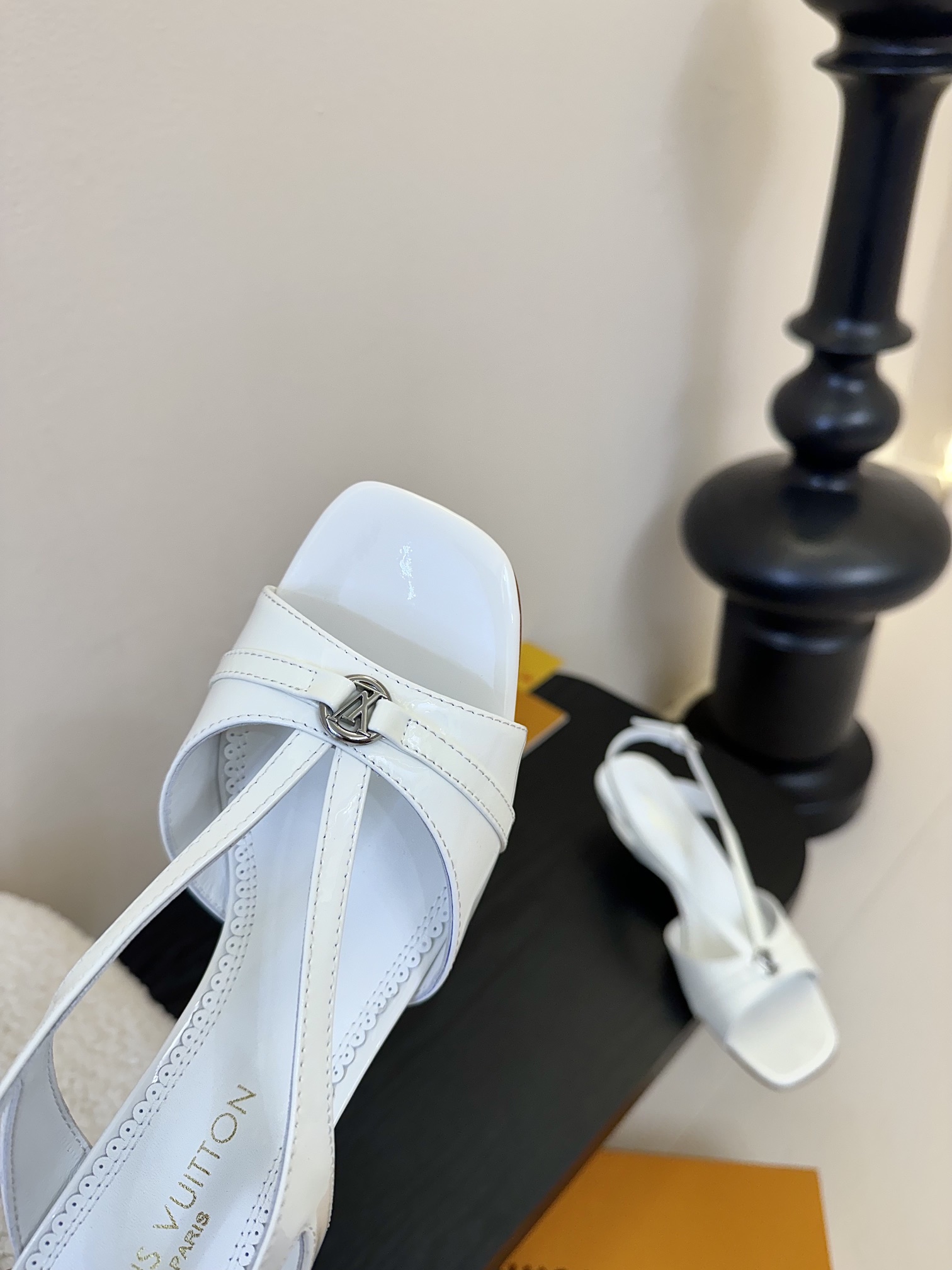 The elegant design of the 6AM sandal is complemented by high-shine patent calf leather. This model has a wide front strap, which is embellished with an LV Circle accessory, and a slender back strap, which is adjusted with a tiny, silver-toned buckle. It is finished with a feminine kitten heel.