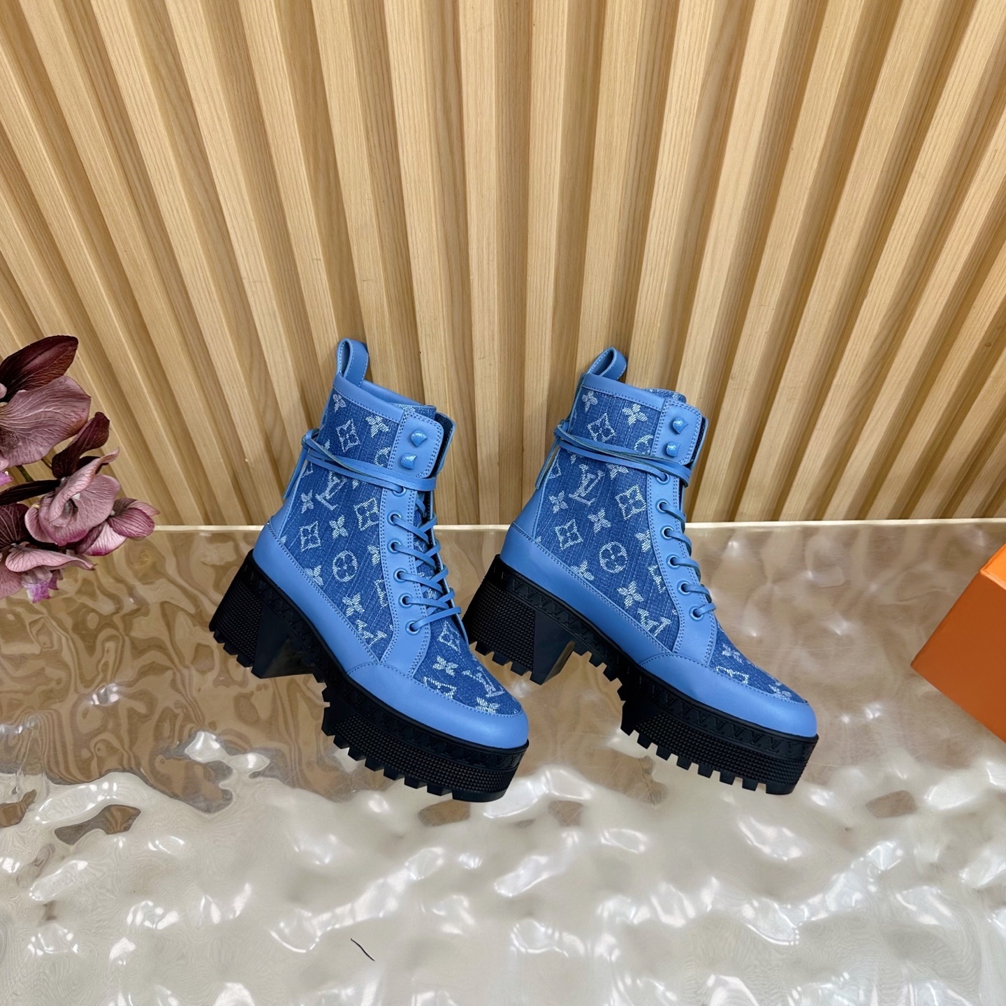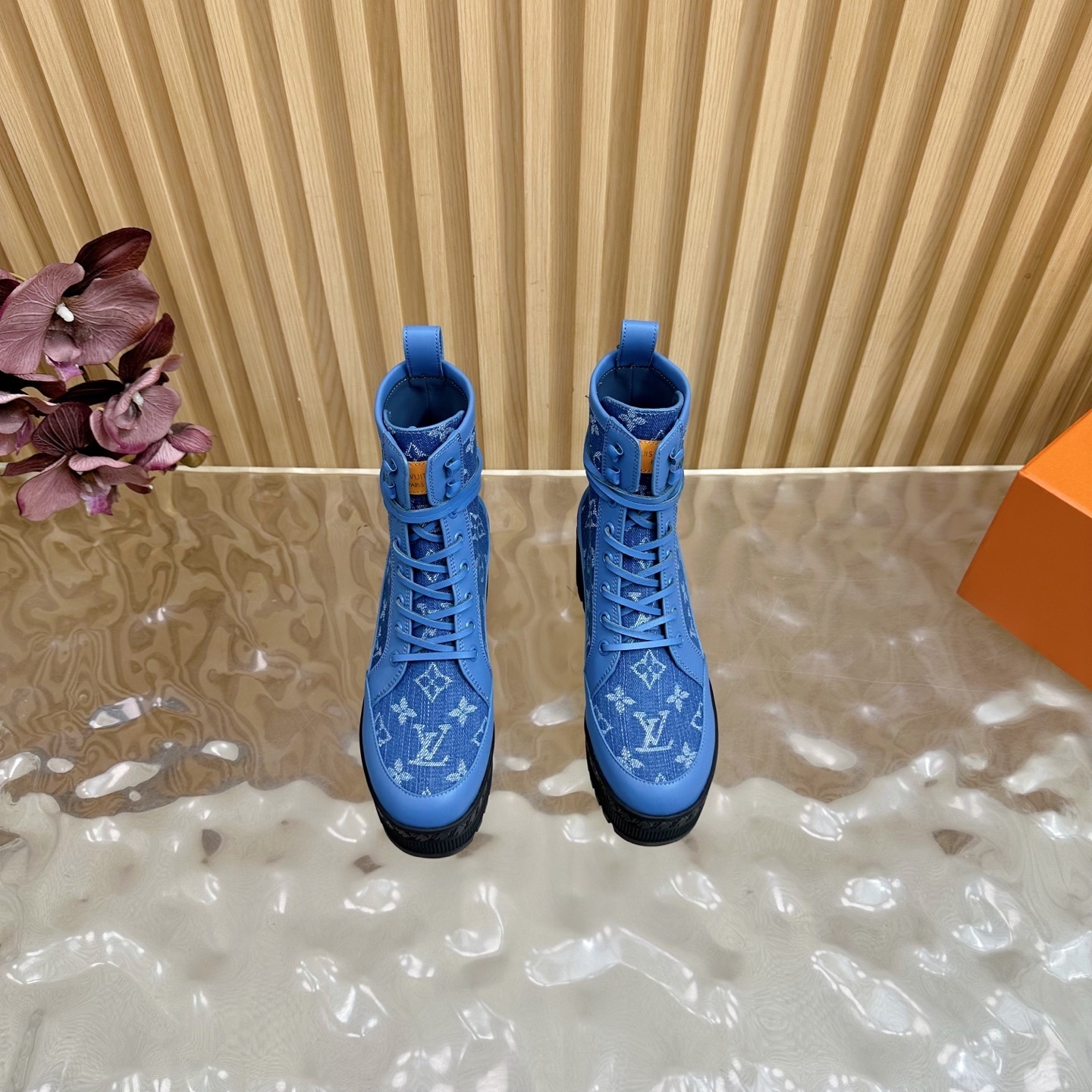 Louis Vuitton Men’s Blue Denim Sandals Cherry Monogram Pattern Adjustable Straps Rubber Sole