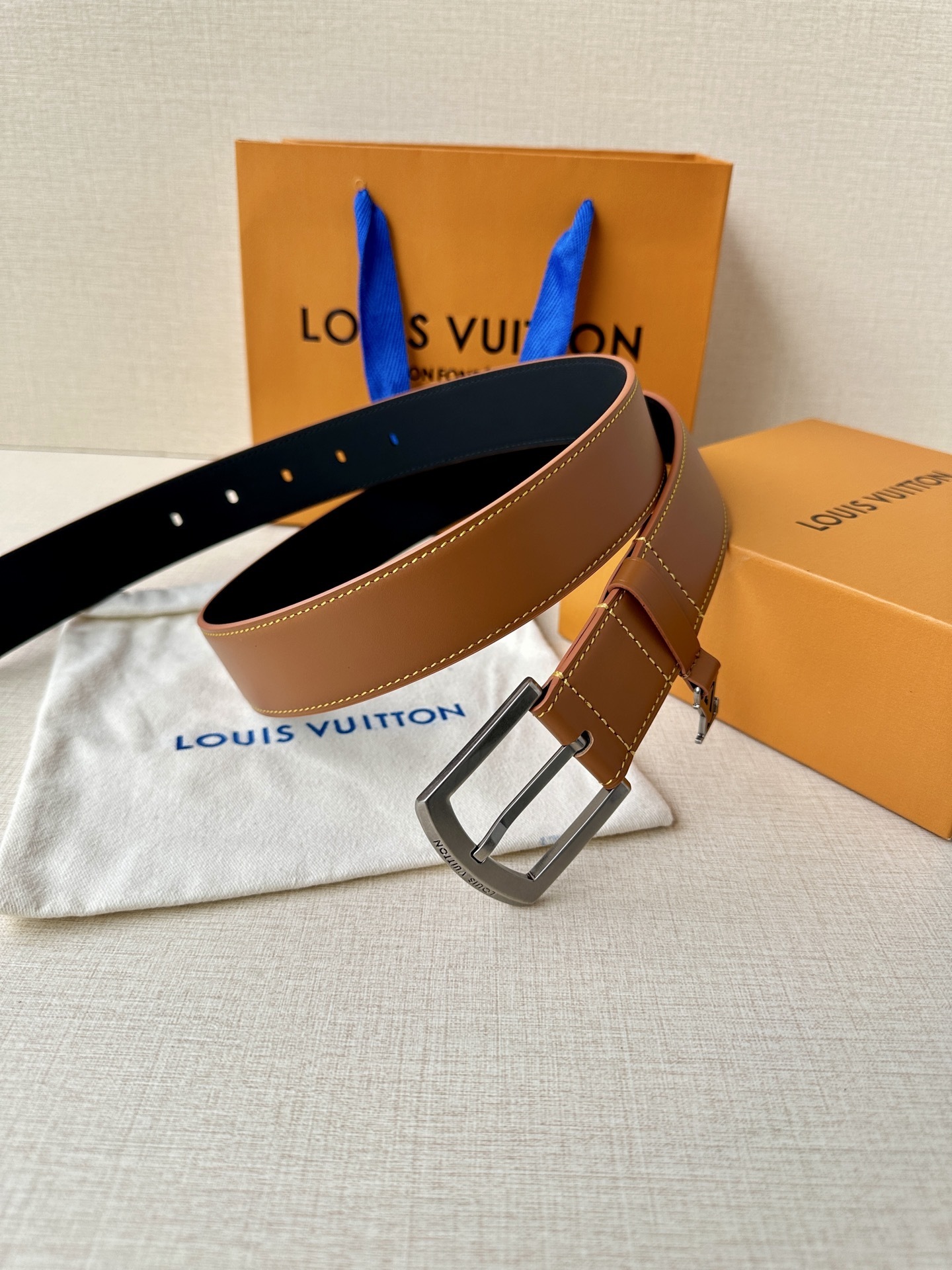 • Iconic Hardware: Equipped with a sleek, brushed silver-tone buckle prominently engraved with the "Louis Vuitton" signature.