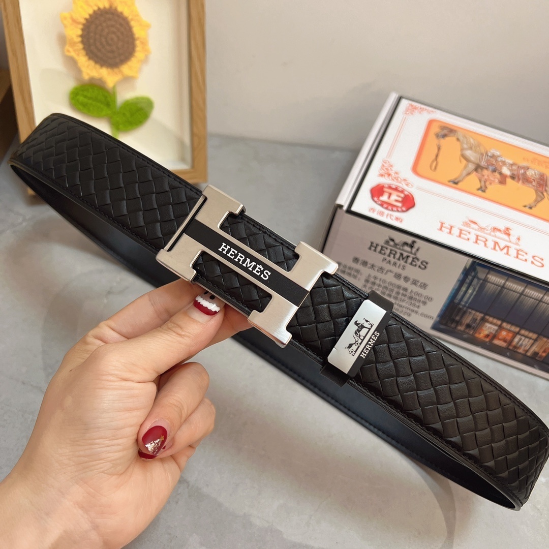 Luxury Men's Black Woven Leather Belt with Iconic Silver H Buckle