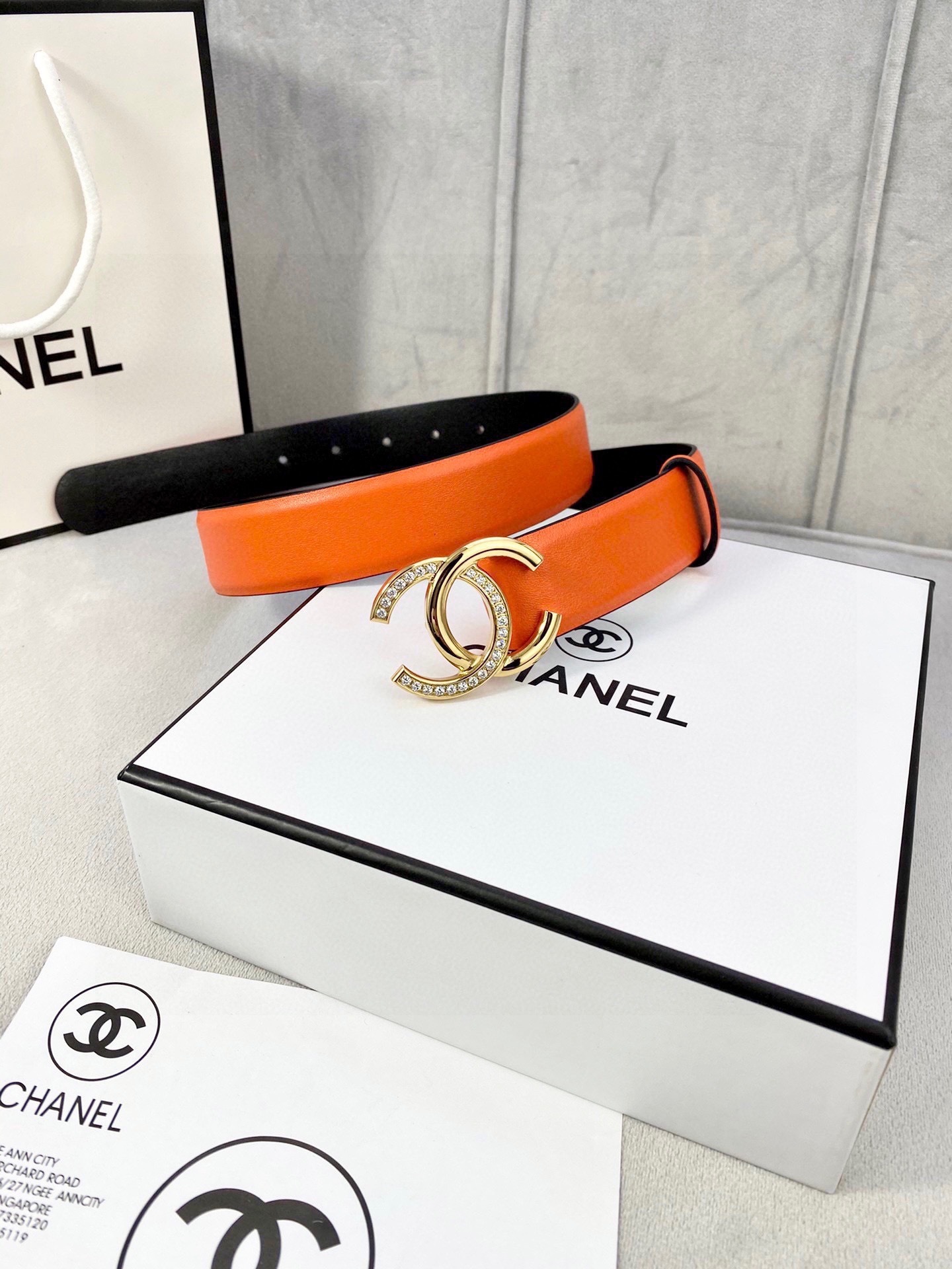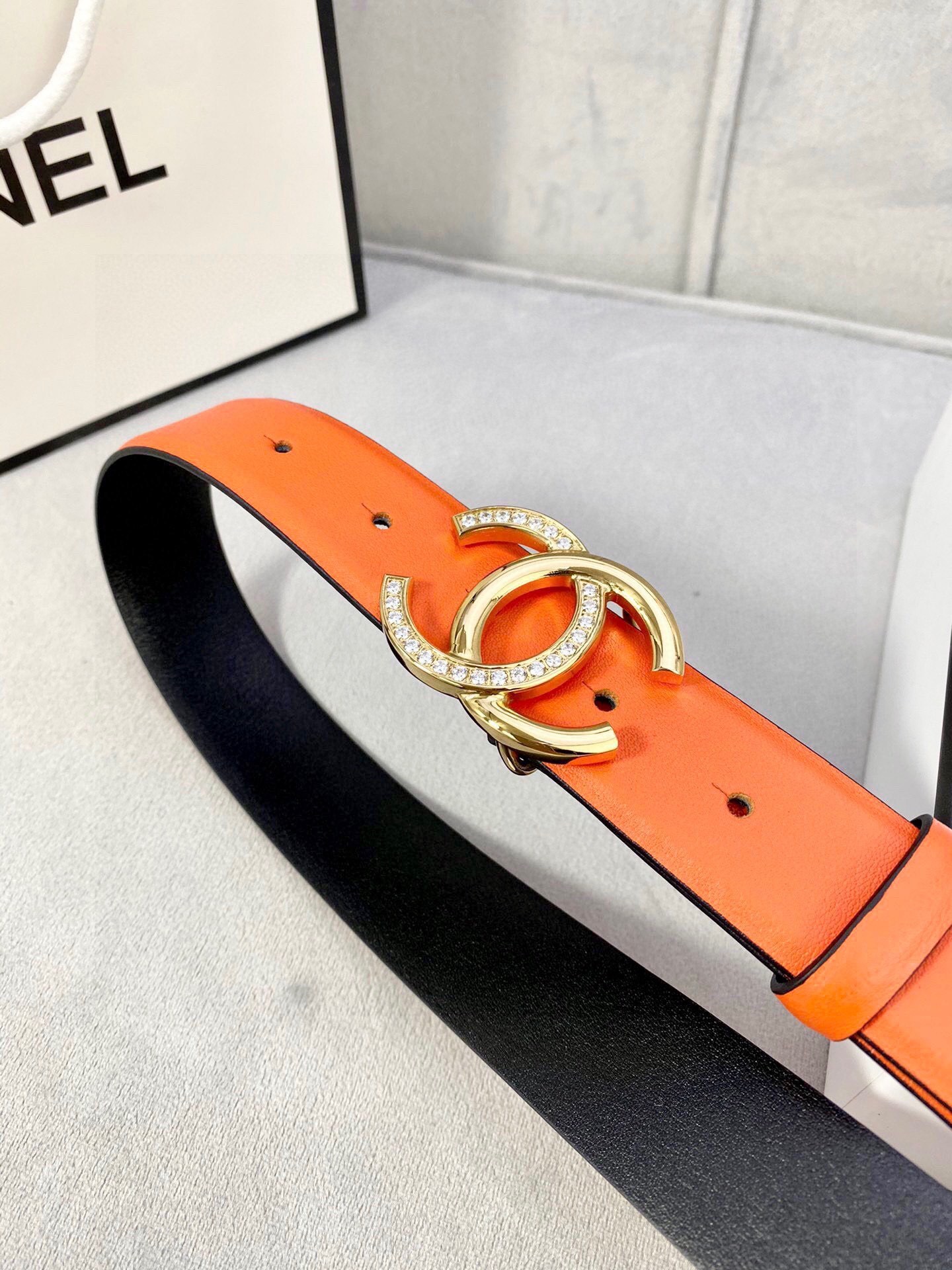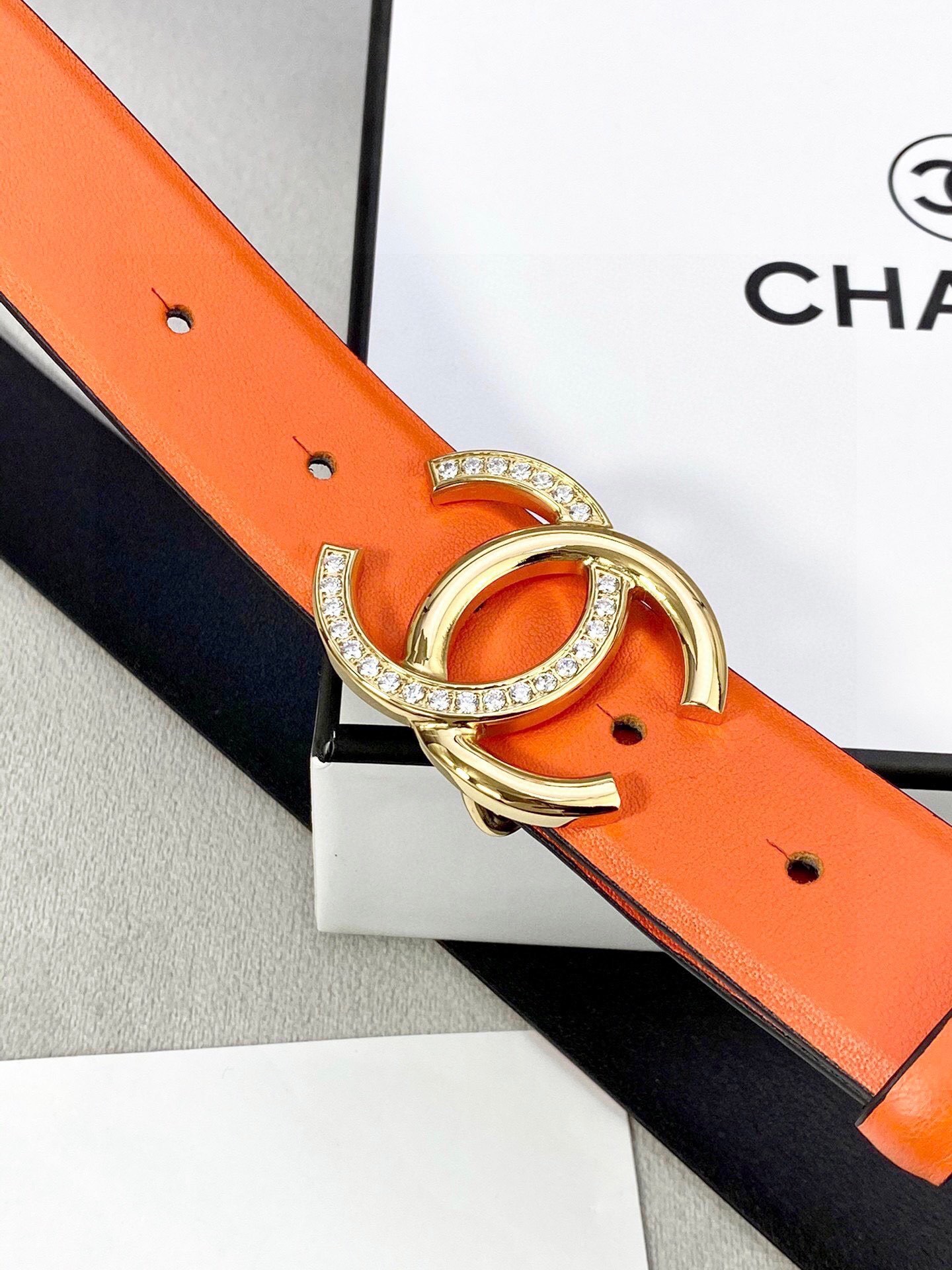 Step into the spotlight with an accessory that defines luxury. Order your Crystal CC Orange Leather Belt today and redefine your signature style!