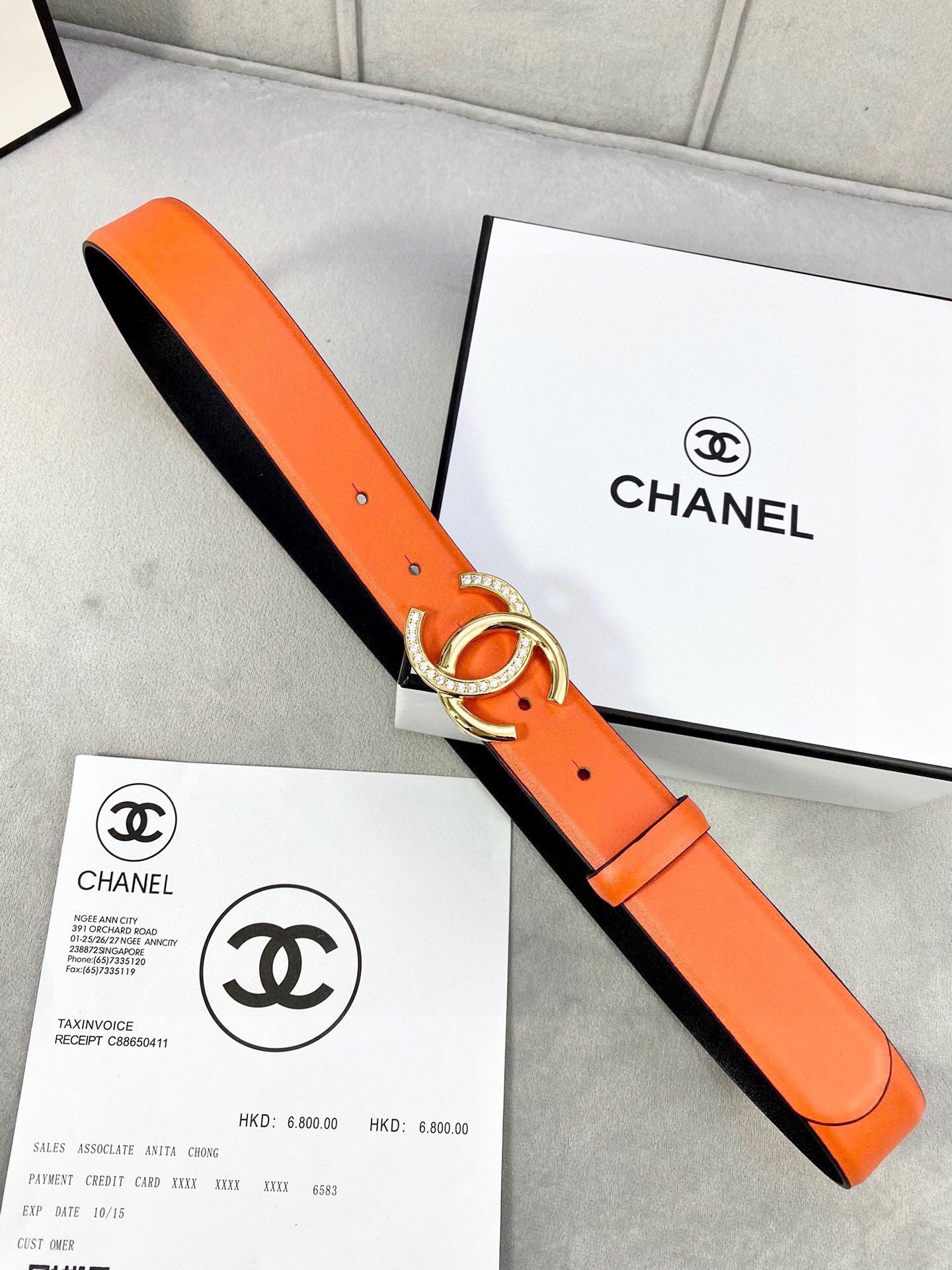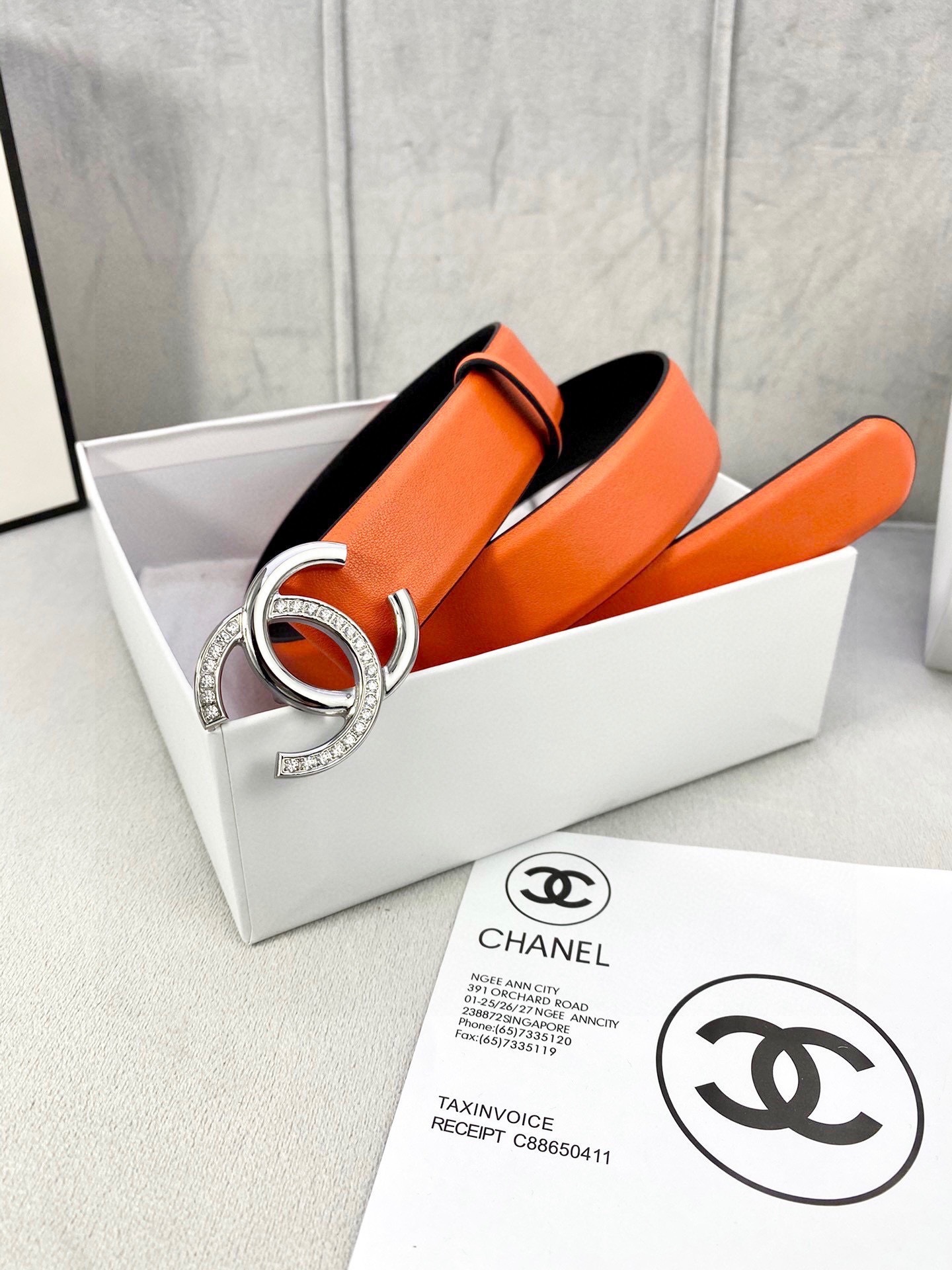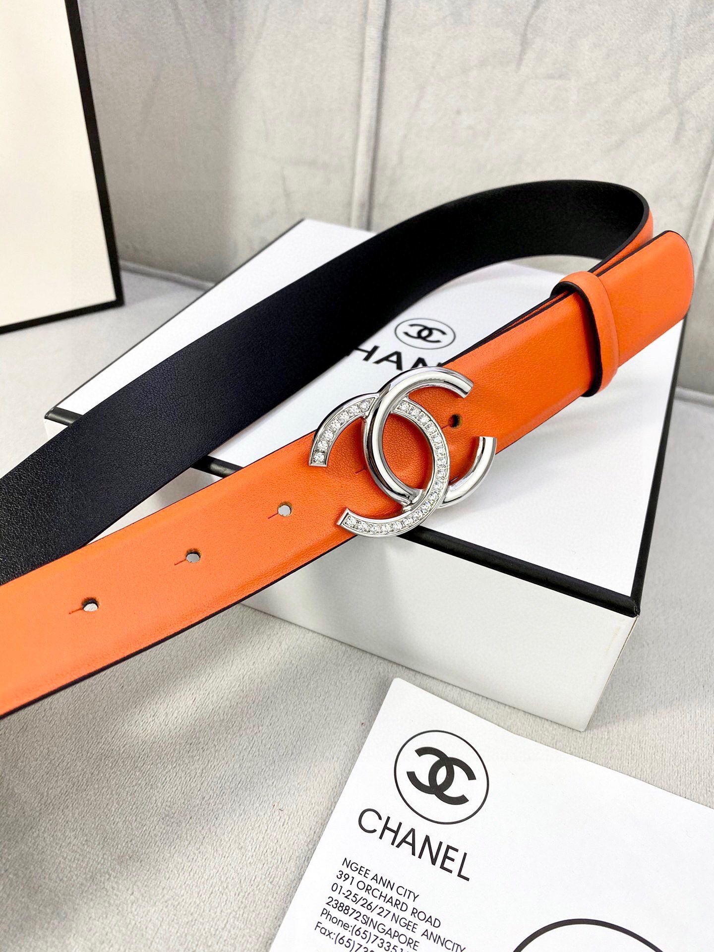Step into the spotlight with an accessory that defines luxury. Order your Crystal CC Orange Leather Belt today and redefine your signature style!