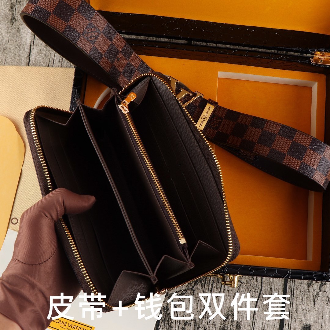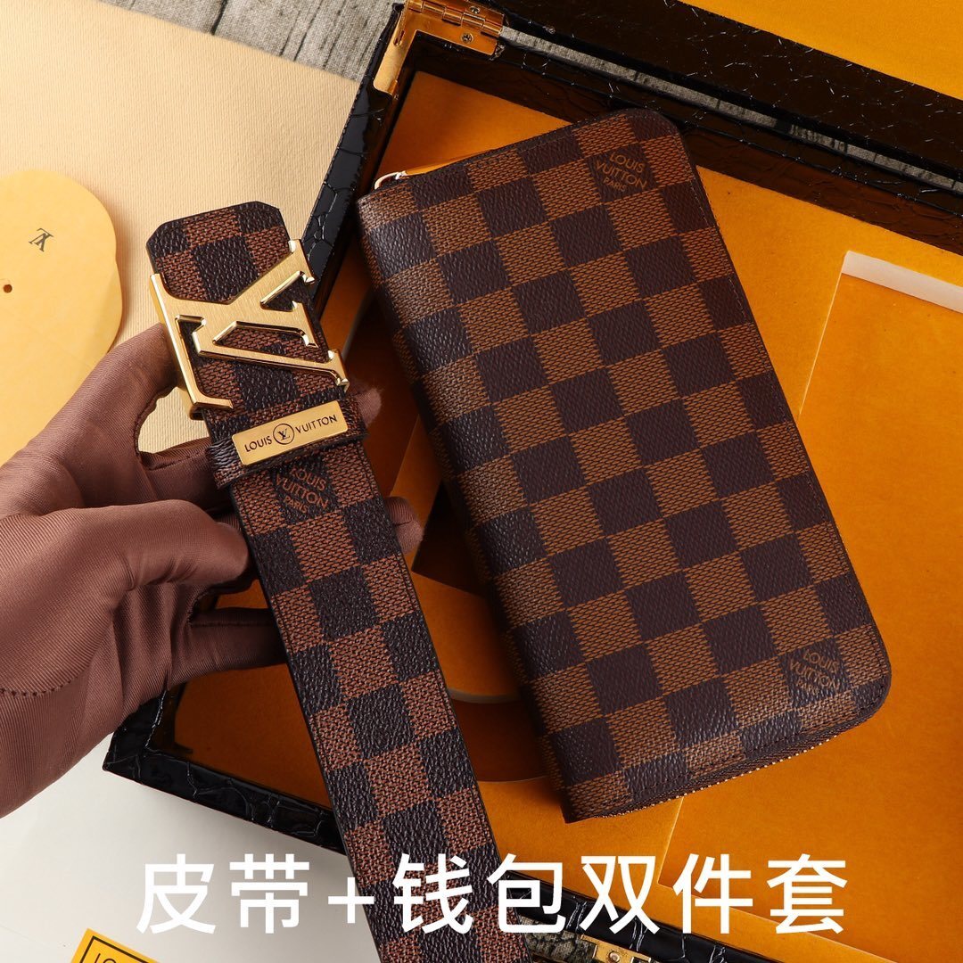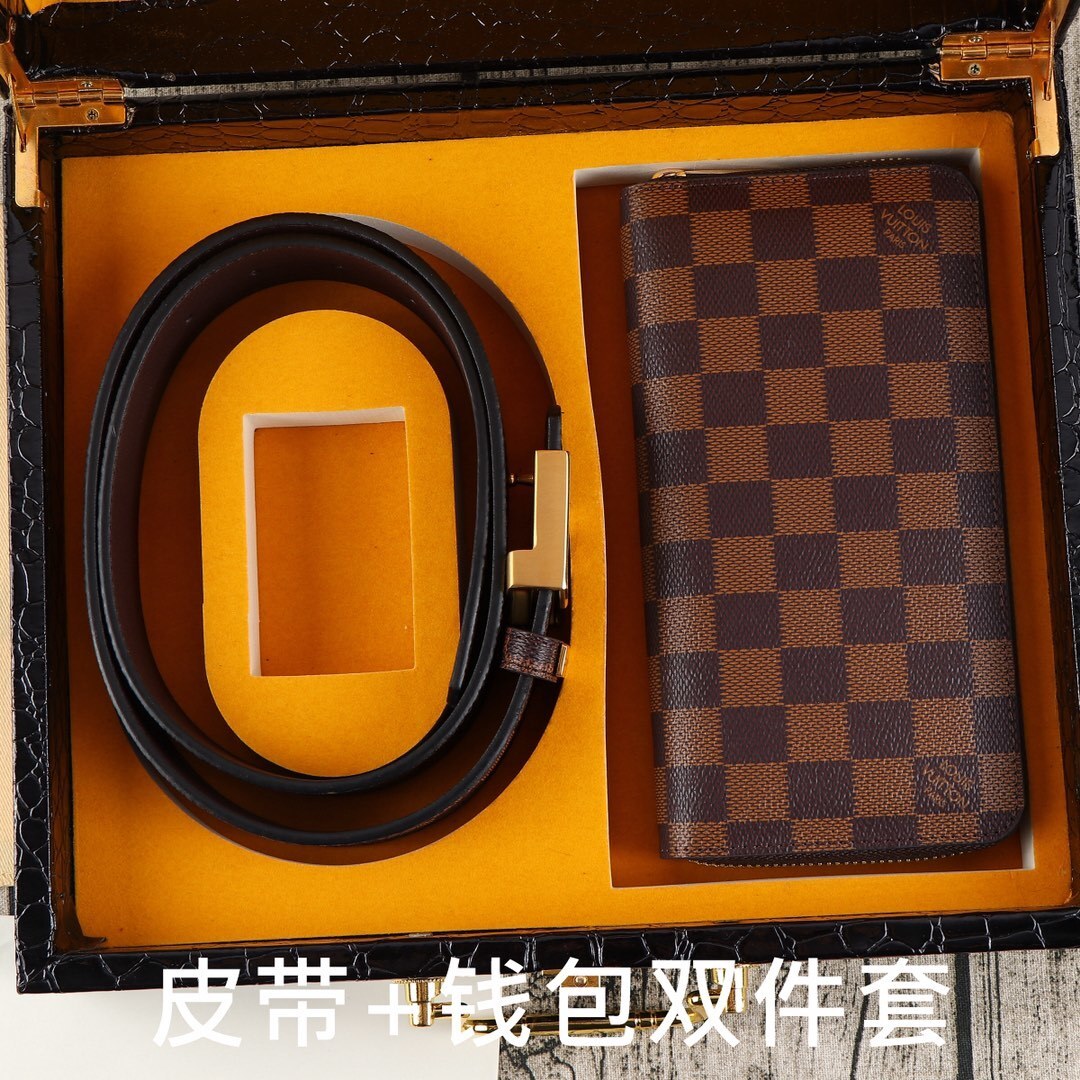Make a bold statement with this premium LV Damier Ebene Gift Set. This sophisticated duo combines a classic leather belt with a matching long zippered wallet, both featuring the world-renowned checkered pattern that defines timeless elegance.