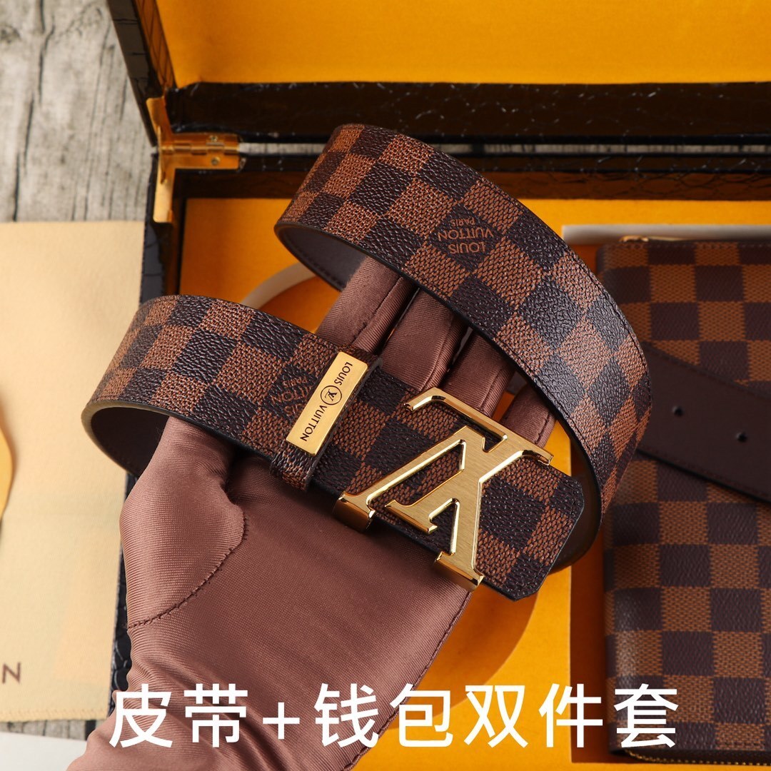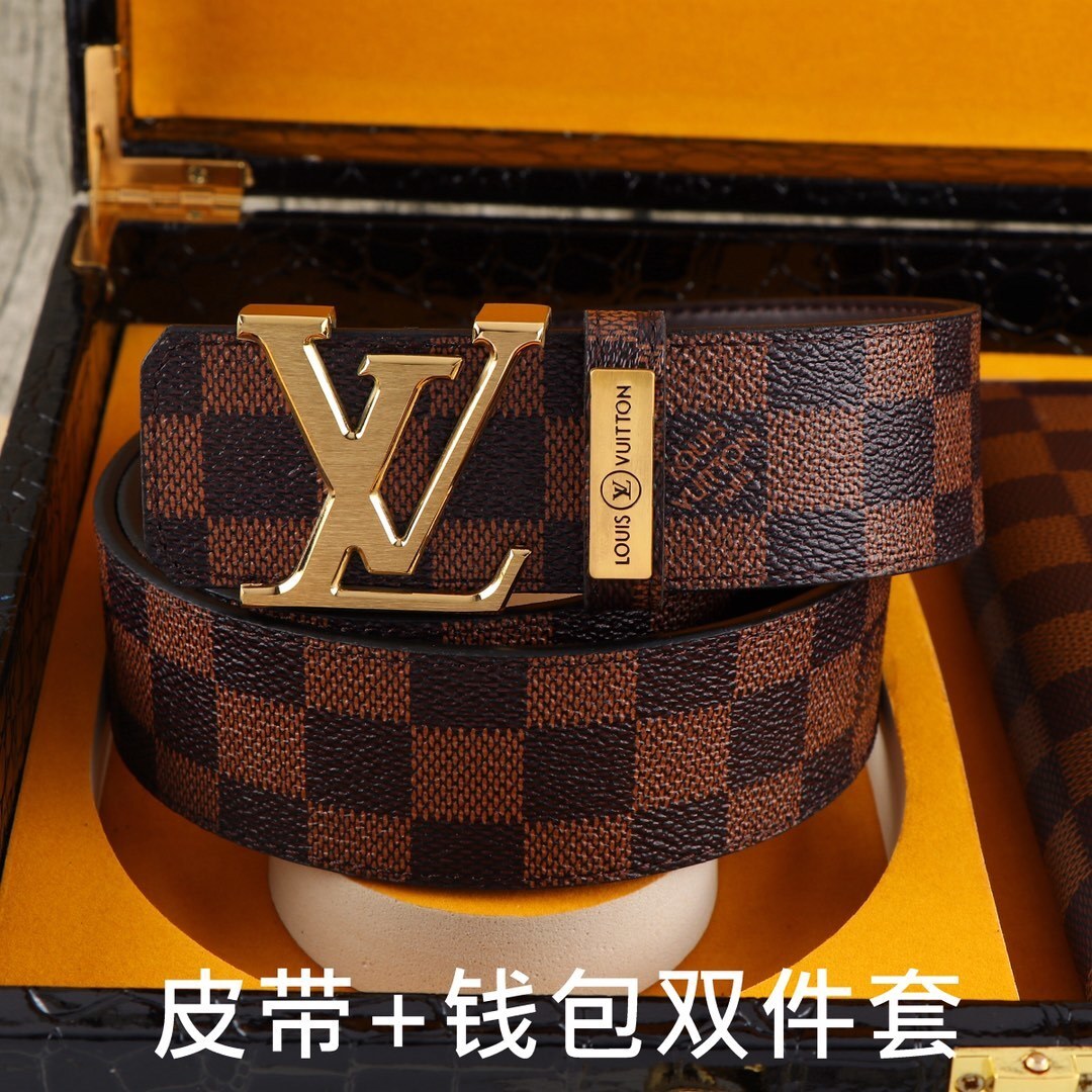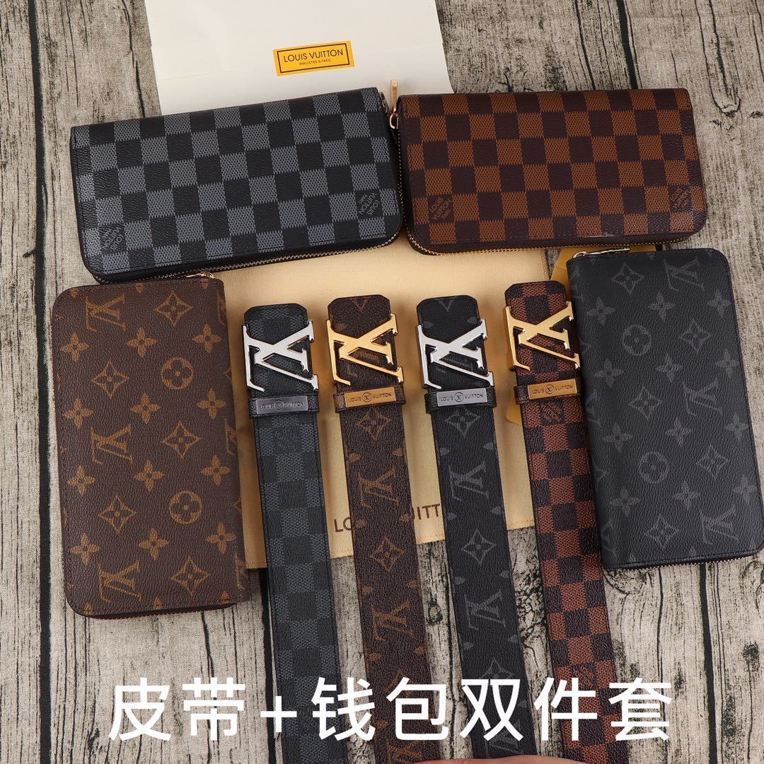 Make a bold statement with this premium LV Damier Ebene Gift Set. This sophisticated duo combines a classic leather belt with a matching long zippered wallet, both featuring the world-renowned checkered pattern that defines timeless elegance.