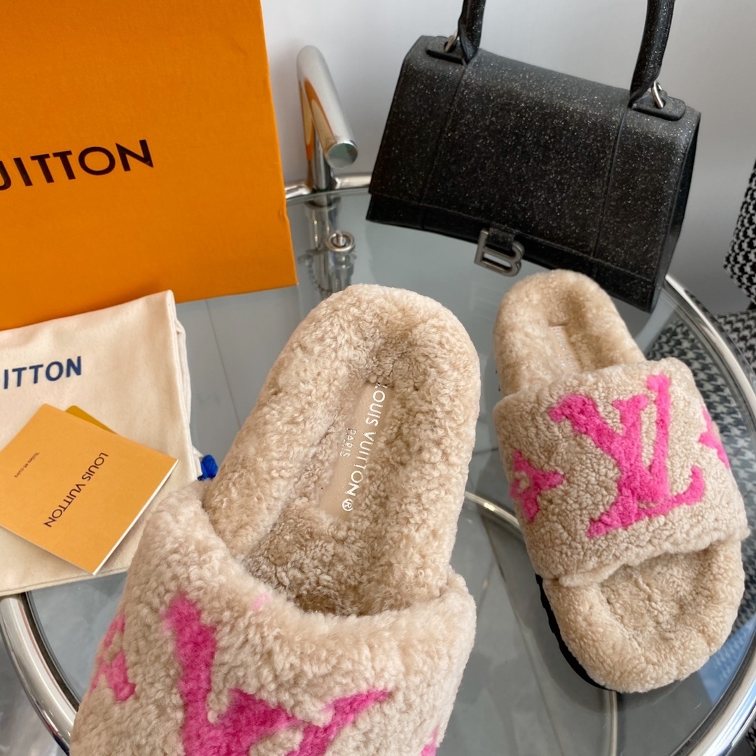 LV Pink Logo Shearling Slides - Luxury Cozy Designer Sandals