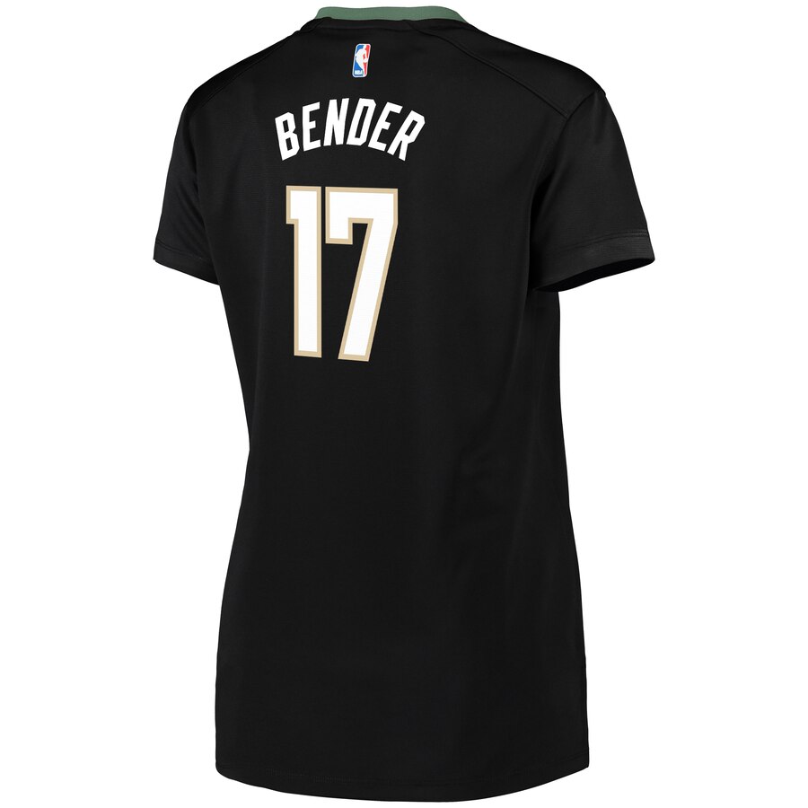 On the back, Bender's name arches above the large number 17, both rendered in striking white lettering with a subtle gold outline, mirroring the official team aesthetics. The V-neck collar and armholes are accented with a rich green trim, adding a touch of classic Bucks color to the modern black base. Official NBA and Fanatics Branded logos are strategically placed, affirming its authenticity.
