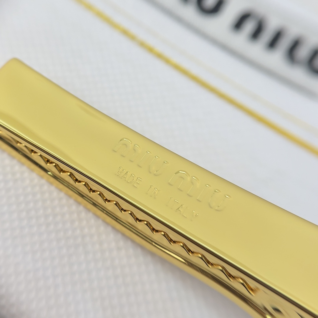 • Elegant Design: Features a sleek gold-tone finish with a white enamel inlay and the iconic logo, inspired by Miu Miu.