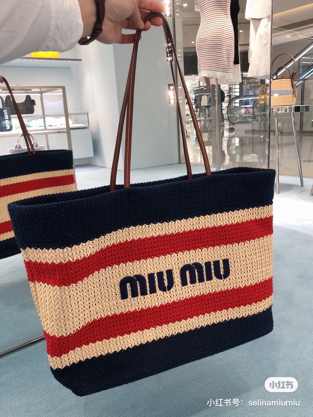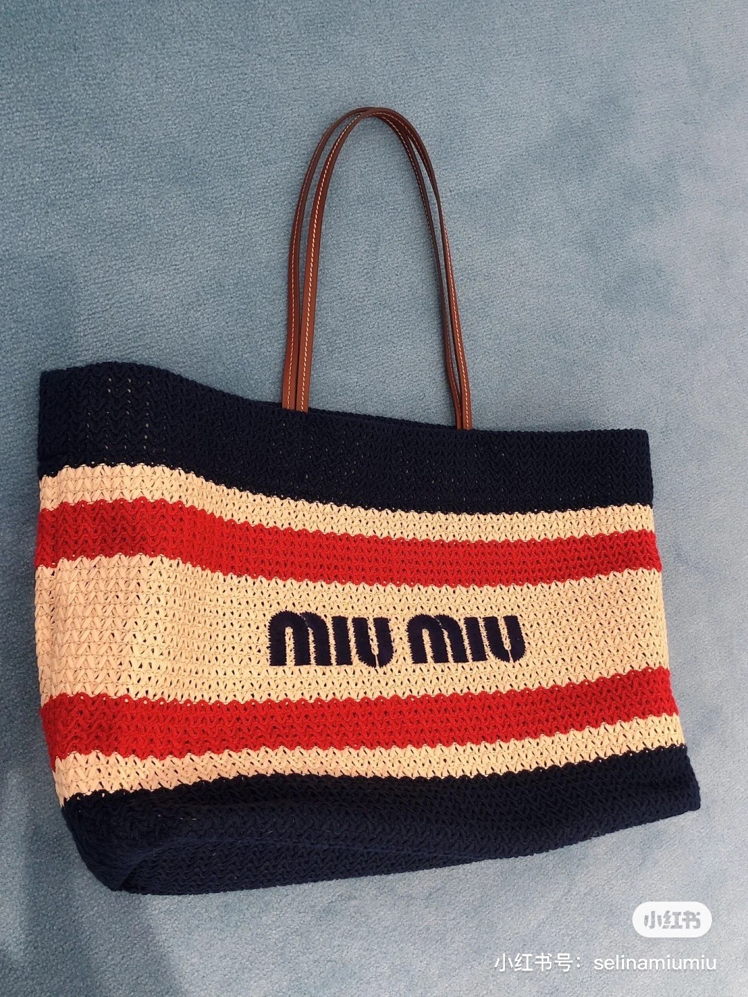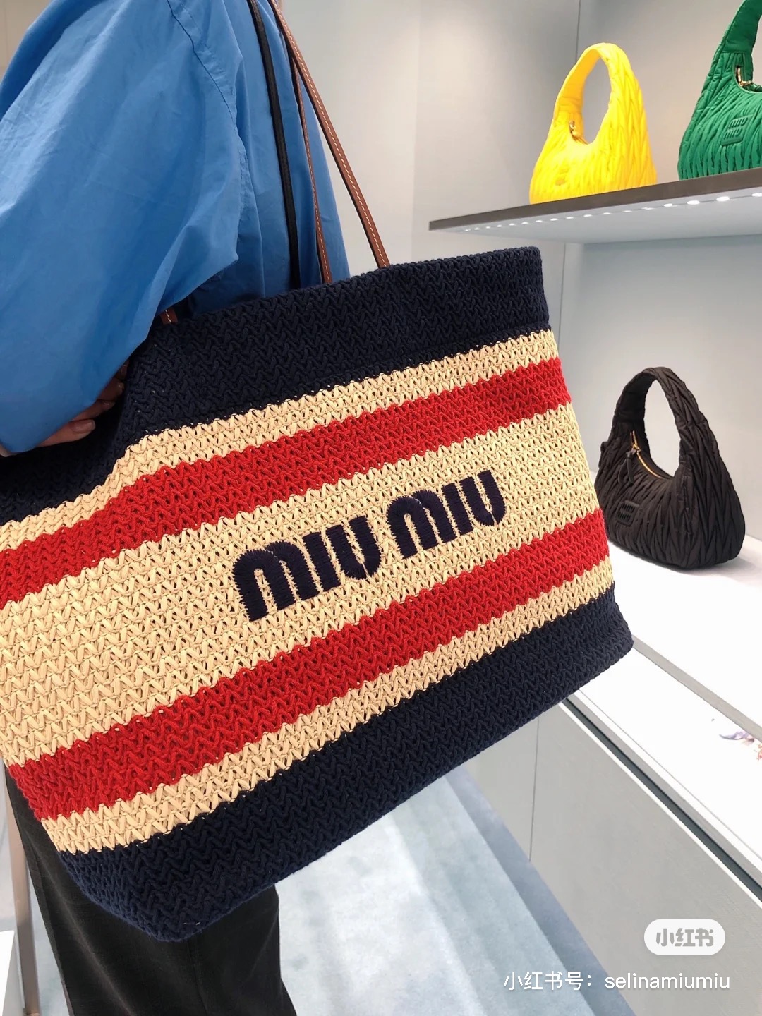Miu Miu Natural/blue Raffia-effect Woven Tote Bag | Miu Miu