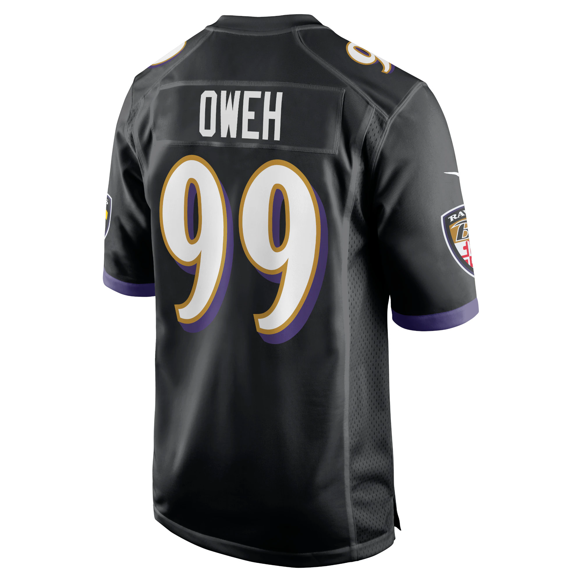 Rep the on-field look of your favorite Baltimore Ravens player with this Odafe Oweh Game jersey from Nike. Its heat-sealed name, numbers and team details provide a kickoff-ready aesthetic while also offering a comfortable, lightweight feel. Designed for everyday movement, this jersey has a versatile tailored fit and features mesh side panels for added ventilation as you celebrate every big play by the Baltimore Ravens this season.