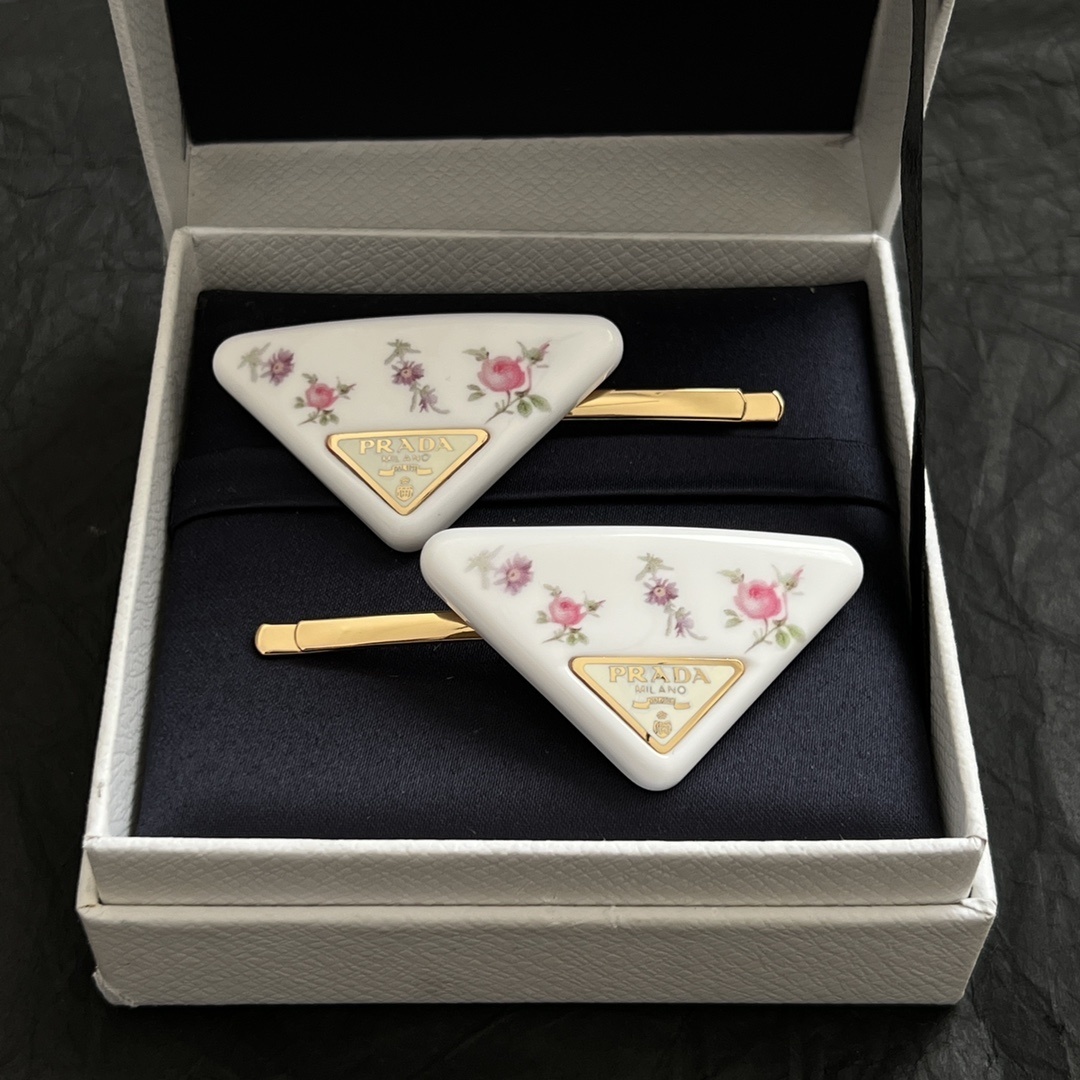 These hair clips feature a unique triangular shape adorned with a delicate floral pattern. The combination of the classic Prada logo and the intricate floral design creates a timeless and luxurious aesthetic. The clips are made from high-quality materials, ensuring durability and long-lasting beauty.
