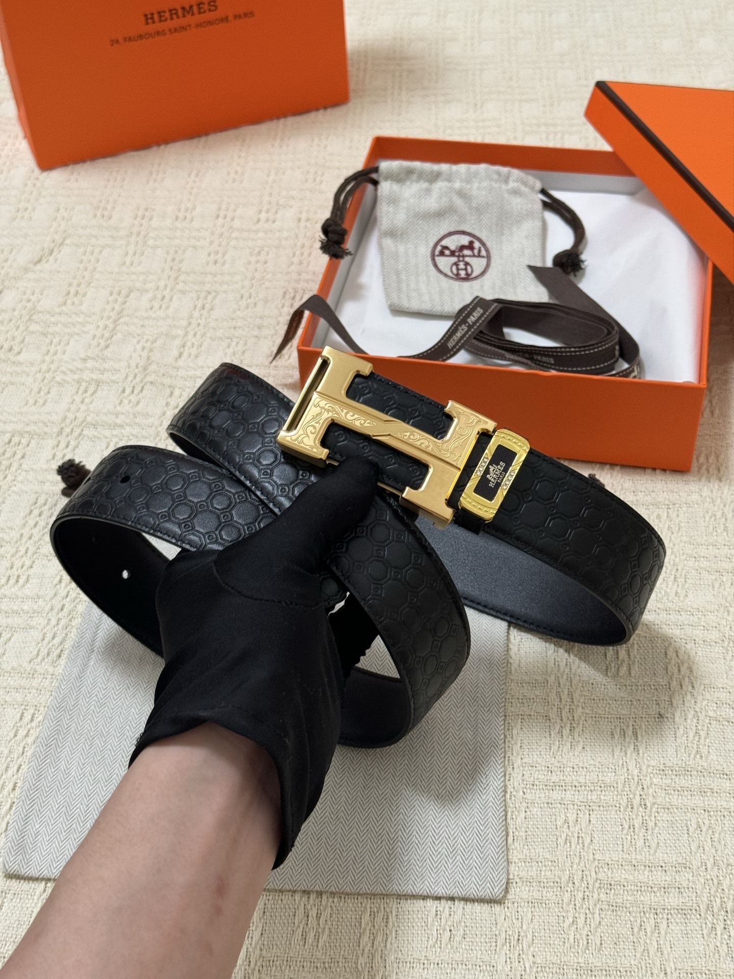 • Detailed Gold-Tone Buckle: Featuring a signature 'H' design, the gold-tone buckle is enhanced with intricate relief engravings and black enamel accents, showcasing superior artistry.